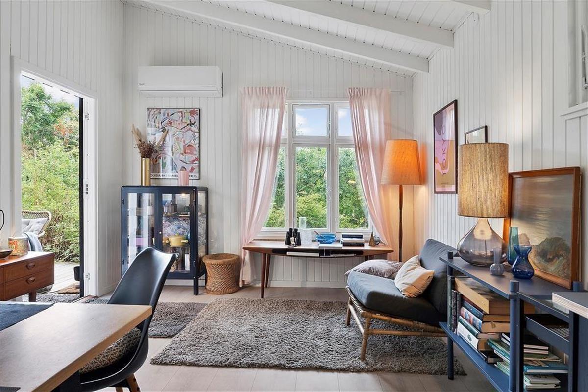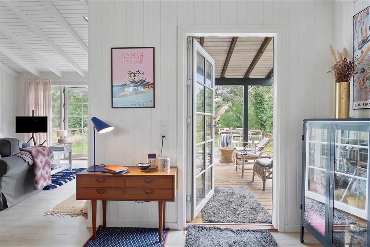 Die Küche ist gut ausgestattet mit Geschirr und Utensilien für die meisten Zwecke. Wer Ruhe zum Lesen, Tagebuchschreiben oder für Online-Arbeit sucht, kann sich in ein Zimmer mit Schreibtisch zurückziehen. Das Haus bietet sechs Schlafplätze, davon zwei in einem ruhigen Annex. Das Wohnzimmer verfügt über einen neuen Kaminofen und direkten Zugang zu einer großen Holzterrasse mit Blick auf den Garten. Ein Teil der Terrasse ist überdacht und bietet Schutz, wenn der Tau fällt oder die Sonne zu stark scheint. Im nahegelegenen Pillemark können Sie neue Samsø-Kartoffeln und frisch gepflückte Erdbeeren kaufen – perfekt für das Abendessen auf der Terrasse. Gegrillte Speisen lassen sich hier zusammen mit einem Glas kühlen Weißwein in der Abendsonne genießen – in ruhiger, idyllischer Umgebung.