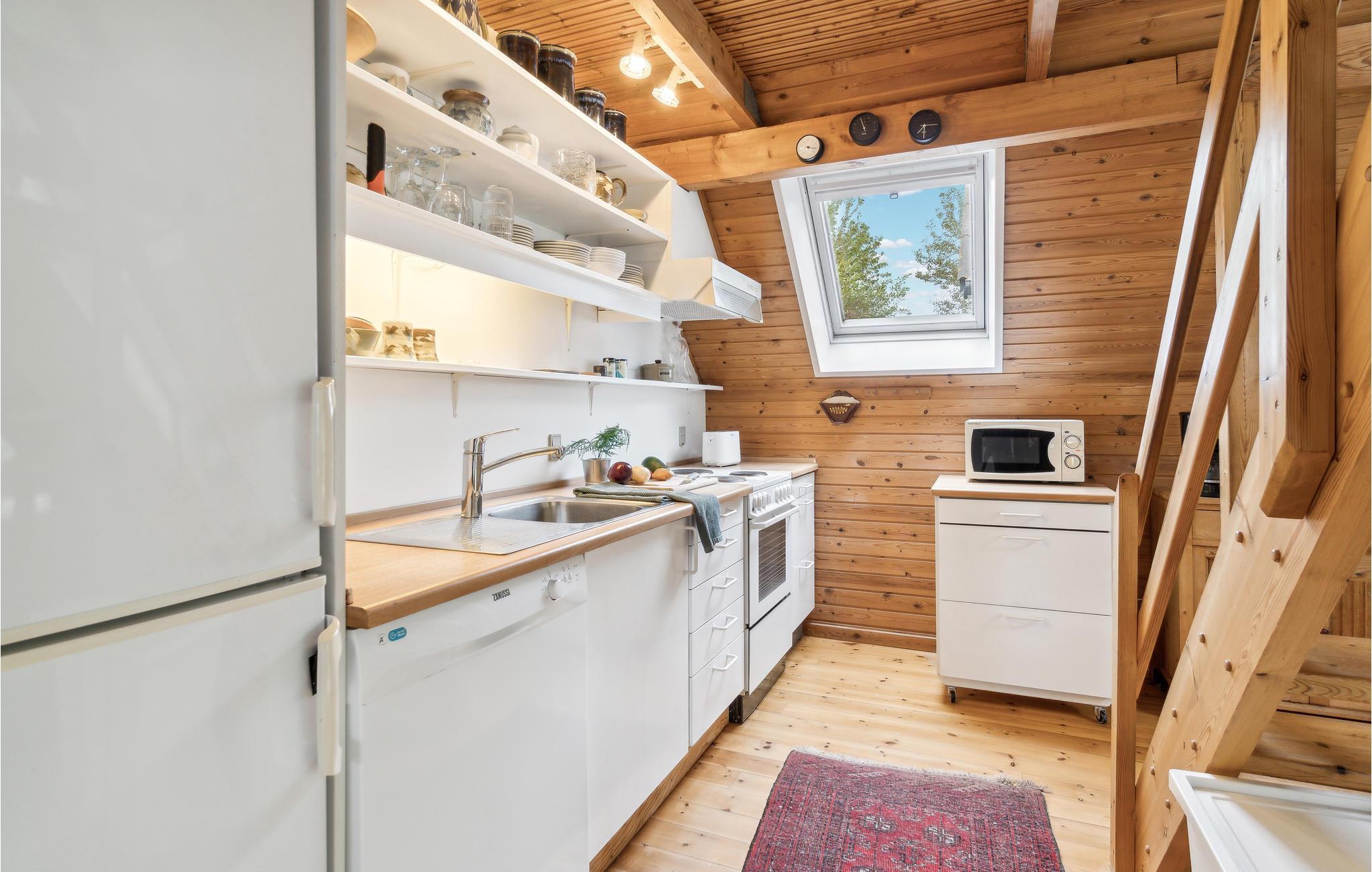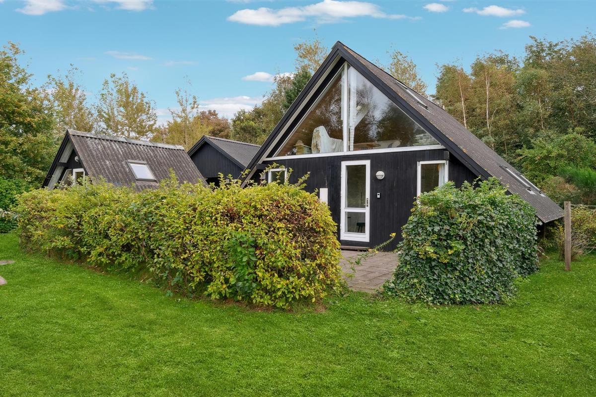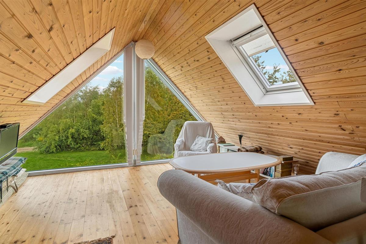 Gezellig vakantiehuis op Samsø met houten lambrisering en uitzicht op een privétuin.