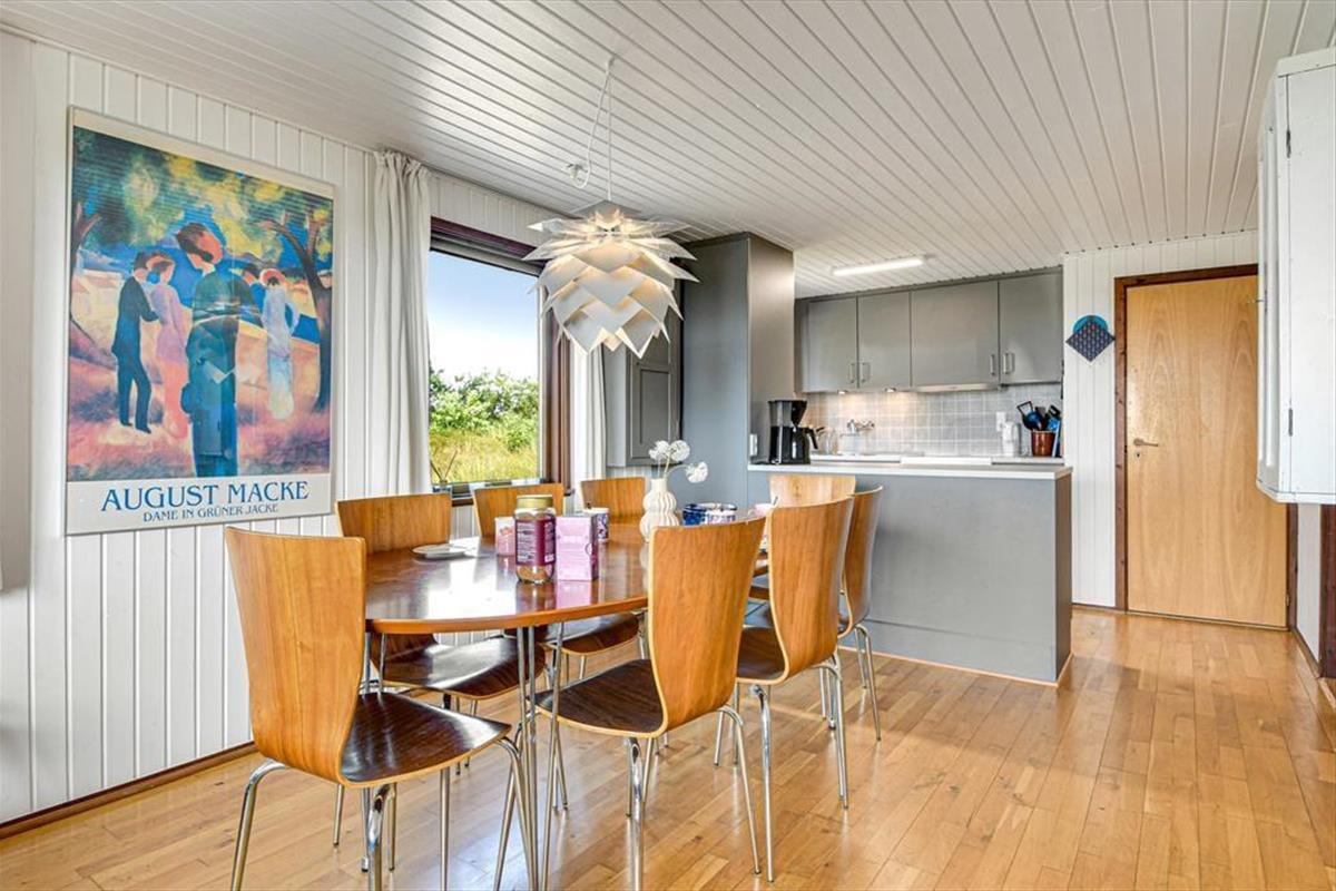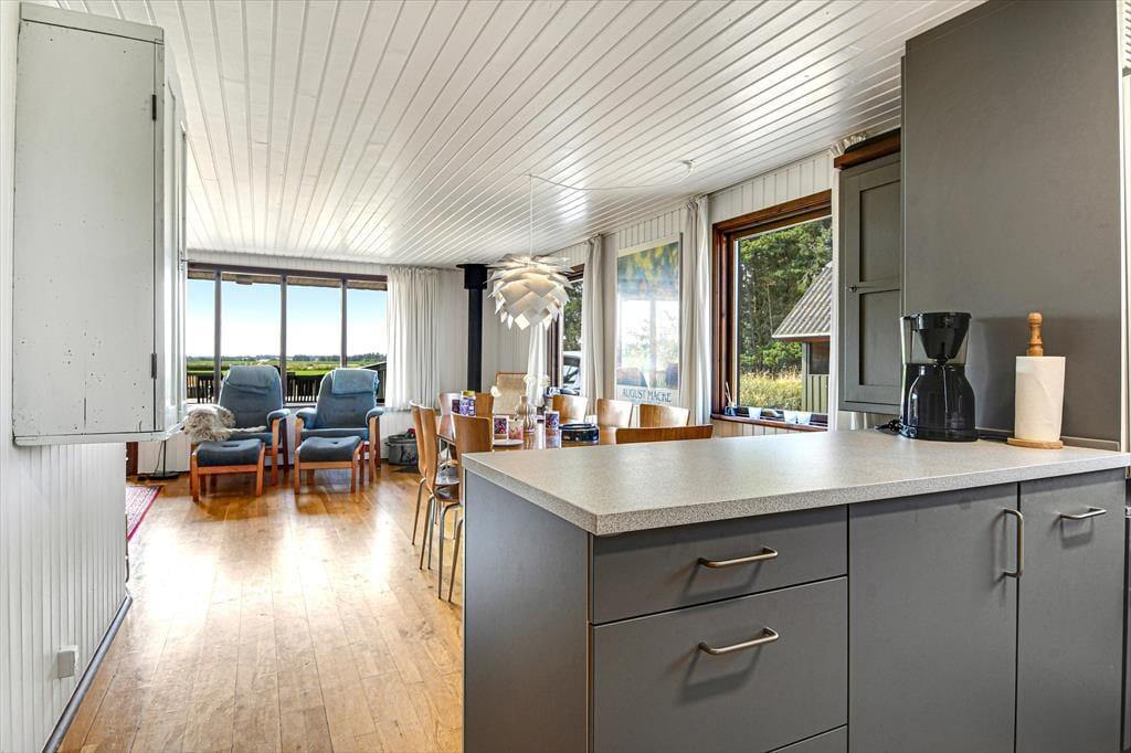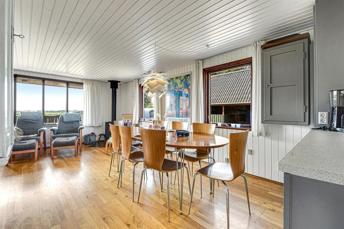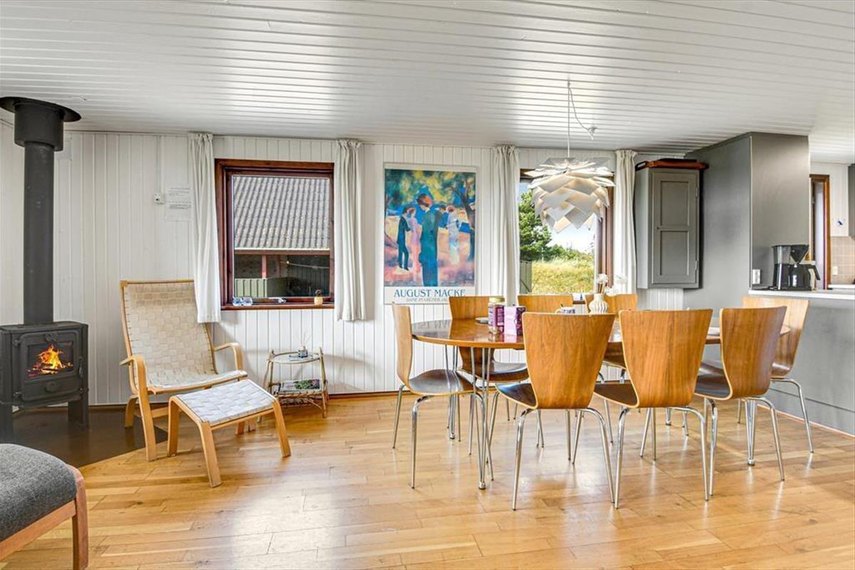 Diese klassische, ältere Holzimmobilie fügt sich mit ihrer dunkelgrünen Fassade wunderbar in die naturschöne Umgebung ein. Der Wohnraum ist hell mit weiß gestrichenen Wänden und der Kaminofen im Wohnzimmer gehört zu den klassischen Details. Die südliche Fensterfront im Wohnzimmer bietet dir und deinen Lieben eine wunderbare Aussicht auf die offene Landschaft, während ihr es euch in der Sofaecke gemütlich macht oder ein gutes Essen am Esstisch teilt. Die Küche ist offen mit dem Wohnzimmer verbunden und die drei Schlafzimmer bieten für sechs Personen gemütliche Schlafplätze. Das Badezimmer des Ferienhauses ist mit Fußbodenheizung, einer Dusche und sogar einer Sauna ausgestattet, sodass du dich nach einem Bad im Meer oder anderen Outdoor-Aktivitäten schön aufwärmen kannst.
