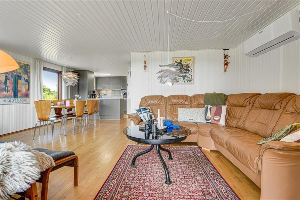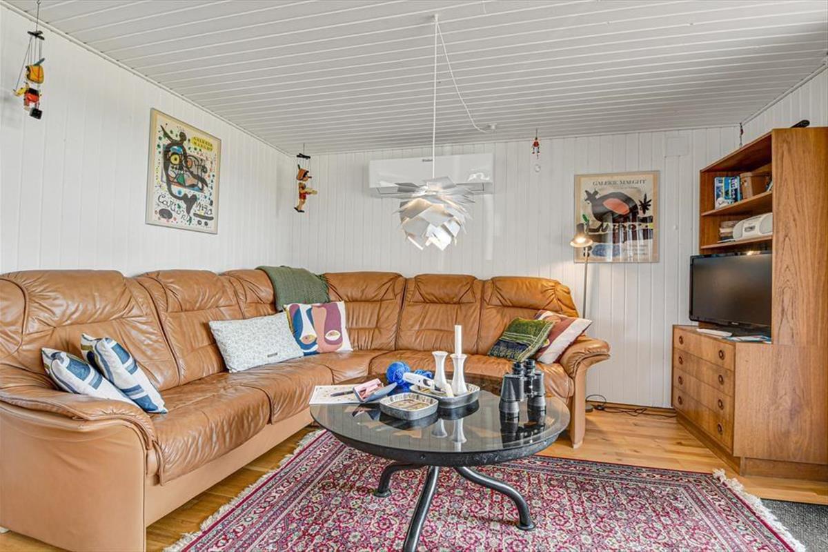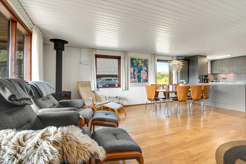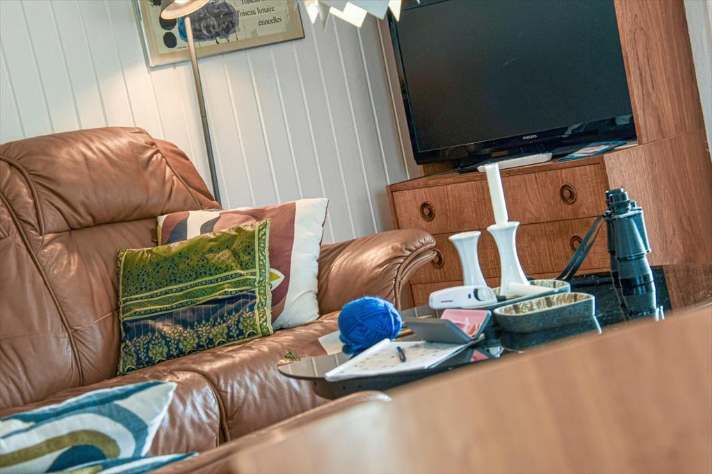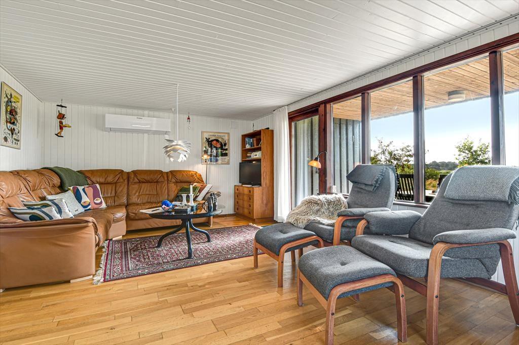 Diese klassische, ältere Holzimmobilie fügt sich mit ihrer dunkelgrünen Fassade wunderbar in die naturschöne Umgebung ein. Der Wohnraum ist hell mit weiß gestrichenen Wänden und der Kaminofen im Wohnzimmer gehört zu den klassischen Details. Die südliche Fensterfront im Wohnzimmer bietet dir und deinen Lieben eine wunderbare Aussicht auf die offene Landschaft, während ihr es euch in der Sofaecke gemütlich macht oder ein gutes Essen am Esstisch teilt. Die Küche ist offen mit dem Wohnzimmer verbunden und die drei Schlafzimmer bieten für sechs Personen gemütliche Schlafplätze. Das Badezimmer des Ferienhauses ist mit Fußbodenheizung, einer Dusche und sogar einer Sauna ausgestattet, sodass du dich nach einem Bad im Meer oder anderen Outdoor-Aktivitäten schön aufwärmen kannst.