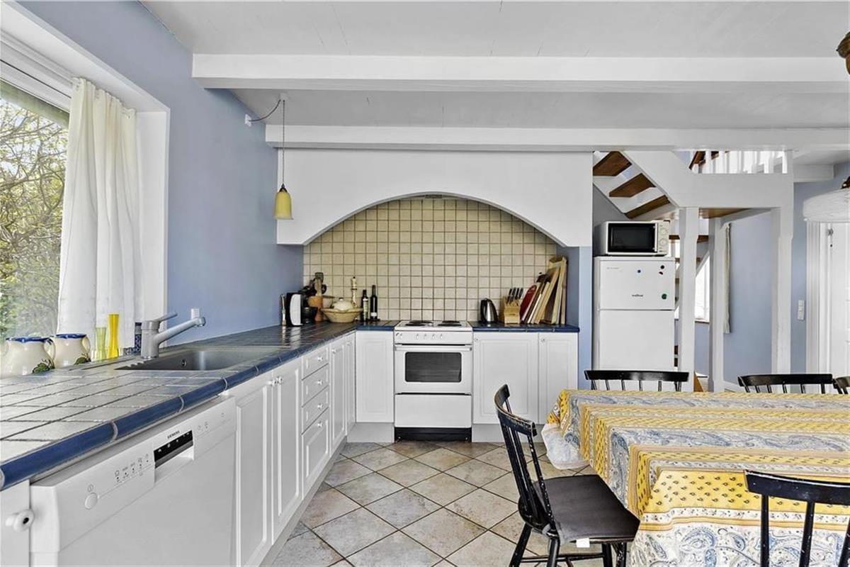Das Wohnzimmer ist mit der offenen Küche kombiniert. Große helle Küche mit Herd, Mikrowelle, Geschirrspüler, Kühl- Gefrierschrank und Essplatz. Geschmackvoll eingerichtetes Wohnzimmer mit älteren Möbeln und gemütlichem Sofa, Ausgang zur Terrasse, Holzofen und TV (DK). Schönes Badezimmer mit Fußbodenheizung, Duschnische, Badewanne und Waschmaschine. 2 Schlafzimmer, eins mit Doppelbett, und eins mit zwei Einzelbetten. Außerdem gibt es ein Kinderbett und einen Hochstuhl. Im Wohnzimmer sind noch zwei Schlafplätze auf einem Doppelschlafsofa. Elektrische Heizung und Holzofen.