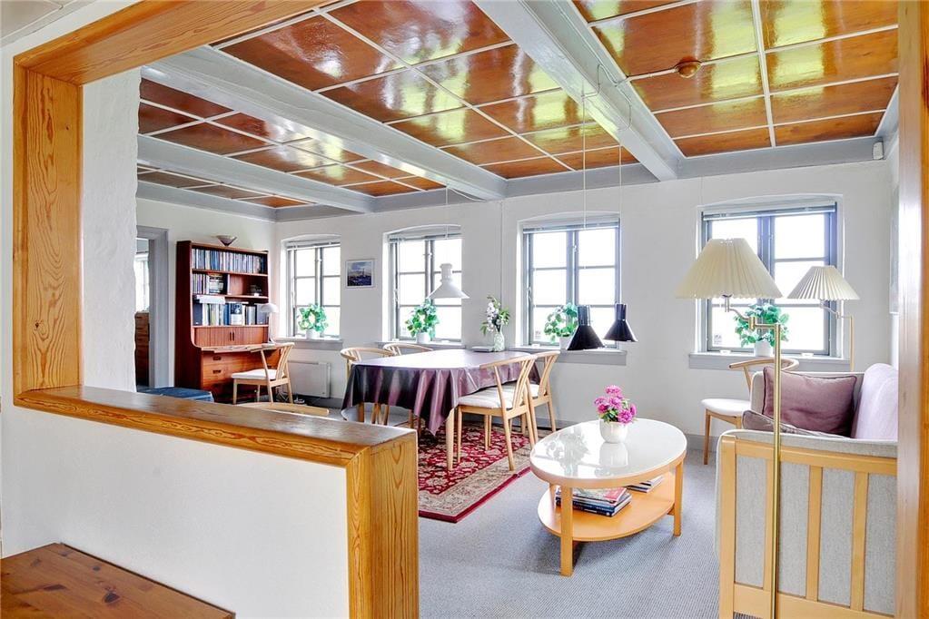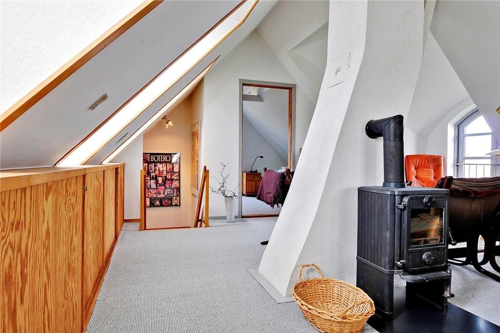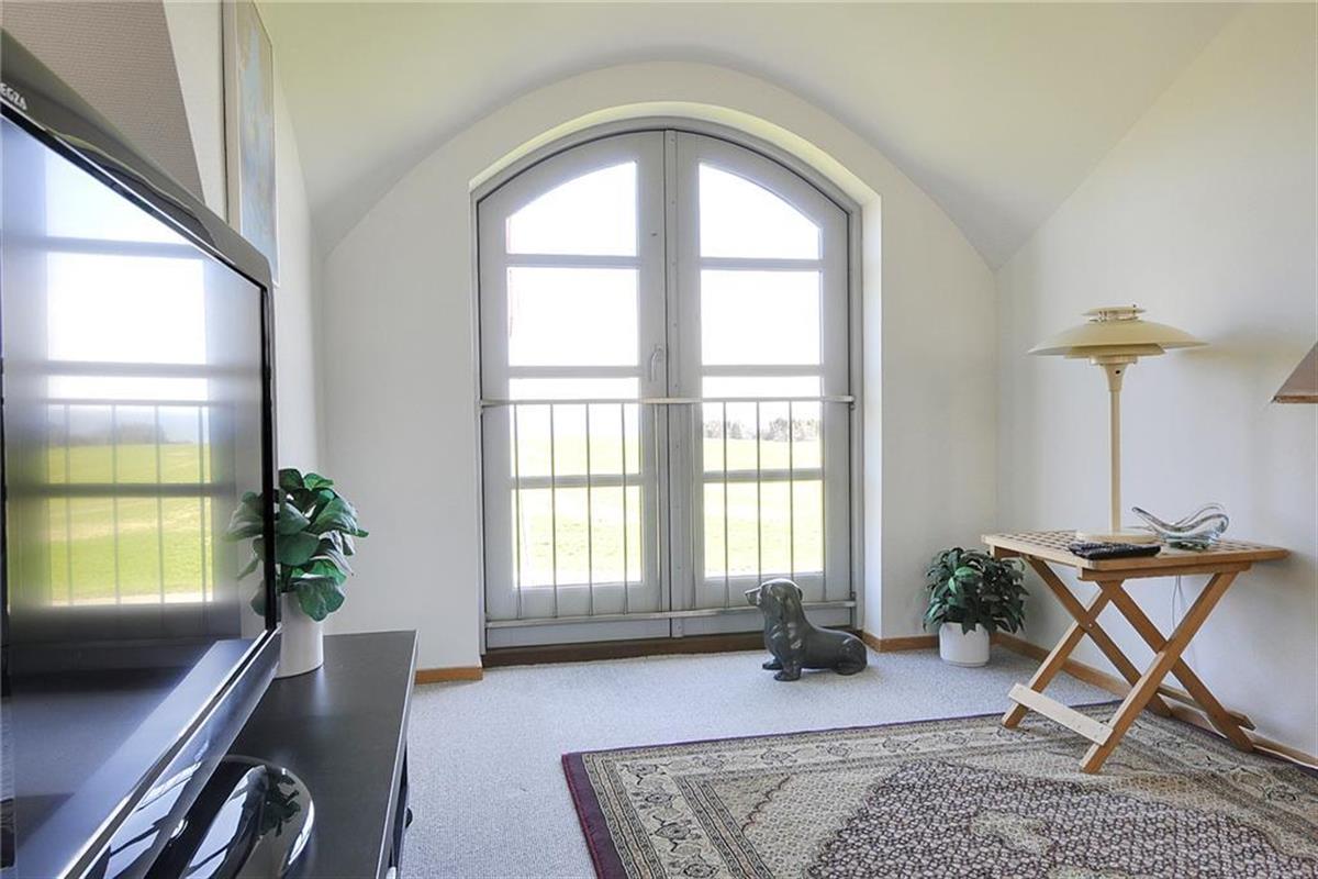 Erster Stock: Helles Wohnzimmer mit Dacherker, schrägen Wänden, sichtbaren Deckenbalken, Kaminofen und großartiger Aussicht über die Ostsee.