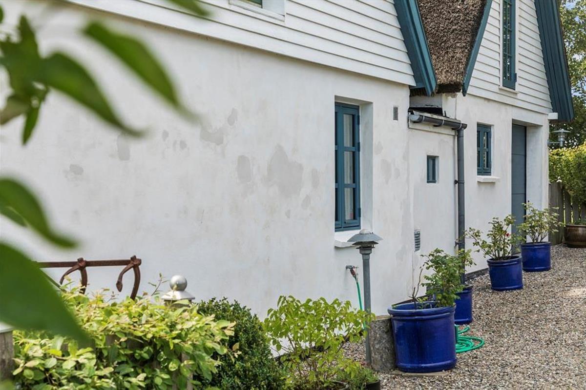 Sonnenreicher Garten mit Meerblick und vielen gemütlichen Ecken, Terrasse mit Gartenmöbeln, Liegestühlen und Sonnenschirm.