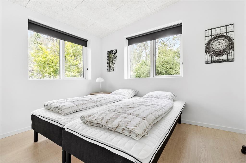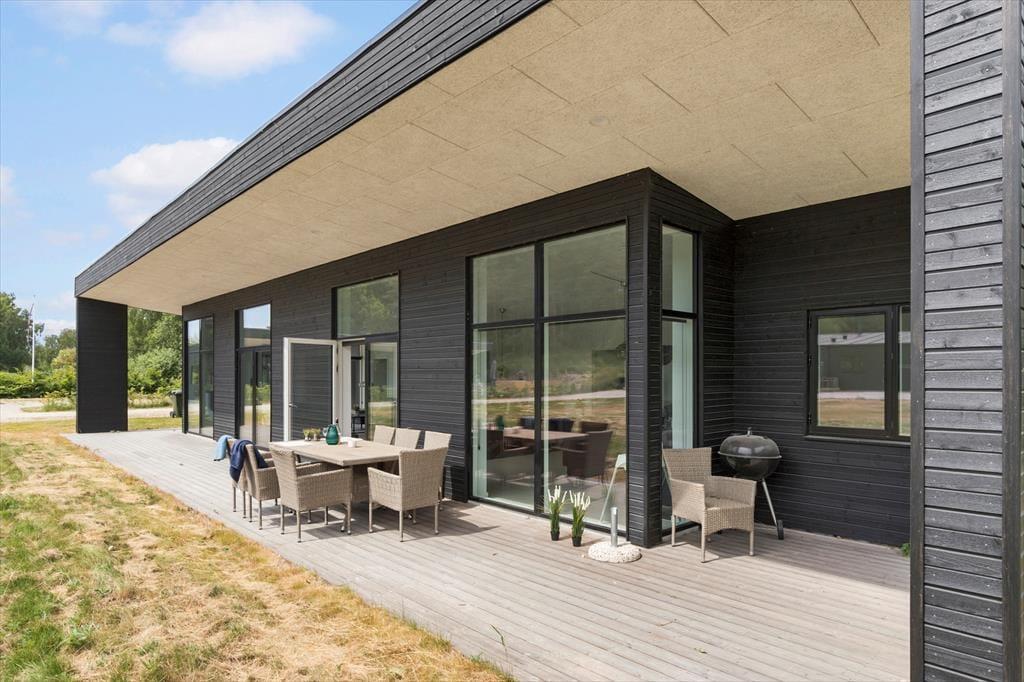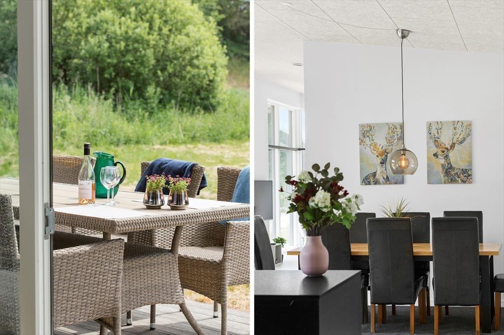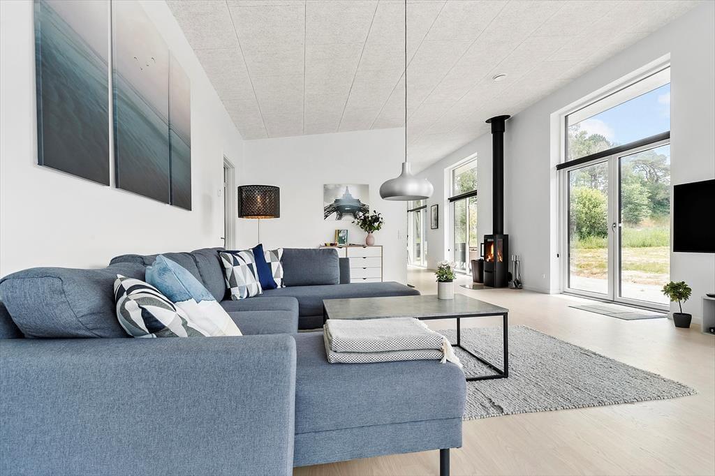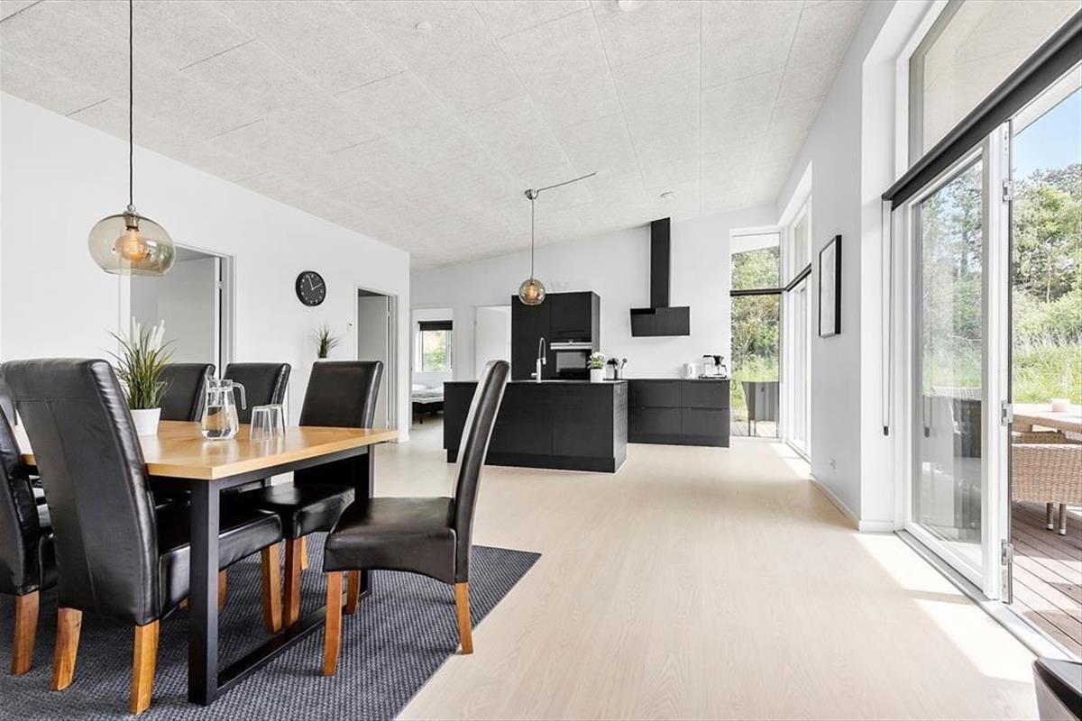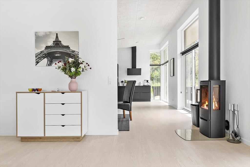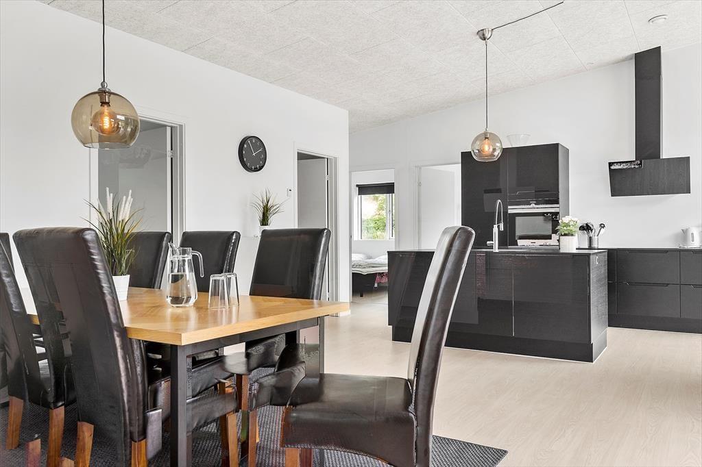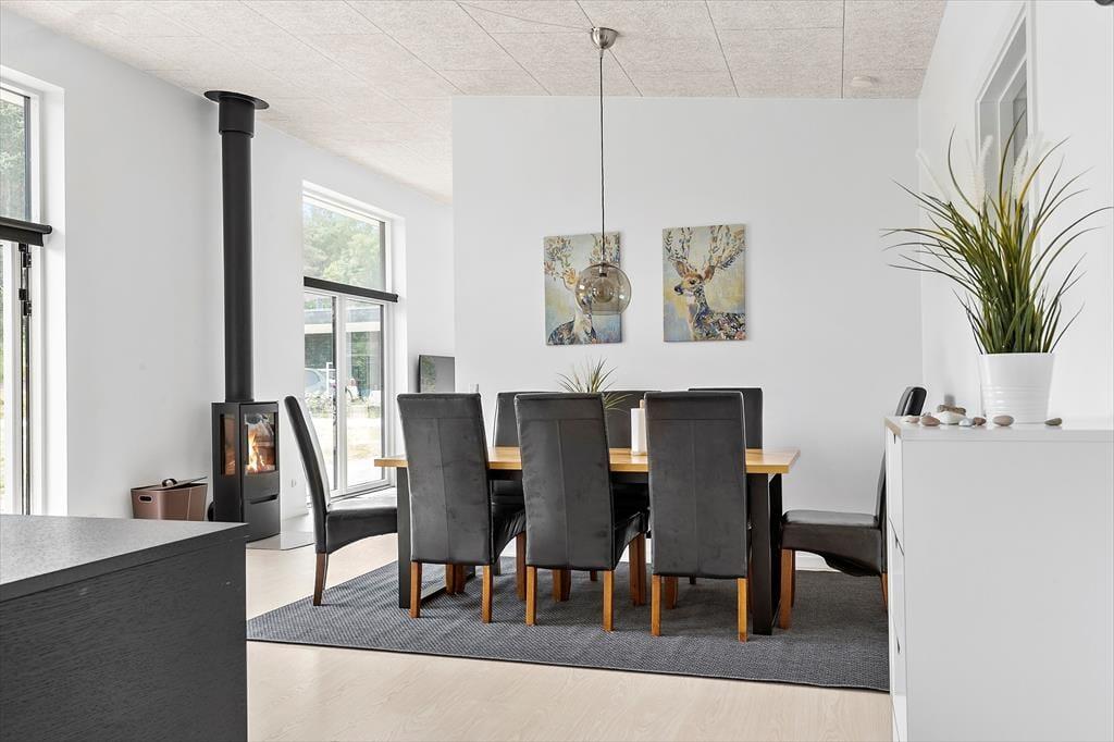 Nicht weit von der Stadt Ebeltoft entfernt befindet sich dieses schöne, neuere Ferienhaus. Das Wohnzimmer strahlt Helligkeit und Großzügigkeit aus, mit bequemen Möbeln und einem gemütlichen Kaminofen – perfekt für entspannte Stunden nach einem erlebnisreichen Tag. Von hier aus gelangst du direkt auf eine überdachte Terrasse, auf der du deinen Morgenkaffee in Ruhe genießen kannst. Die stilvolle, gut ausgestattete Küche ist offen zum Wohnzimmer hin gestaltet und verfügt über alles, was du brauchst – von Geschirrspüler bis hin zum Einbauofen. Das Haus bietet zwei elegante Badezimmer: Eines mit Duschkabine, Whirlpool und Zugang zur Sauna, das andere mit Duschkabine sowie Waschmaschine und Trockner. Die vier großen Schlafzimmer verfügen über Doppelbetten, die sich in Einzelbetten trennen lassen. Für die kleinsten Gäste stehen sowohl ein Hochstuhl als auch ein Kinderbett bereit.