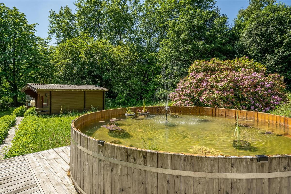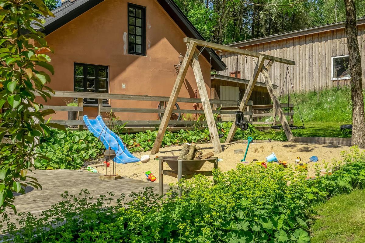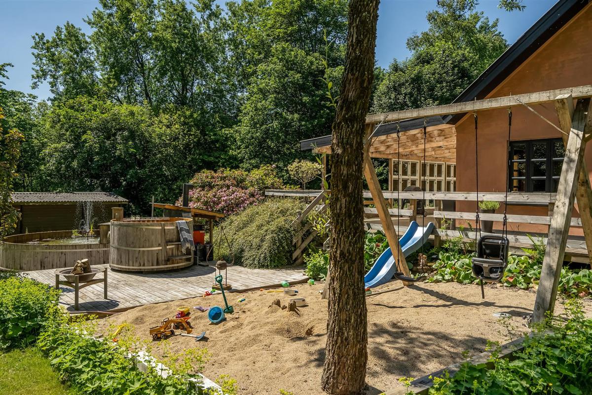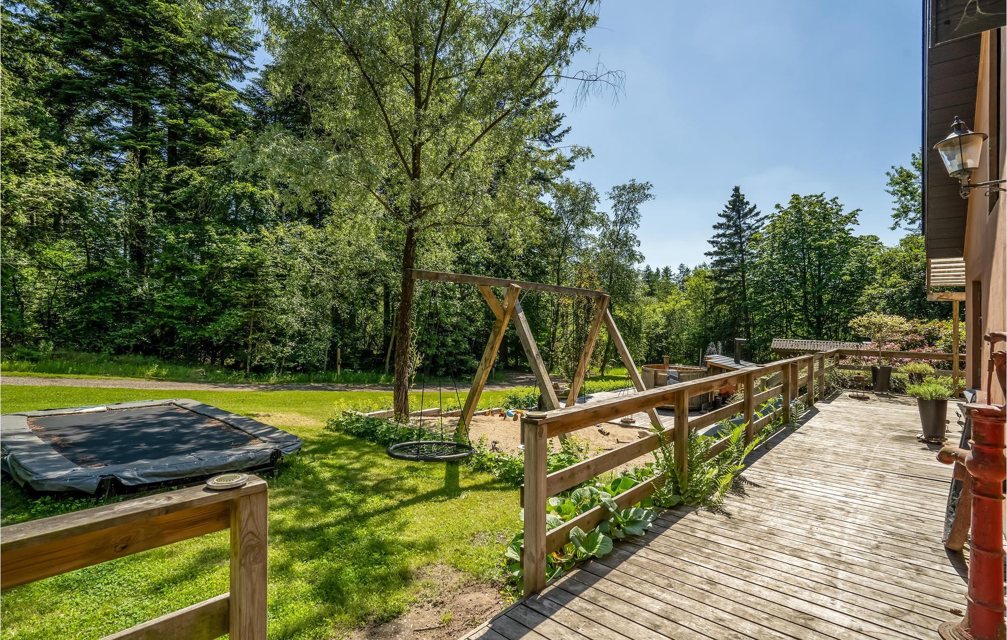 De tuin is een heerlijke oase met verschillende ruimtes en goed georganiseerde bloembedden, zodat je echt kunt genieten van de vele zonuren. Ga zitten met een koude verfrissing terwijl de kinderen spelen op de speeltoestellen en trampoline. Als je iets goeds voor jezelf wilt doen, kun je na je excursies ontspannen in het Finse houten bad, en misschien heb je het geluk om bij zonsopgang of zonsondergang de herten voorbij te zien komen. Het Finse houten bad wordt verwarmd met diesel, die je in het huis kunt kopen.