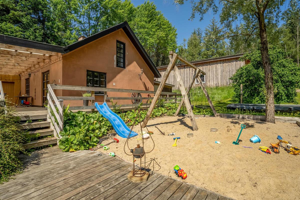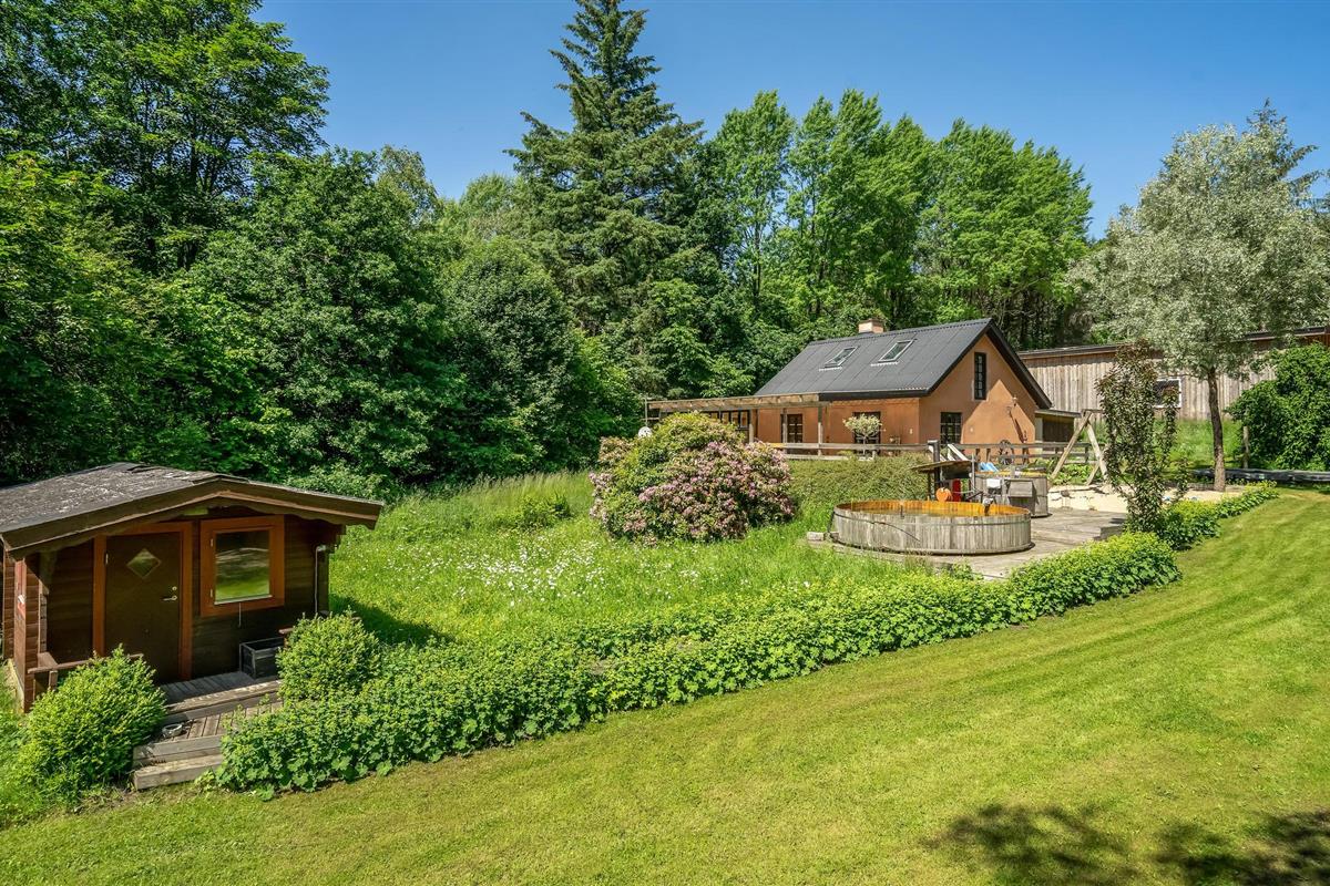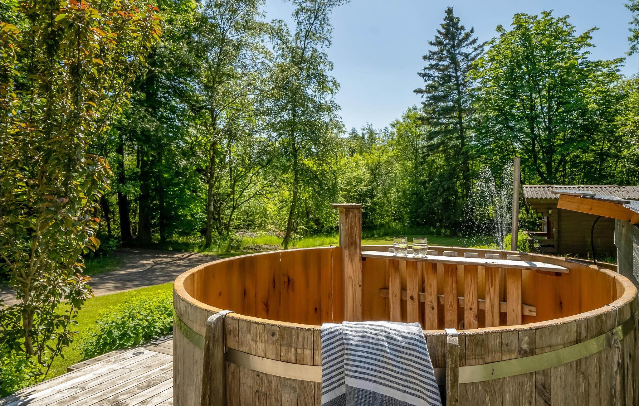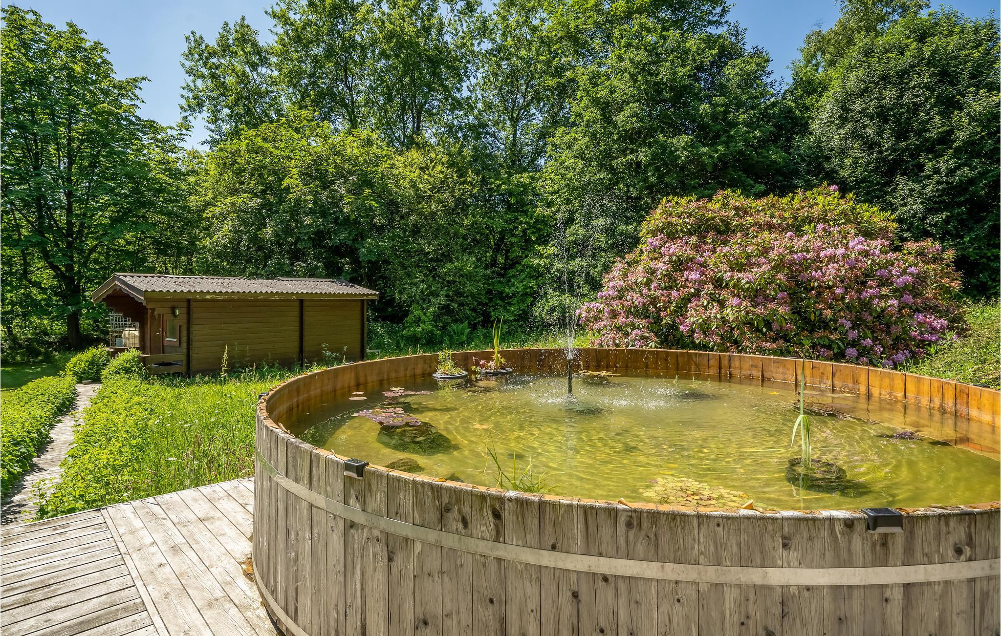 De tuin is een heerlijke oase met verschillende ruimtes en goed georganiseerde bloembedden, zodat je echt kunt genieten van de vele zonuren. Ga zitten met een koude verfrissing terwijl de kinderen spelen op de speeltoestellen en trampoline. Als je iets goeds voor jezelf wilt doen, kun je na je excursies ontspannen in het Finse houten bad, en misschien heb je het geluk om bij zonsopgang of zonsondergang de herten voorbij te zien komen. Het Finse houten bad wordt verwarmd met diesel, die je in het huis kunt kopen.