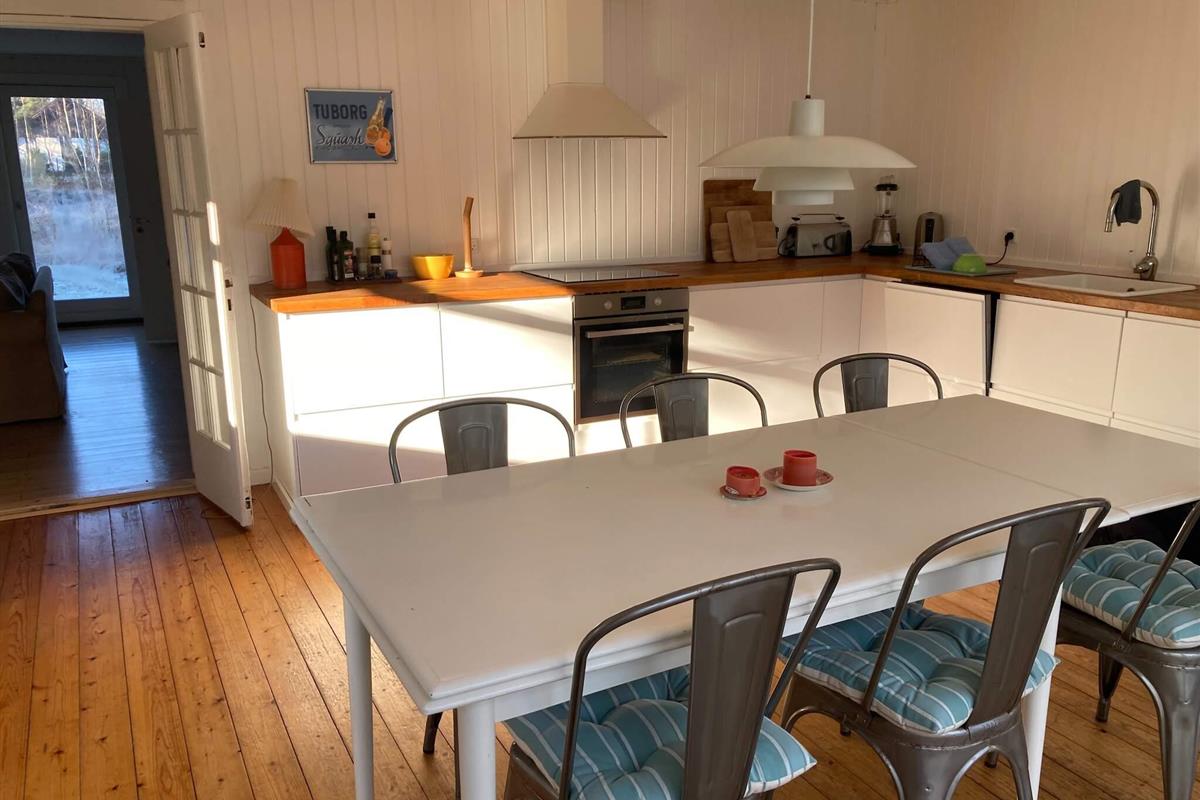 De åbne opholdsrum giver masser af naturligt lys og skaber en dejlig sammenhæng mellem køkken og stue – ideelt til både afslappende feriedage og hyggelige middage.