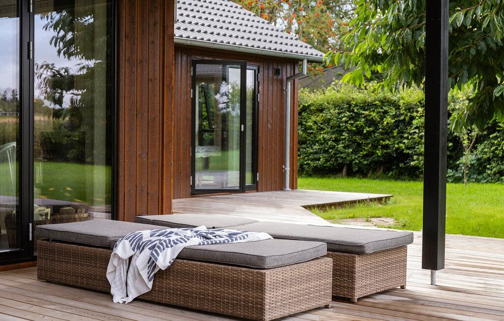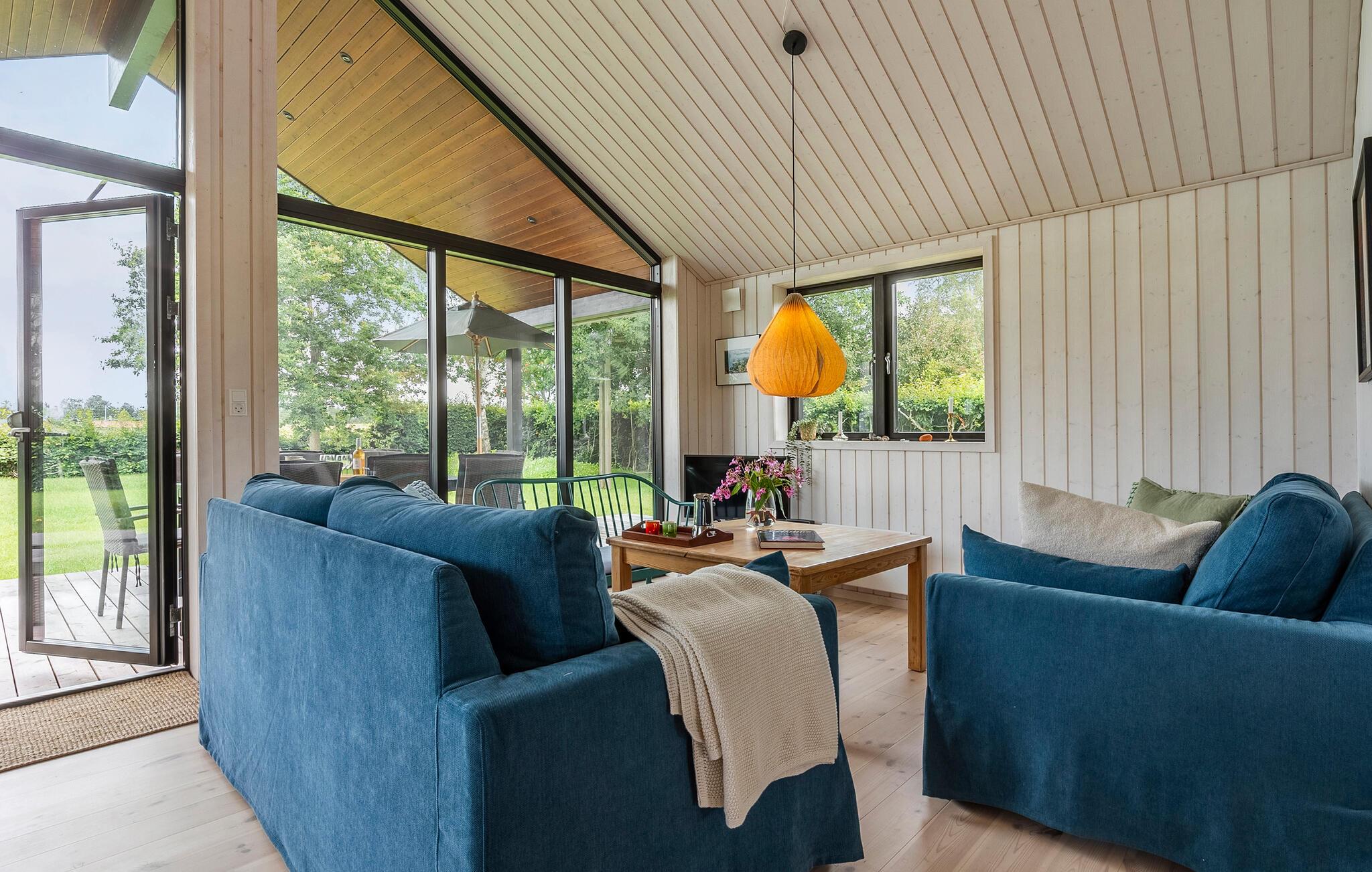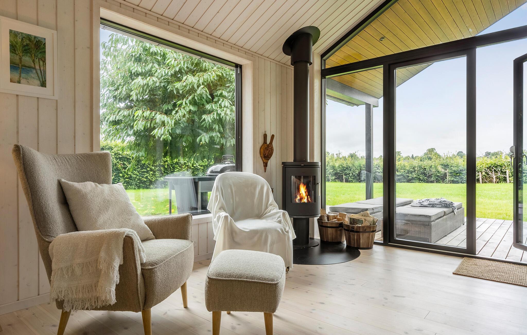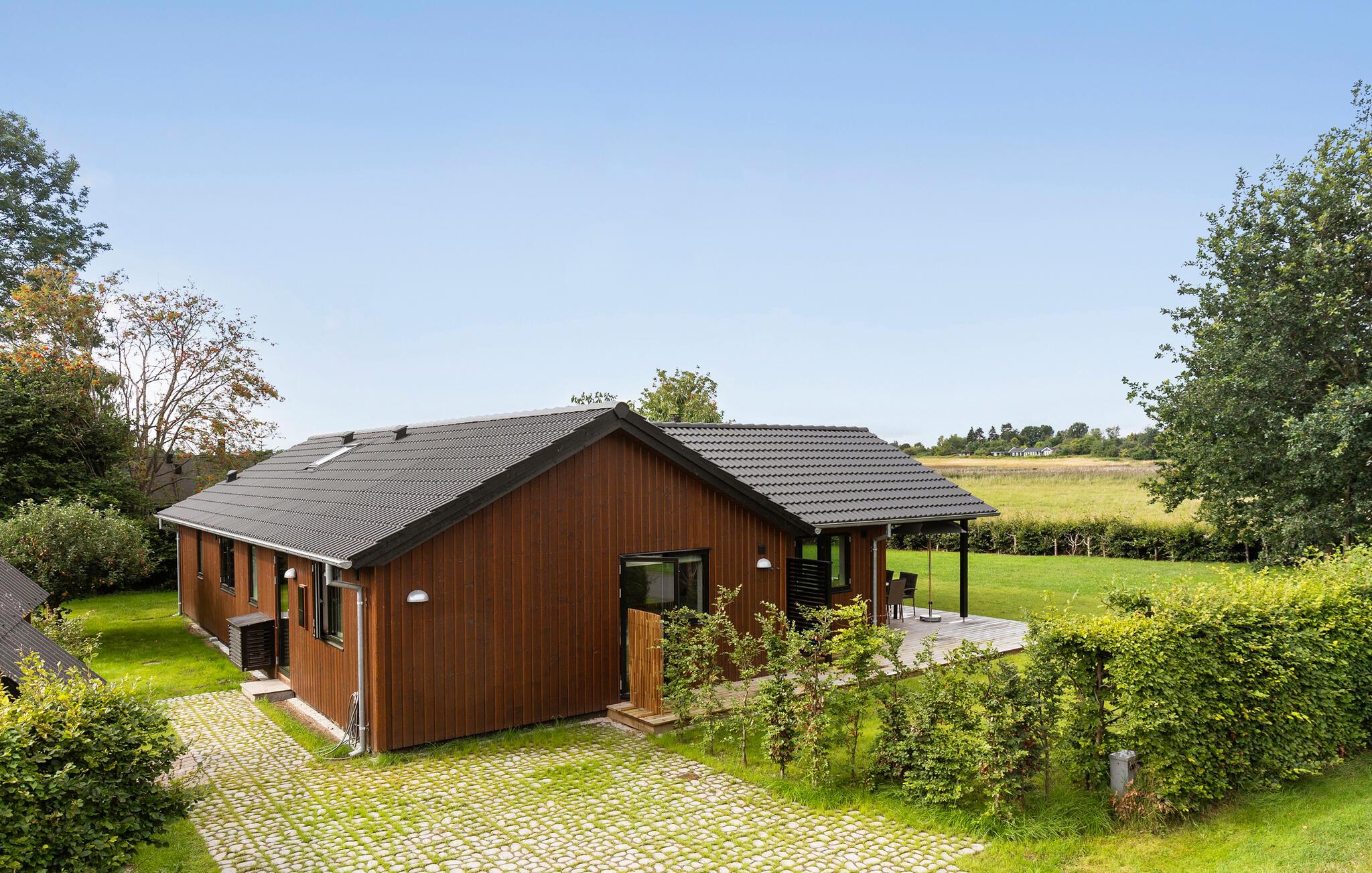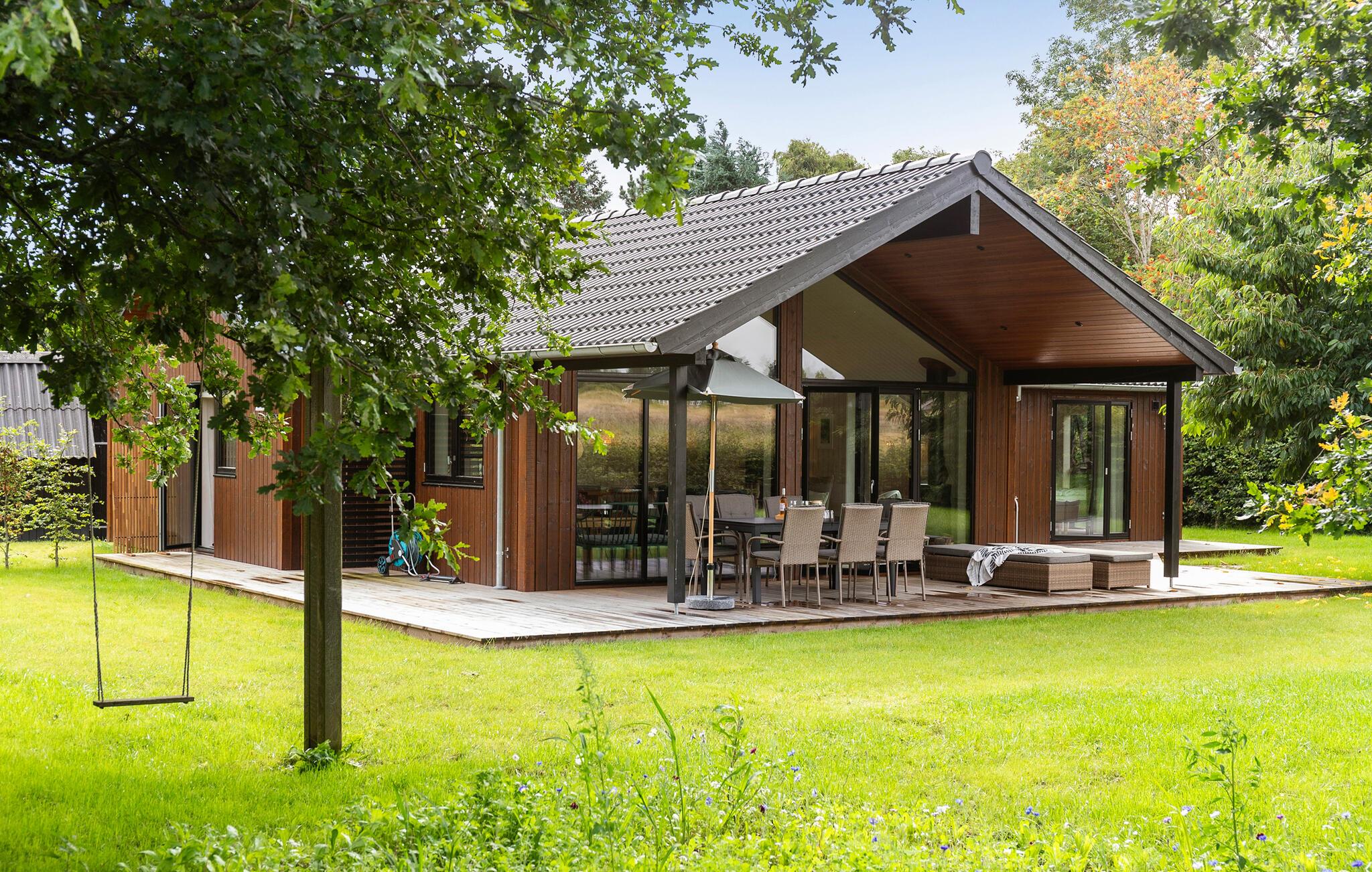 Luxe houten vakantiehuis in Villingebæk met tuin, terras en sfeervolle woonkamer, vlak bij zee en culturele bezienswaardigheden.