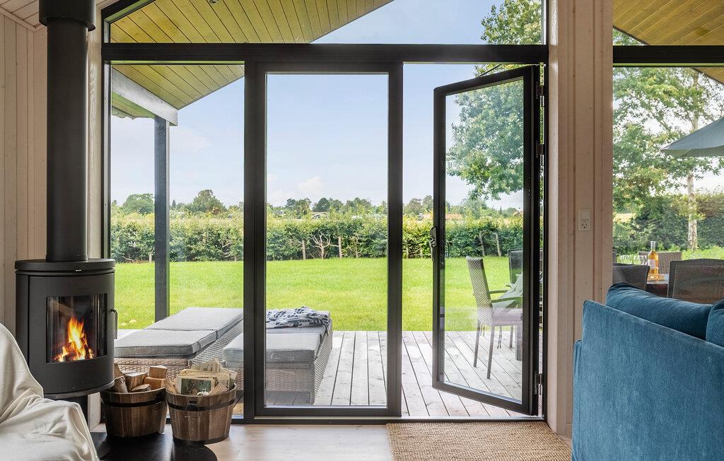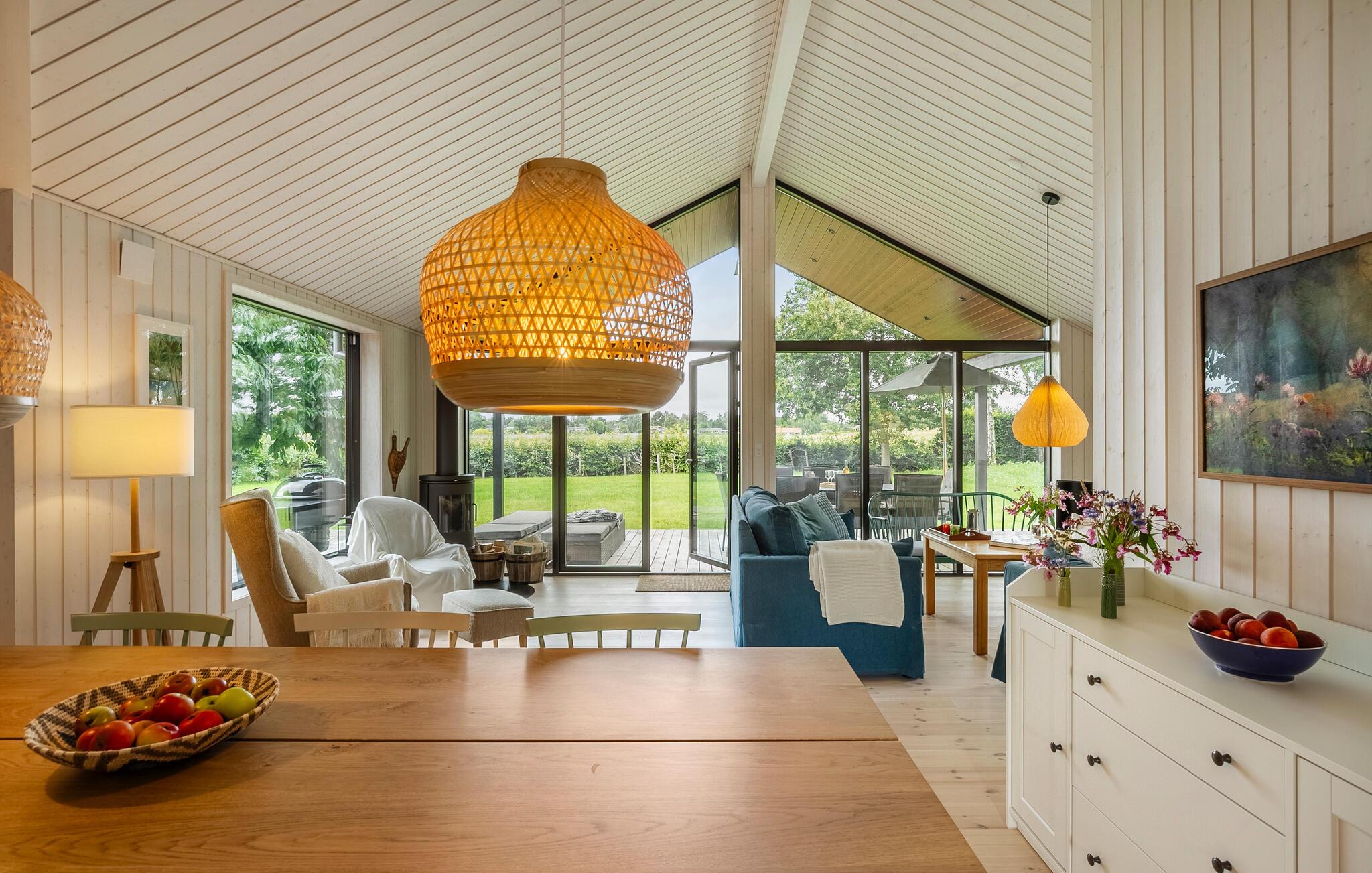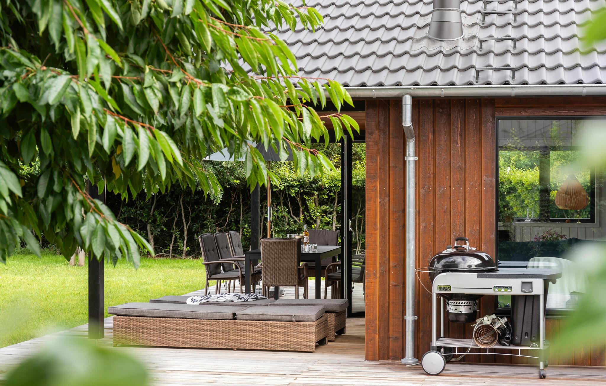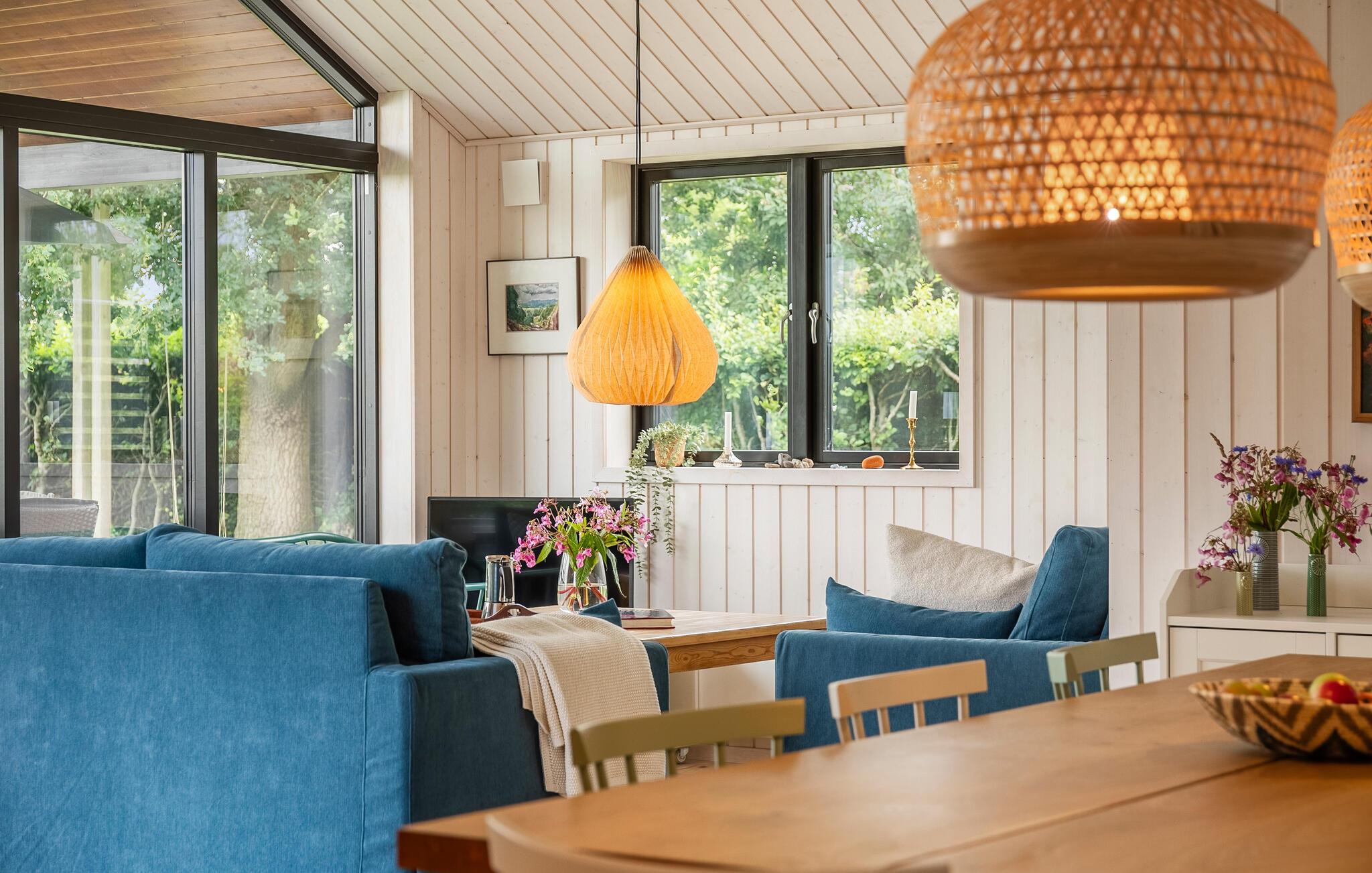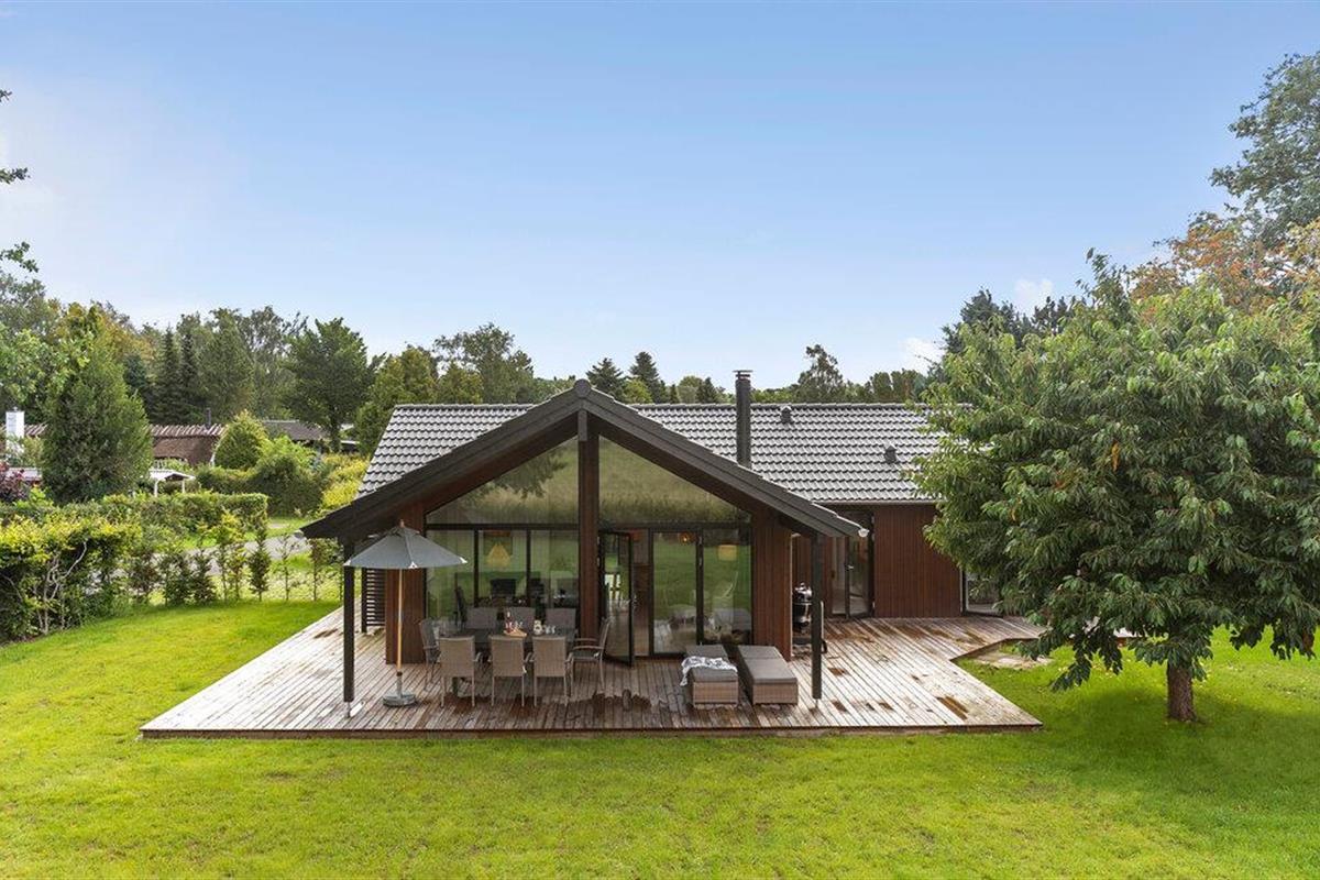 Luxe houten vakantiehuis in Villingebæk met tuin, terras en sfeervolle woonkamer, vlak bij zee en culturele bezienswaardigheden.