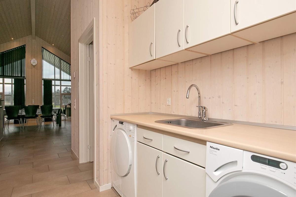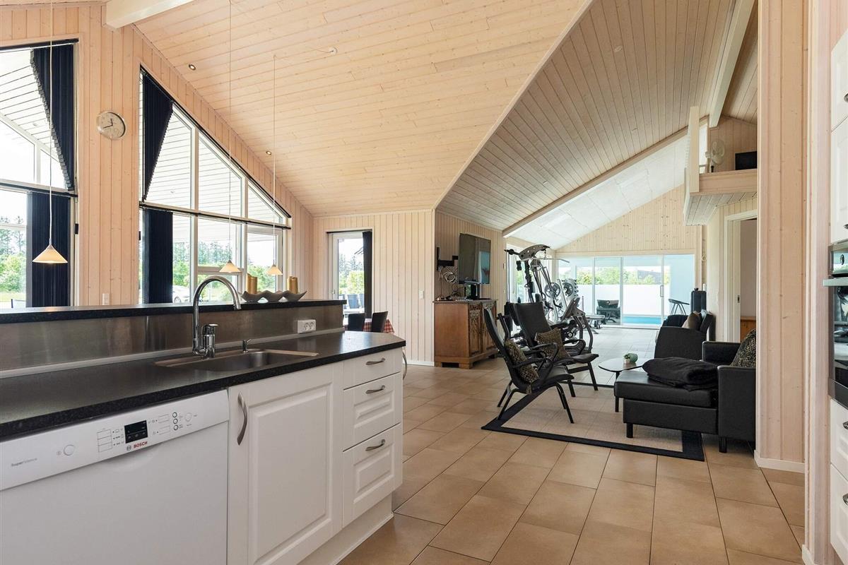 Die Einrichtung im Ferienhaus ist hell und einladend, mit hoher Zimmerdecke bis zum First. Funktionale Ausstattung sowie offener Küchen-/Wohnbereich für das Familienleben. Zur Küchenausstattung gehören u.a. Ceranfeld, Dunstabzugshaube, separater Backofen mit Grillfunktion, Mikrowelle, Geschirrspüler, Kaffeemaschine und Kühl-/Gefrierschrank. Außerdem gibt es diverse Küchenmaschinen inklusive Backmaschine und Mixer.