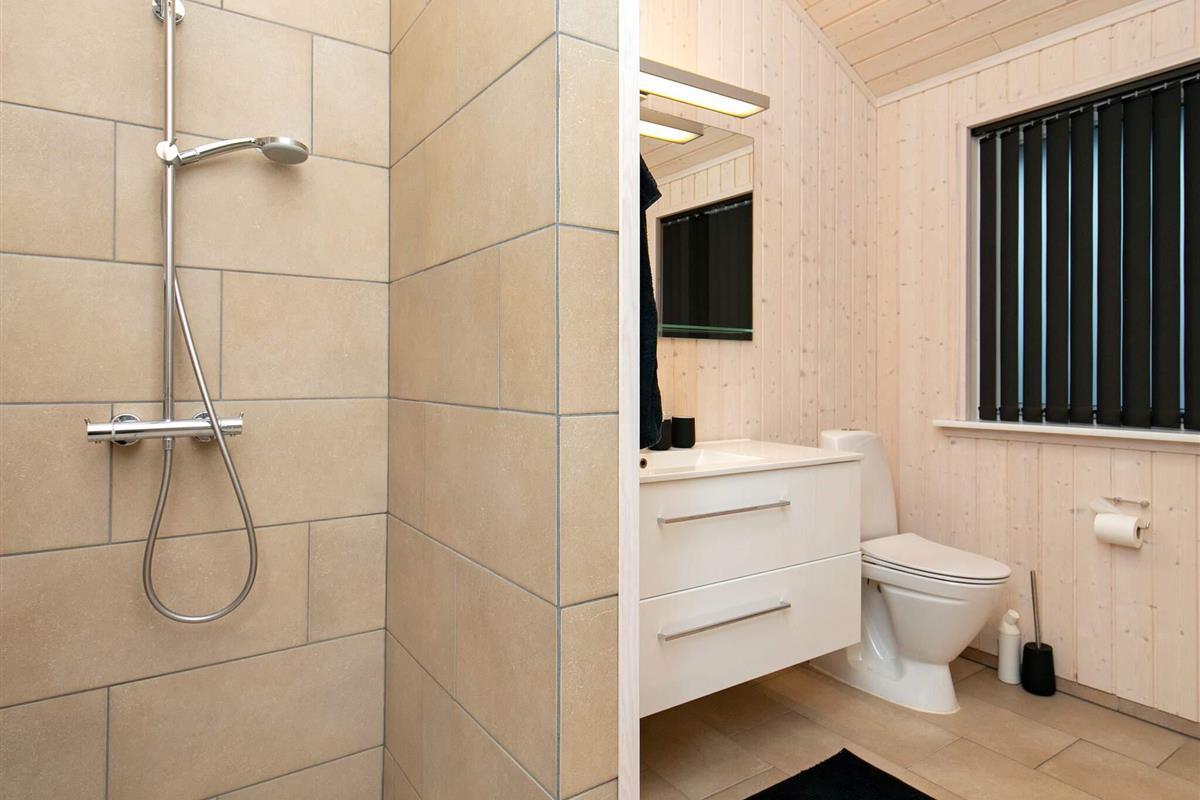 Zweites helles Badezimmer mit Dusche, WC und Fußbodenheizung. Außerdem gibt es eine Waschmaschine und einen Wäschetrockner im Haus.