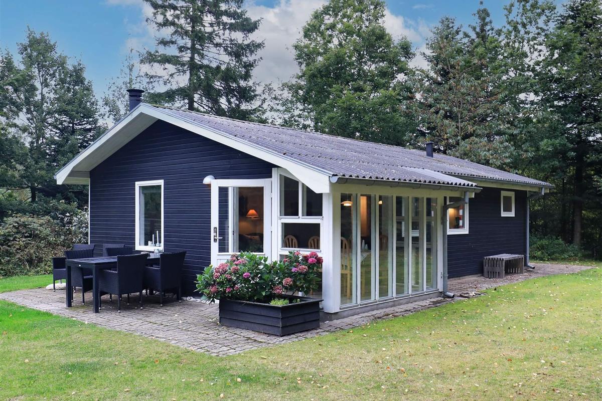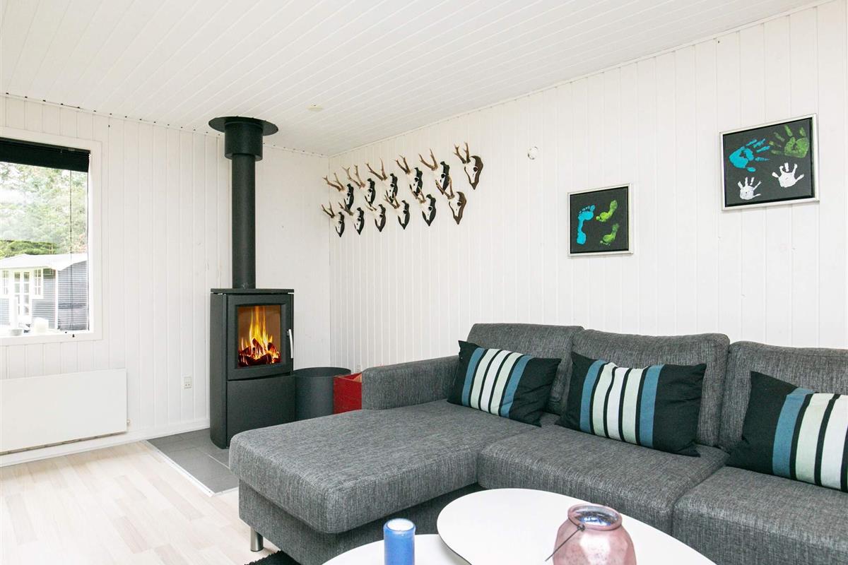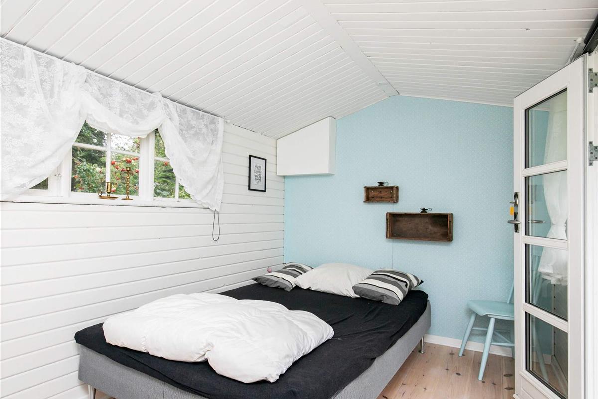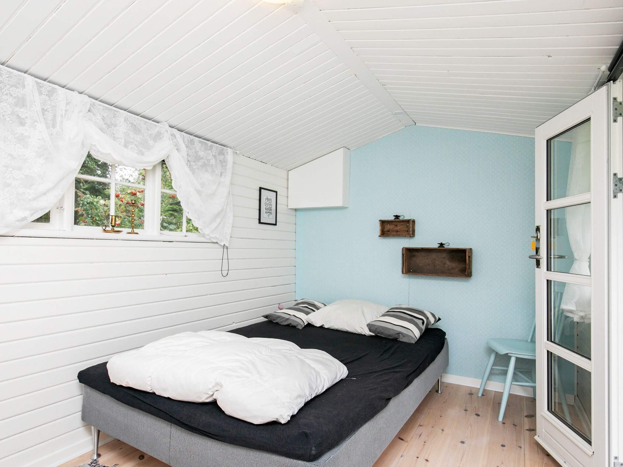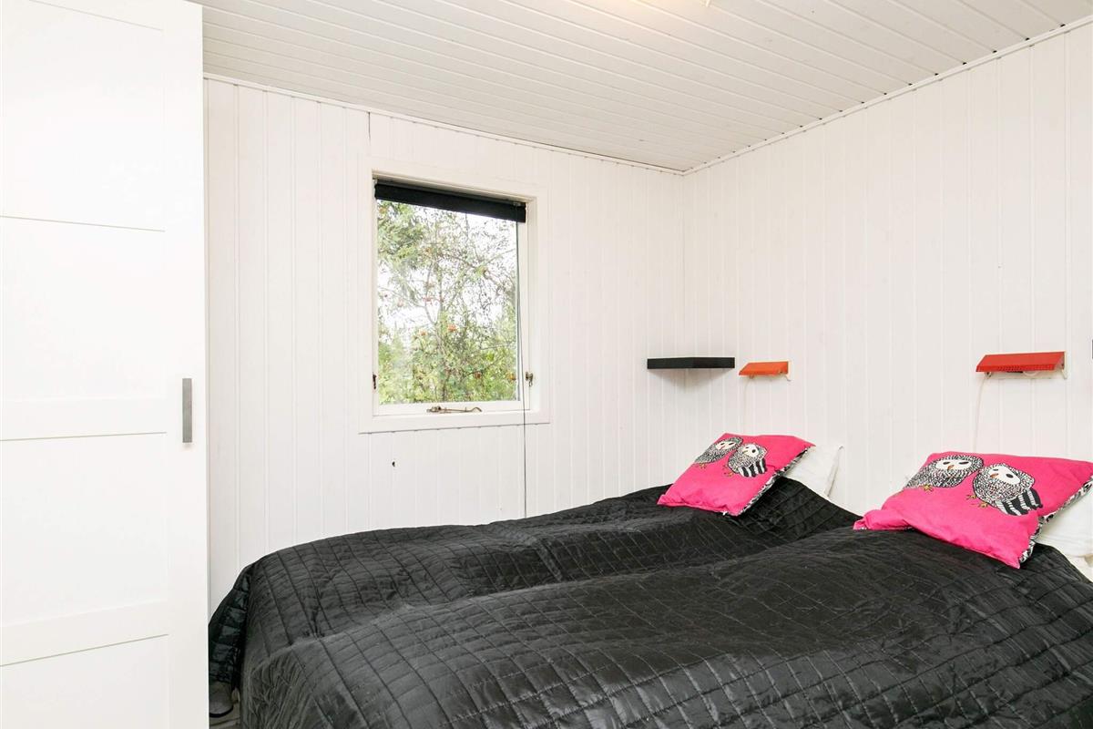 Das gepflegte Holzhaus wirkt hell und einladend. Es bietet ein Schlafzimmer mit Doppelbett und Schränken, ein Kinderzimmer mit zwei Kojen und einem Zustellbett, ein kleineres Badezimmer mit Dusche und einen hellen, offenen Küchen-/Wohnbereich für das Familienleben. Nebenan auf dem Grundstück steht zudem ein kleiner Annex mit zwei weiteren Schlafplätzen als Ausweichmöglichkeit. Das Ferienhaus liegt auf einem schönen Naturgrundstück mit Rasenfläche und Bäumen. Vom Grundstück führt ein kleiner Pfad hinunter ans Wasser.
