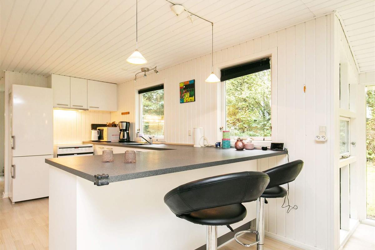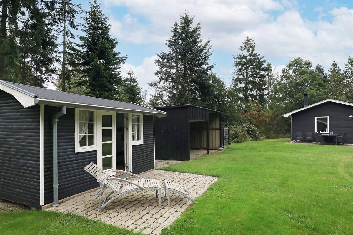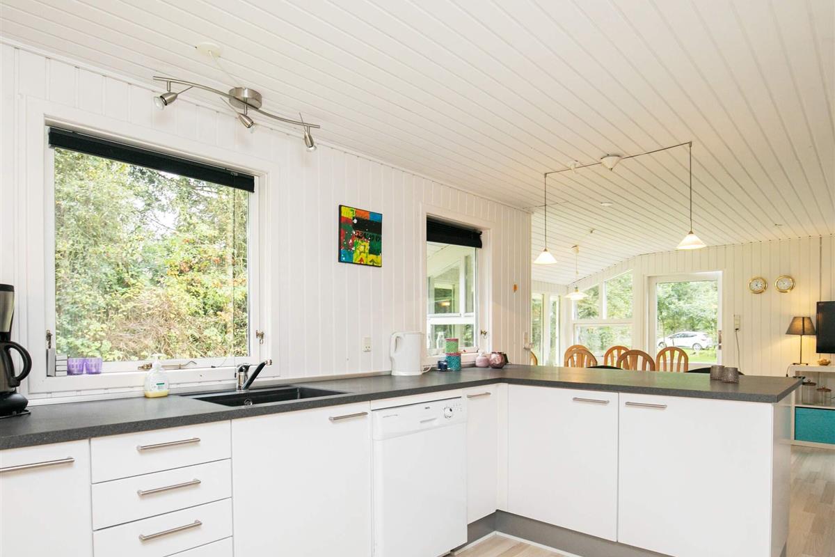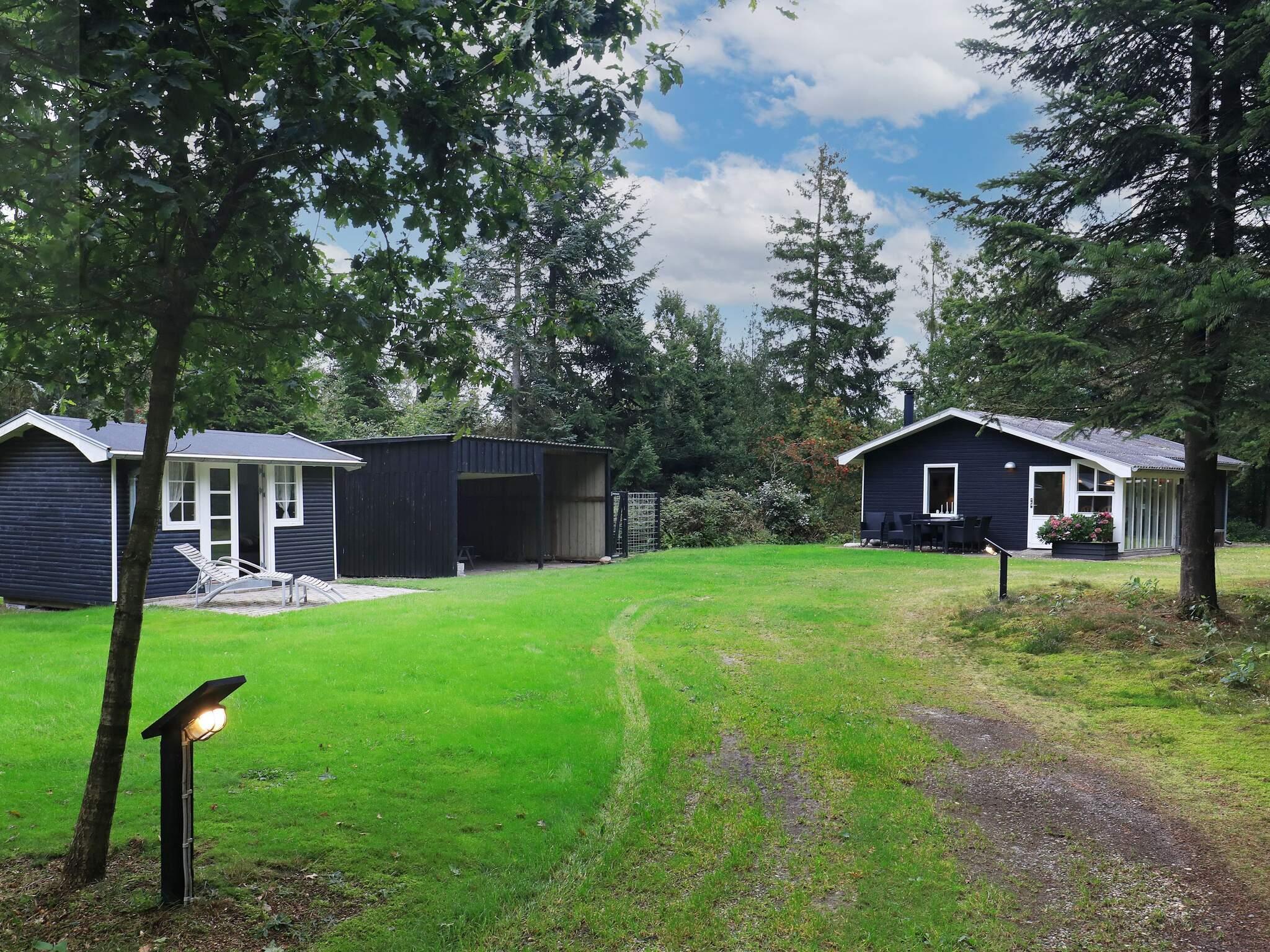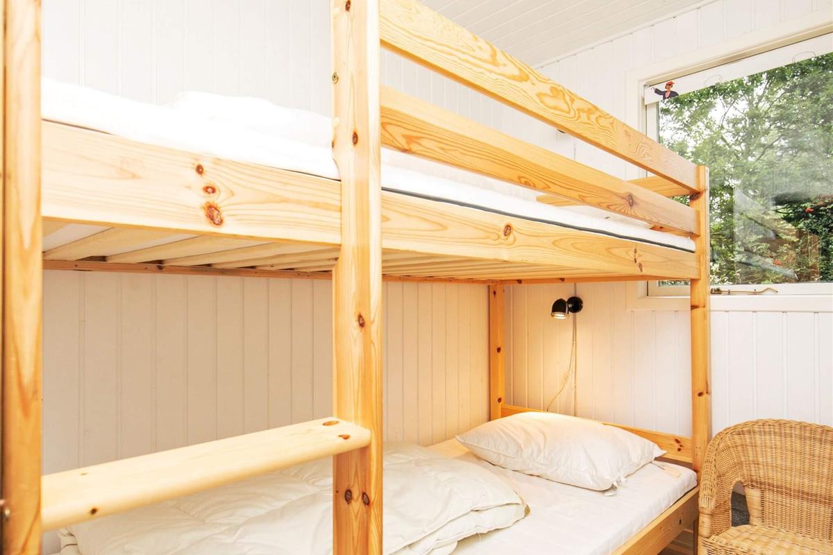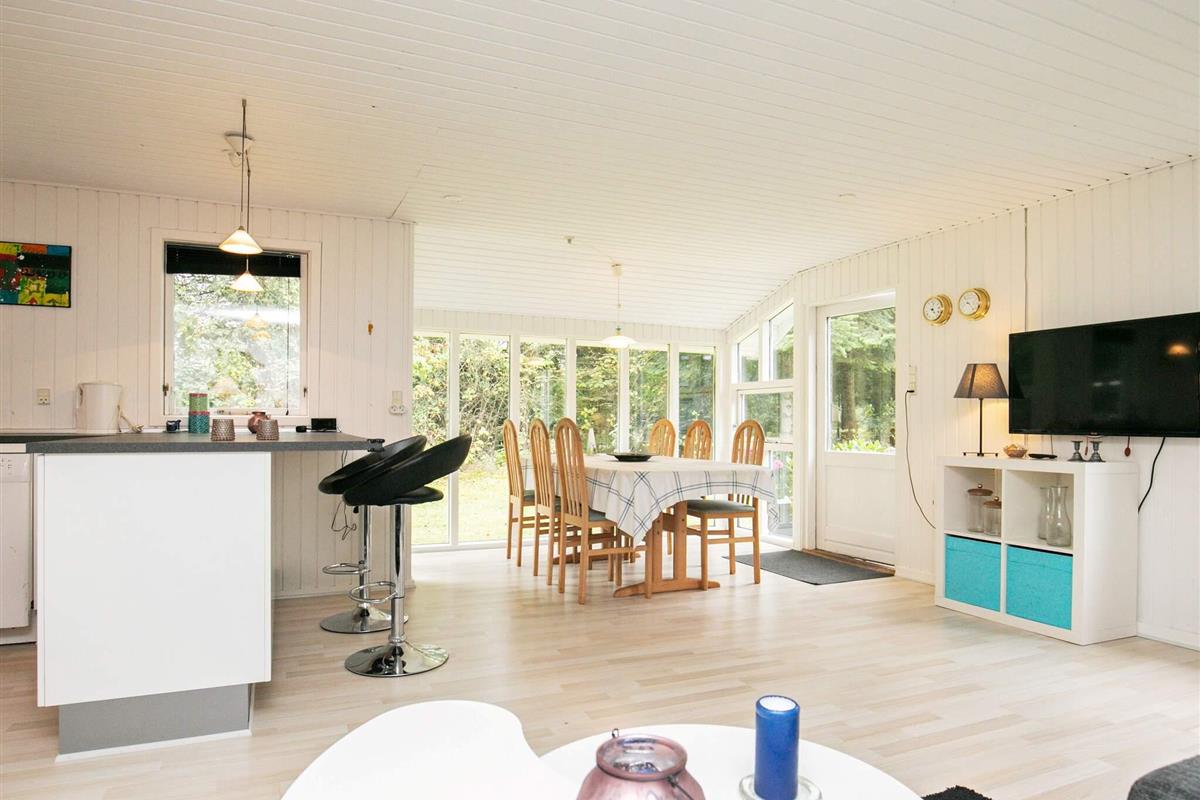 Das gepflegte Holzhaus wirkt hell und einladend. Es bietet ein Schlafzimmer mit Doppelbett und Schränken, ein Kinderzimmer mit zwei Kojen und einem Zustellbett, ein kleineres Badezimmer mit Dusche und einen hellen, offenen Küchen-/Wohnbereich für das Familienleben. Nebenan auf dem Grundstück steht zudem ein kleiner Annex mit zwei weiteren Schlafplätzen als Ausweichmöglichkeit. Das Ferienhaus liegt auf einem schönen Naturgrundstück mit Rasenfläche und Bäumen. Vom Grundstück führt ein kleiner Pfad hinunter ans Wasser.