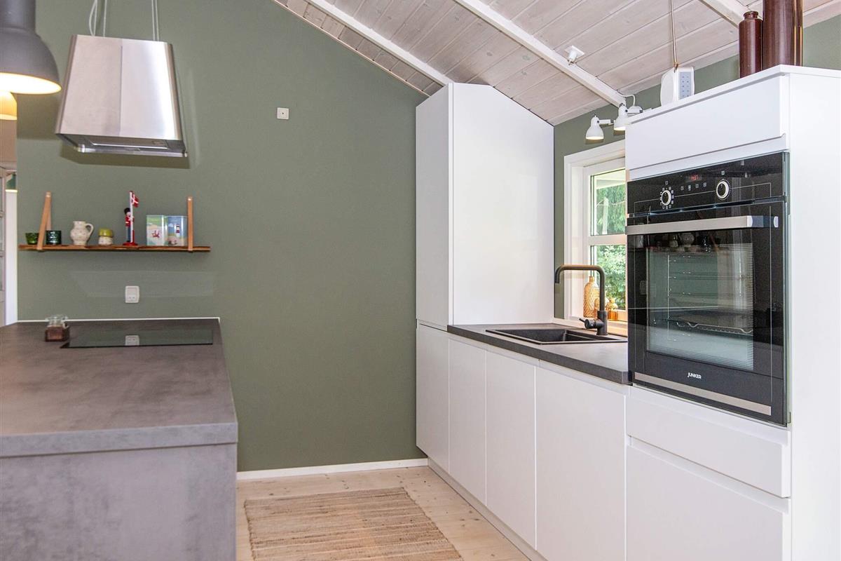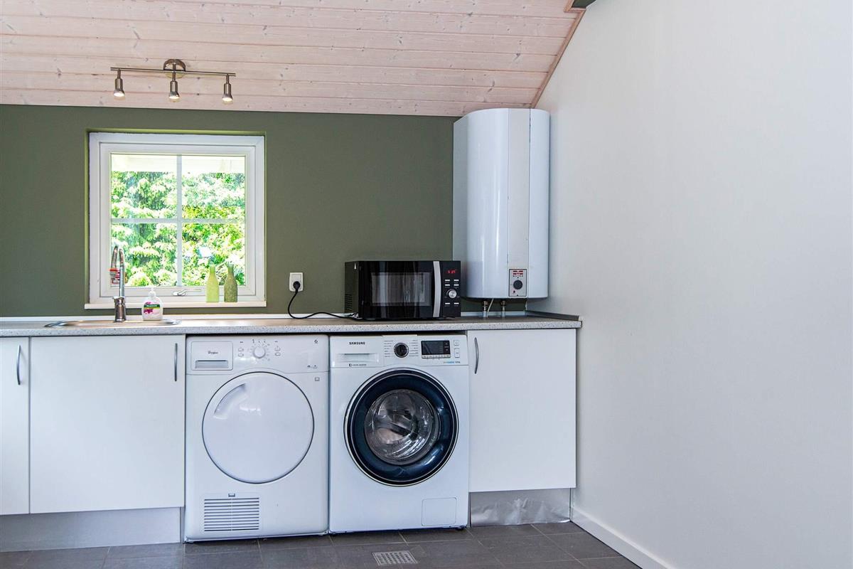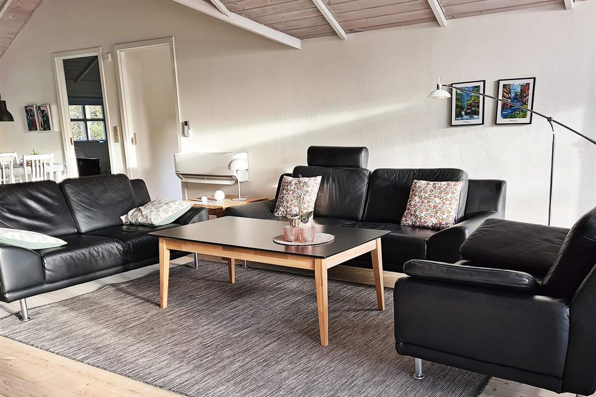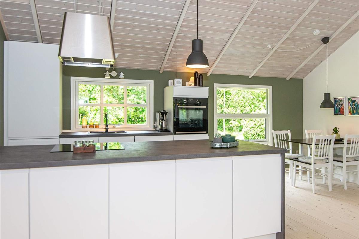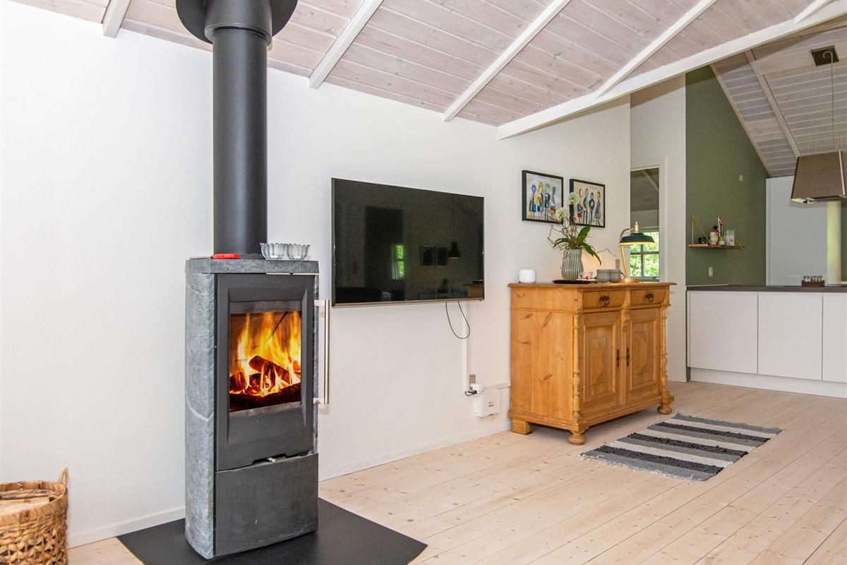 Das Ferienhaus hat einen gefliesten, praktischen Eingangsbereich mit Waschmaschine, Wäschetrockner, Arbeitsfläche und Staufläche. Den Mittelpunkt für das Familienleben bildet der große, offene Küchen-/Wohnbereich mit schöner Essecke vorne auf der ehemaligen Glasveranda sowie Sitzecke mit TV, WLAN und Chromecast zum Streamen eigener Anbieter. Im Wohnzimmer sowohl klimafreundliche Wärmepumpe als auch gemütlicher Holzofen für kühlere Abende.