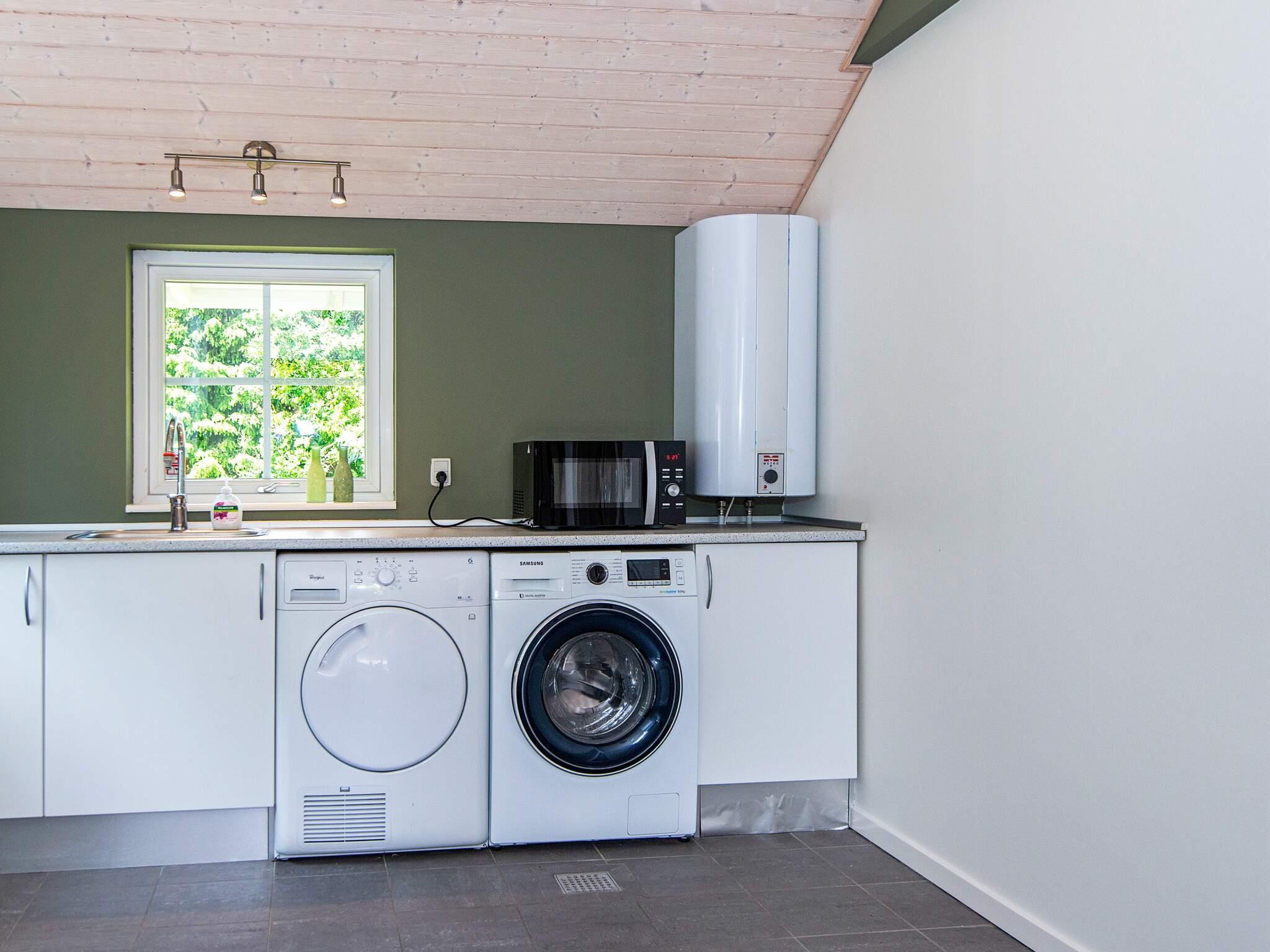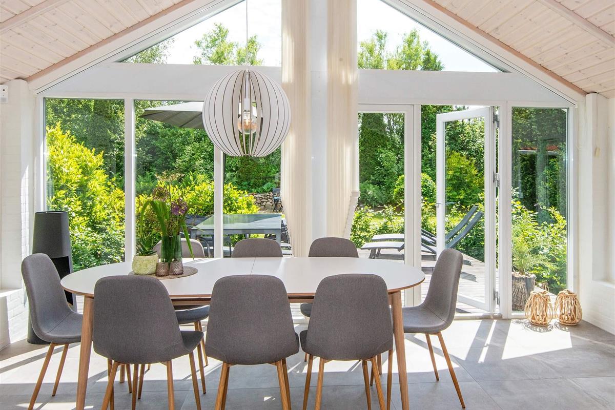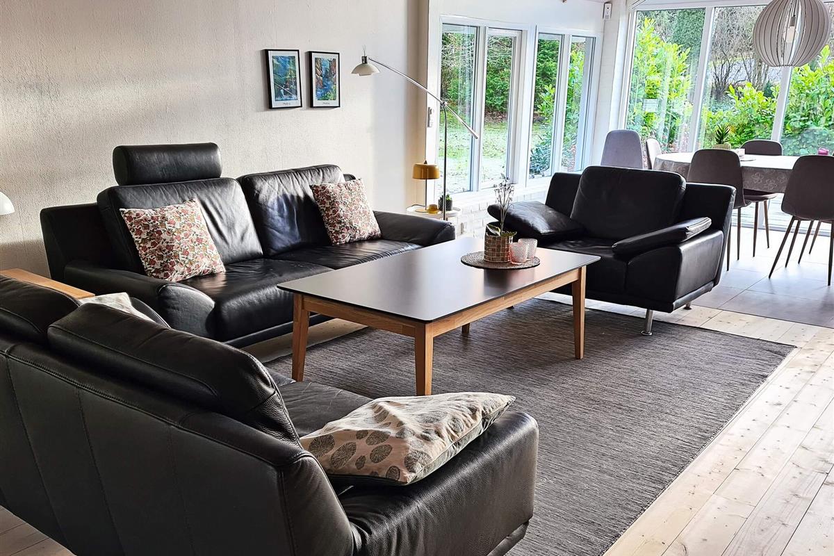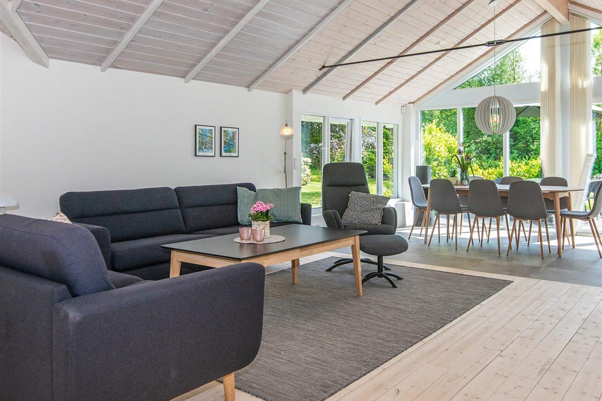 Das Ferienhaus hat einen gefliesten, praktischen Eingangsbereich mit Waschmaschine, Wäschetrockner, Arbeitsfläche und Staufläche. Den Mittelpunkt für das Familienleben bildet der große, offene Küchen-/Wohnbereich mit schöner Essecke vorne auf der ehemaligen Glasveranda sowie Sitzecke mit TV, WLAN und Chromecast zum Streamen eigener Anbieter. Im Wohnzimmer sowohl klimafreundliche Wärmepumpe als auch gemütlicher Holzofen für kühlere Abende.