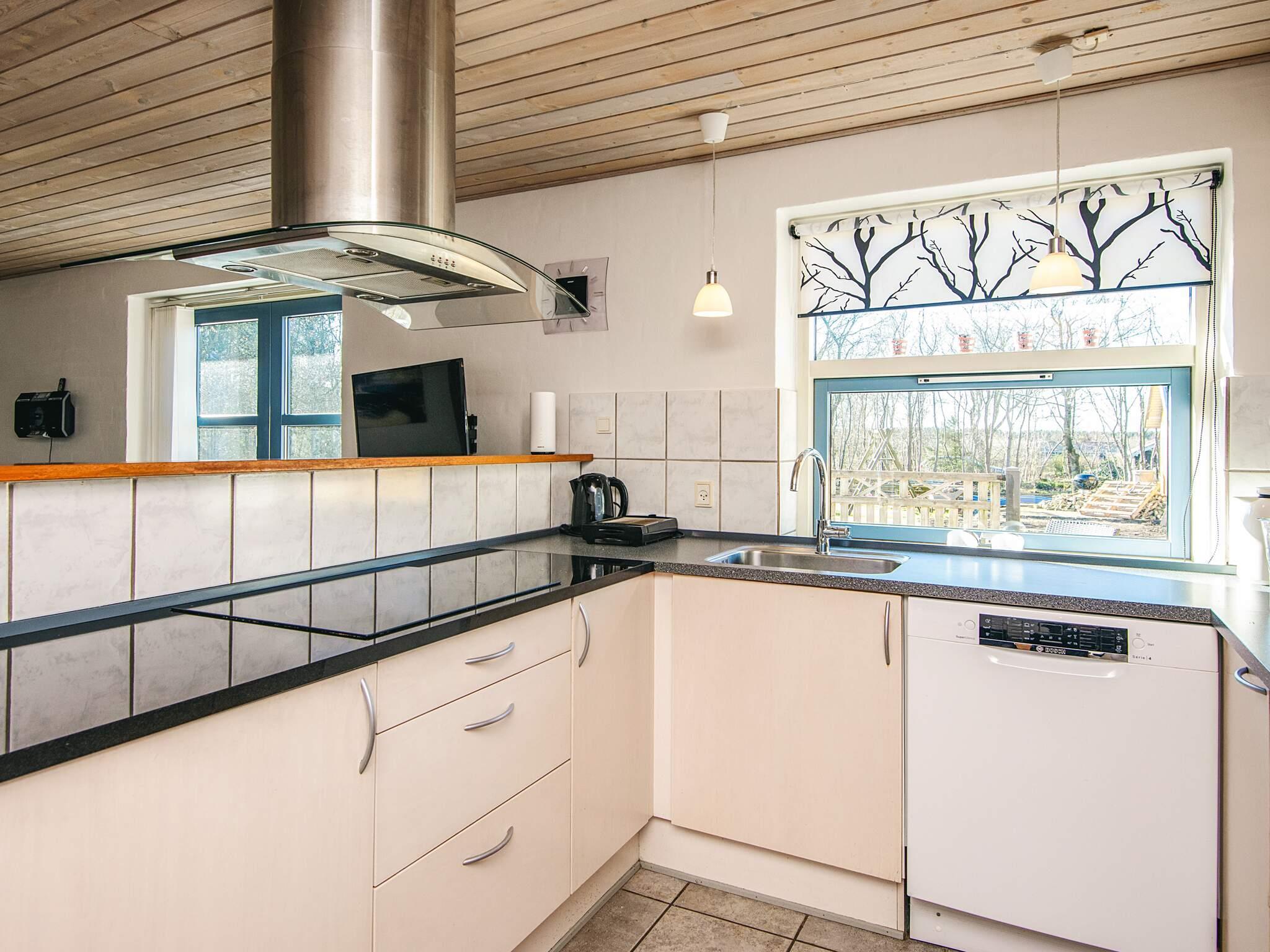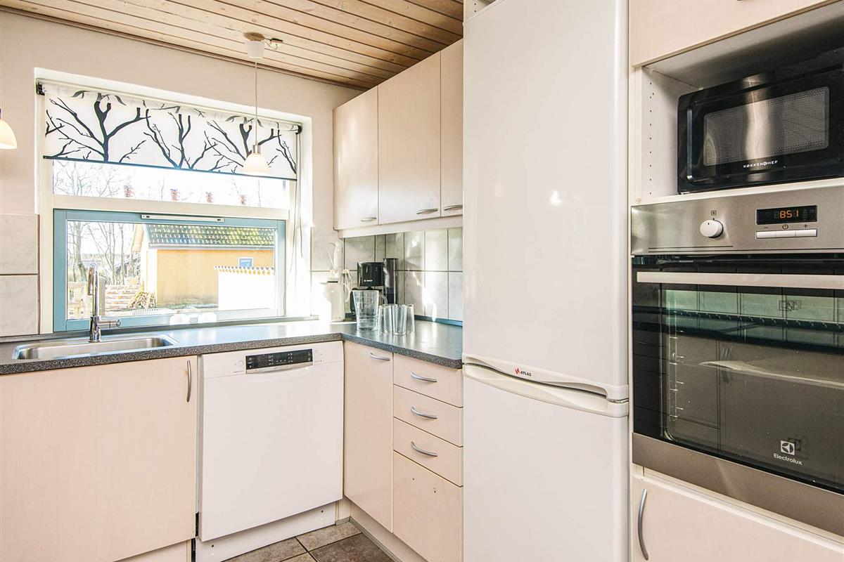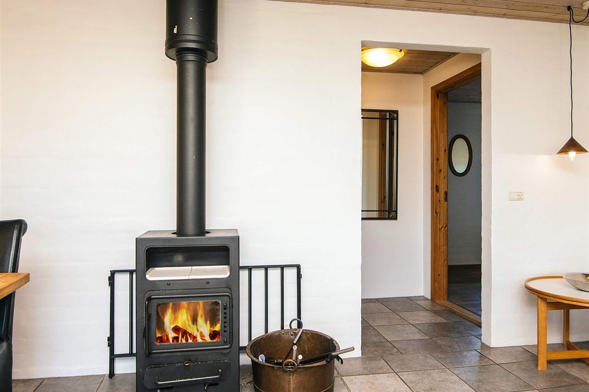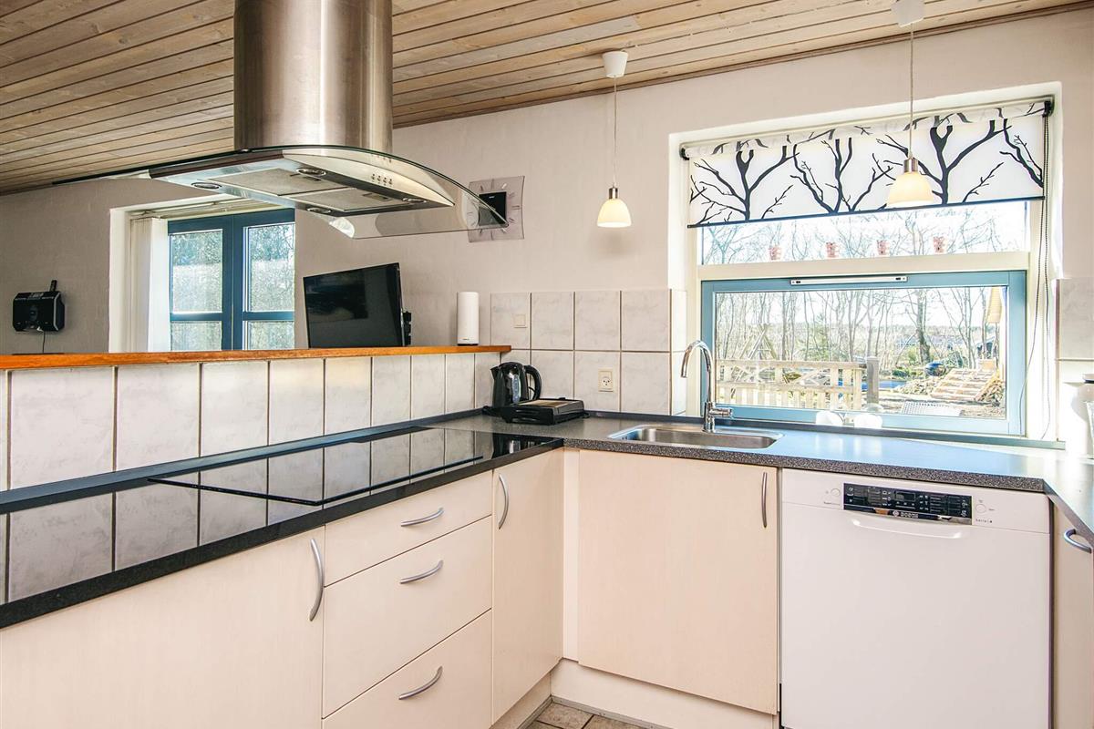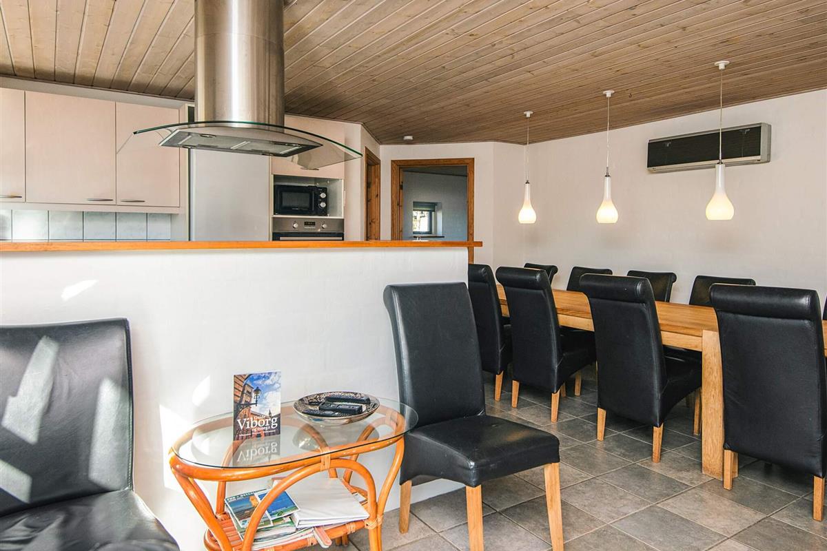 Geräumiges und gut ausgestattetes Ferienhaus auf einem Naturgrundstück in einem schönen Ferienhausgebiet in Højslev. Das Haus hat eine kombinierte Wohnküche mit einem Holzofen. Die Küche ist modern eingerichtet. Es gibt eine Waschmaschine, einen Wäschetrockner und einen Weinkühlschrank im Haus.