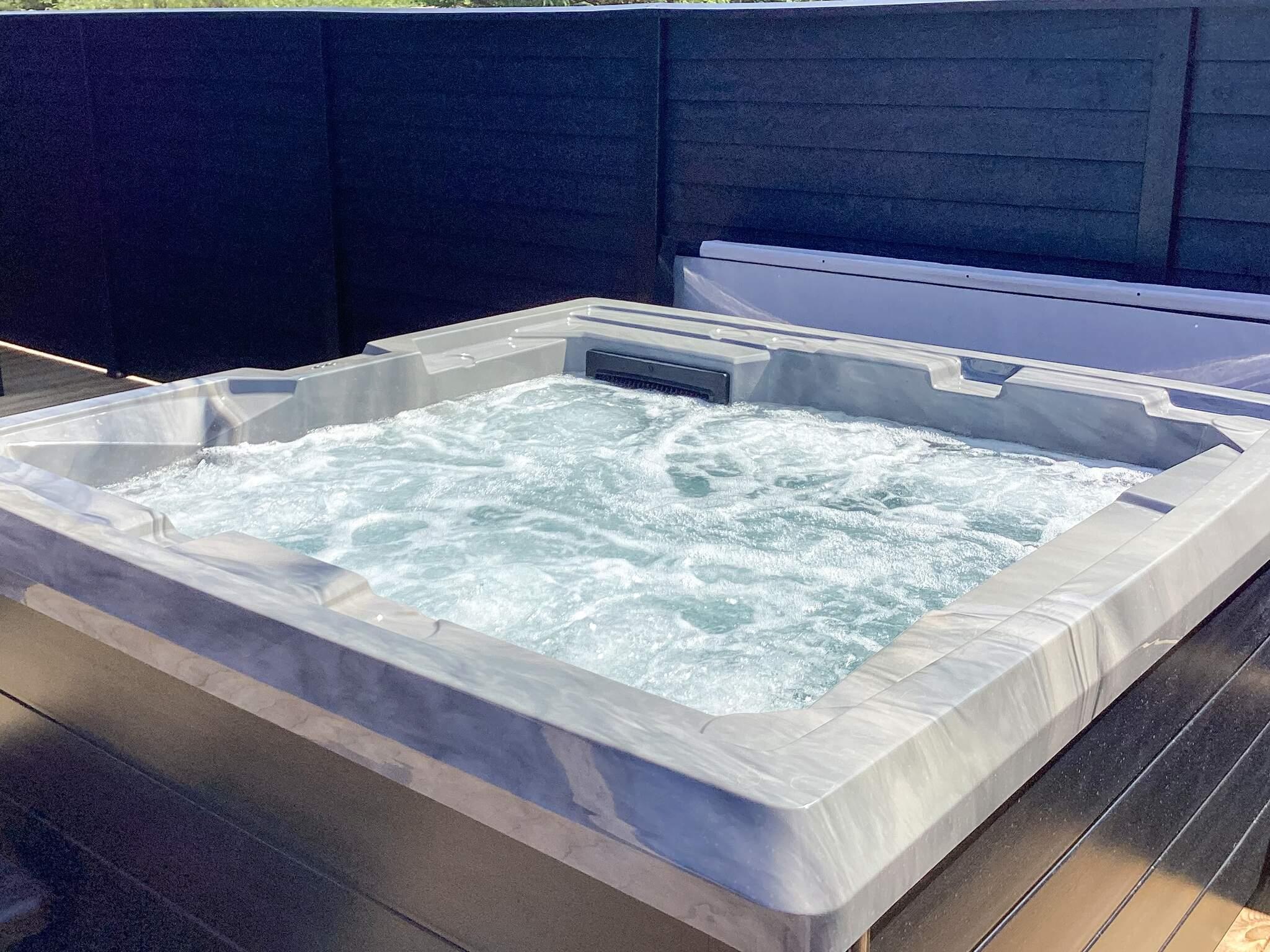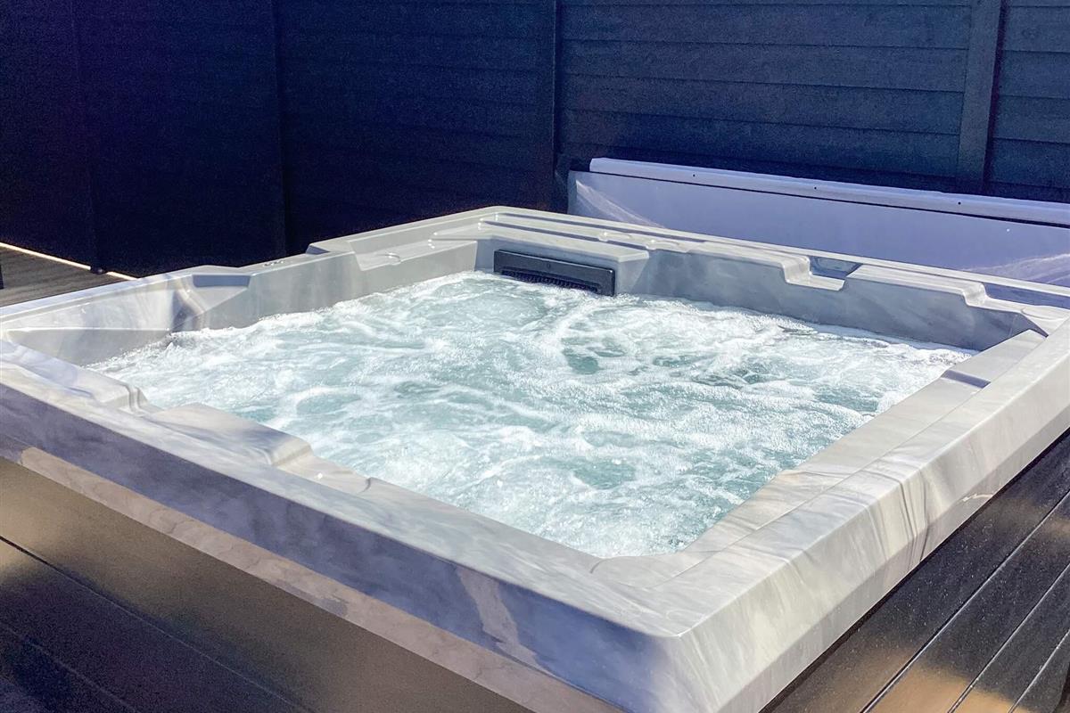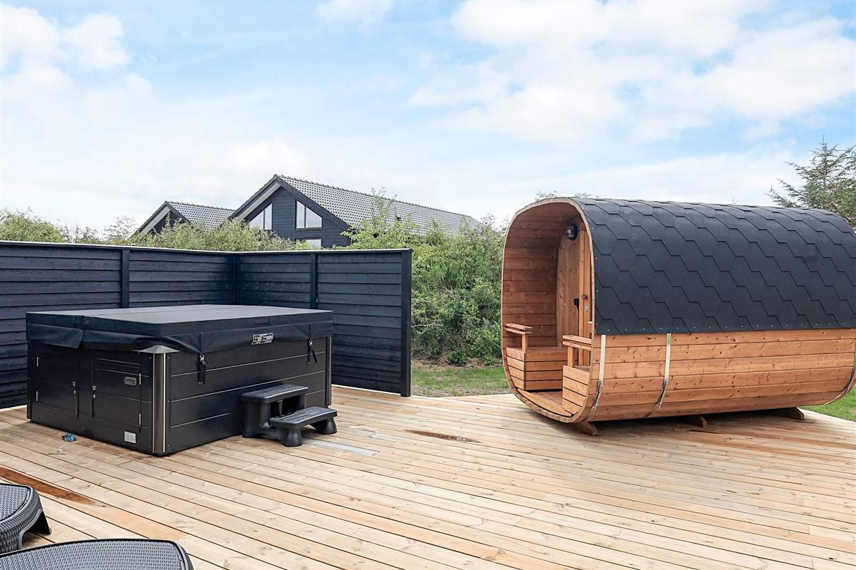 Von der großen Holzterrasse aus gelangt man direkt auf die hauseigene Außen-Whirlpool für 6 Personen. Dieser wird automatisch mit Wasser aus dem hauseigenen Swimmingpool befüllt und hat daher ca. 28 Grad Celsius und kann schnell auf die gewünschte Temperatur aufgeheizt werden. Außerdem gibt es ein Saunafass und eine Außendusche.