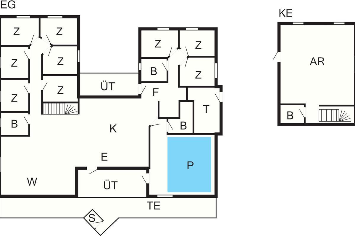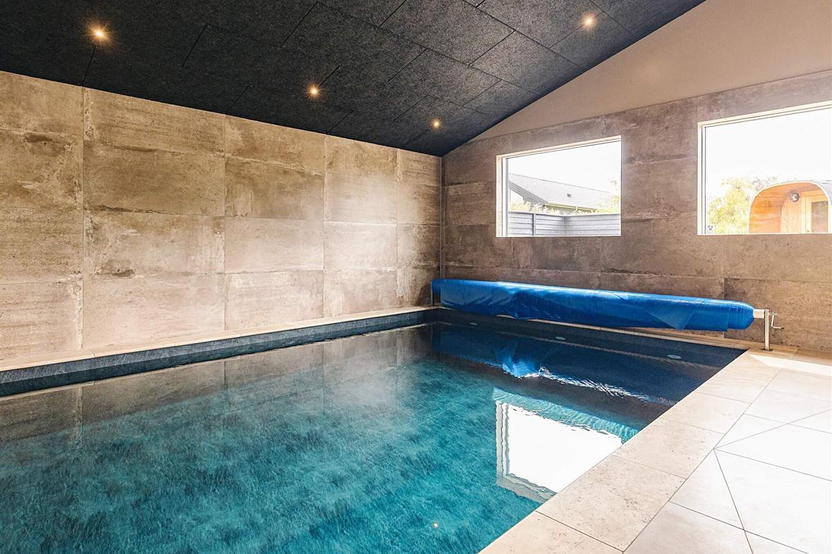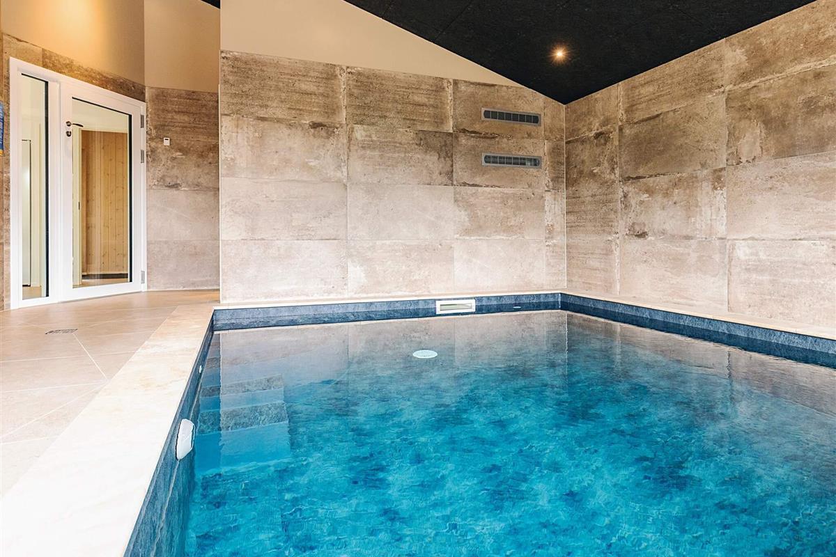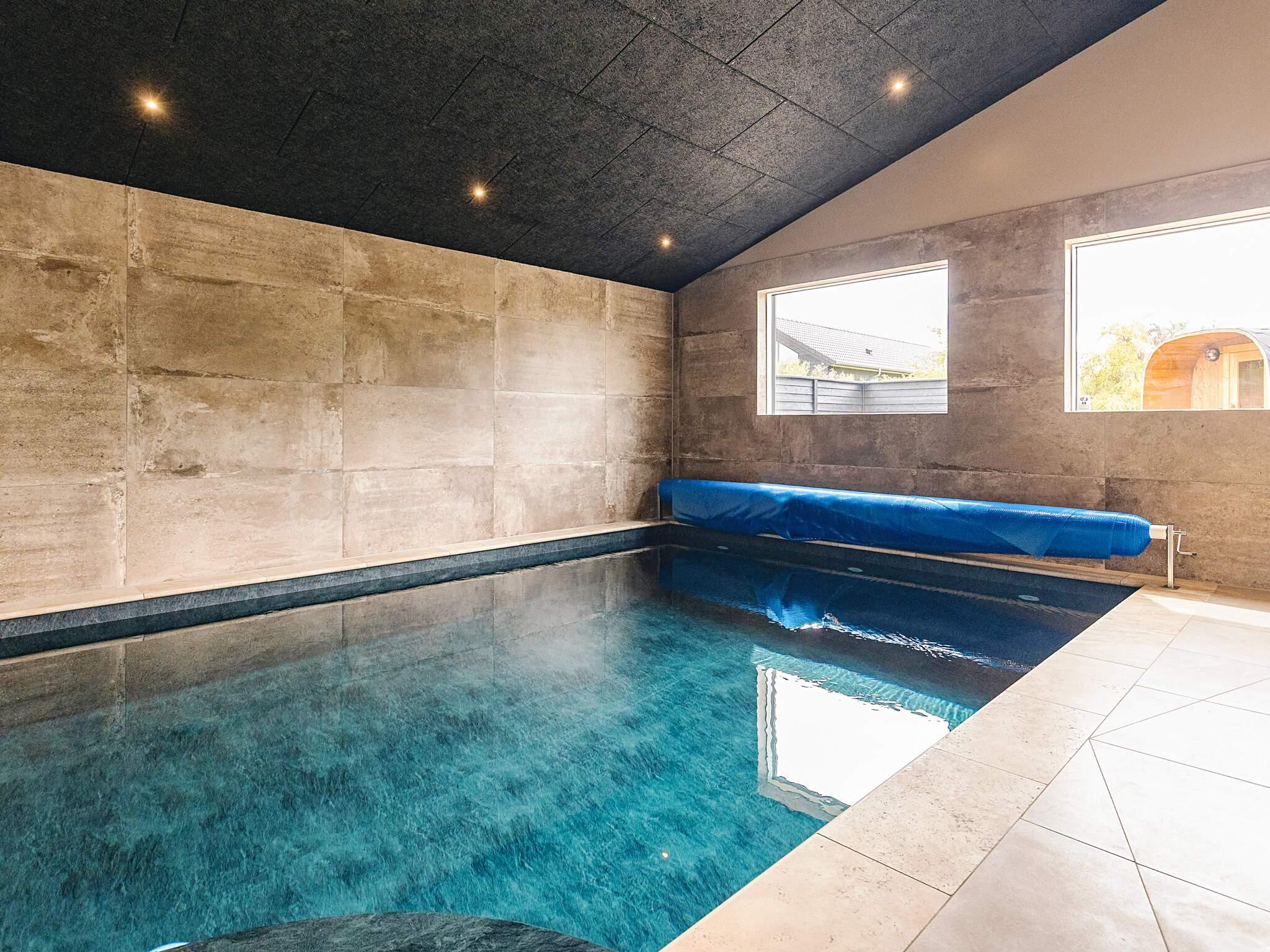 Der Pool-/Wellnessbereich des Ferienhauses bietet unter anderem einen 19 m² großen Salzwasserpool, der mit minimalem Chemikalieneinsatz auskommt und Chlorgeruch vermeidet. Der Pool misst 3,8 x 5,00 x 1,40 m. Es gibt ein helles Badezimmer mit Badebereich, WC, Dusche und Fußbodenheizung.