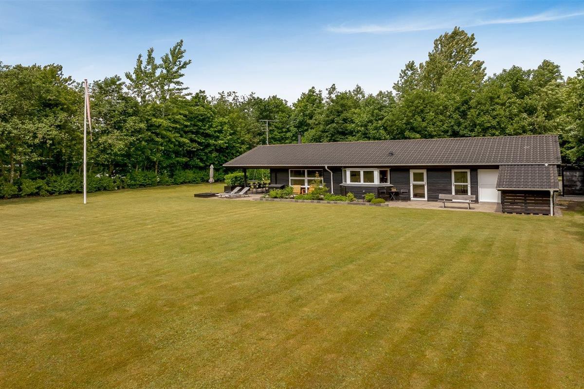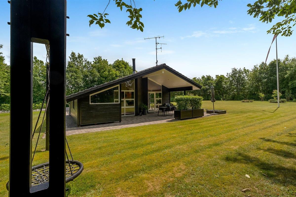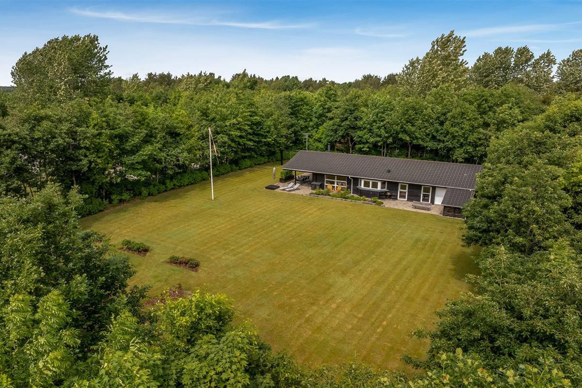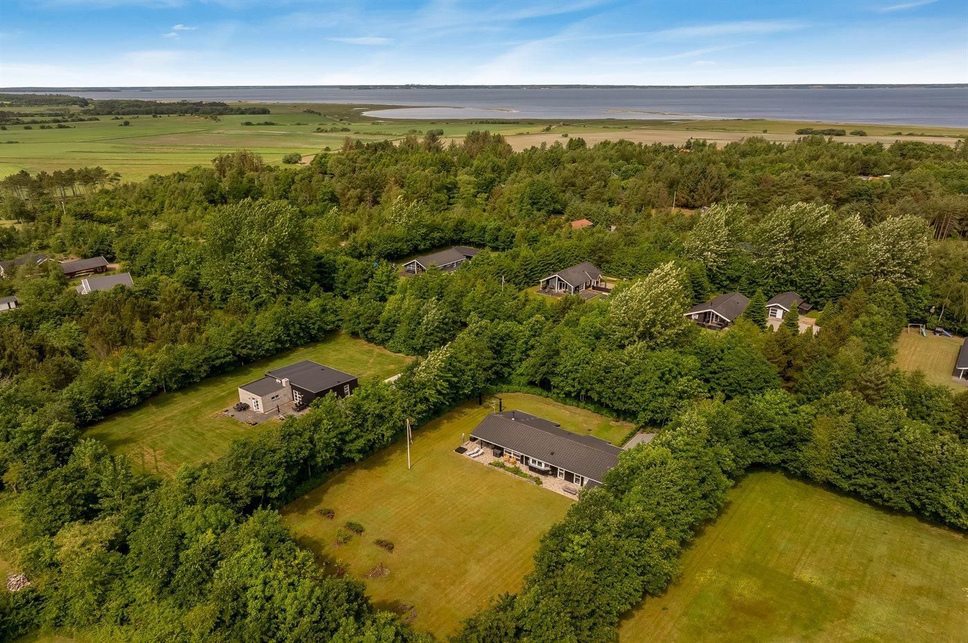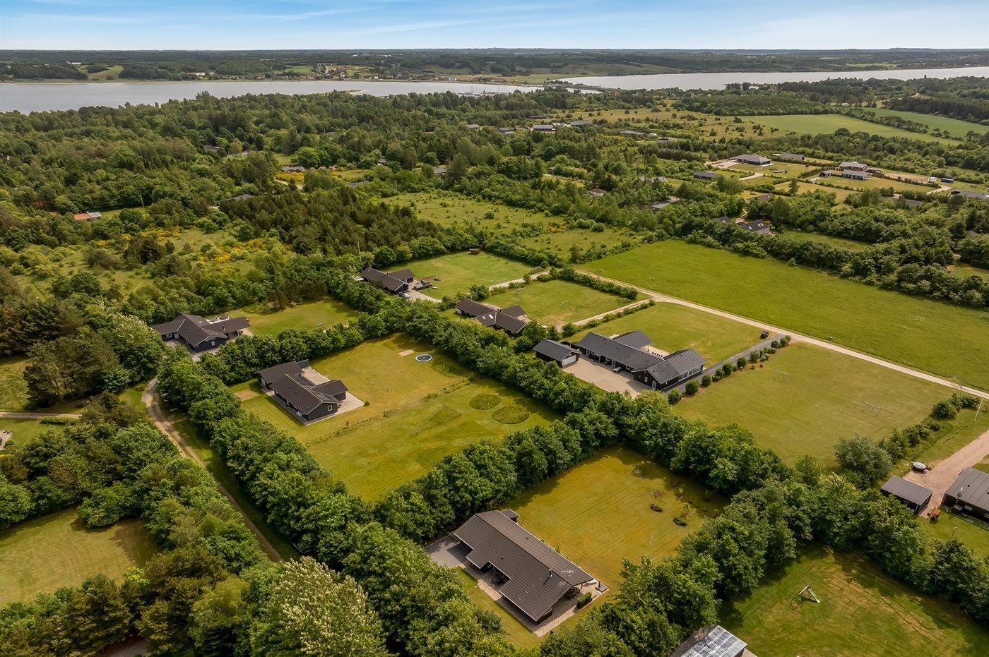 De vakantiewoning is gelegen op een 2510 m² groot natuural grond. De grond is omheind. Afstand tot de fjord 500 m. Dichtstbijzijnde winkel 1500 m. Bij de vakantiewoning hoort 80 m² terras. Daarnaast is er een 20 m² groot overdekt terras. Gereedschapsruimte. Schommel. Zandbak. Carport ter beschikking. Parkeerplaats bij het huis.