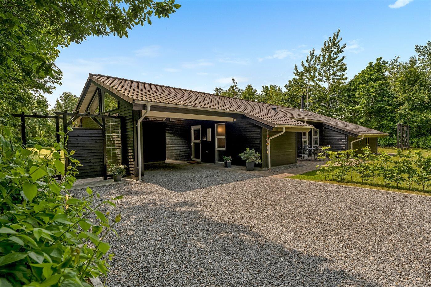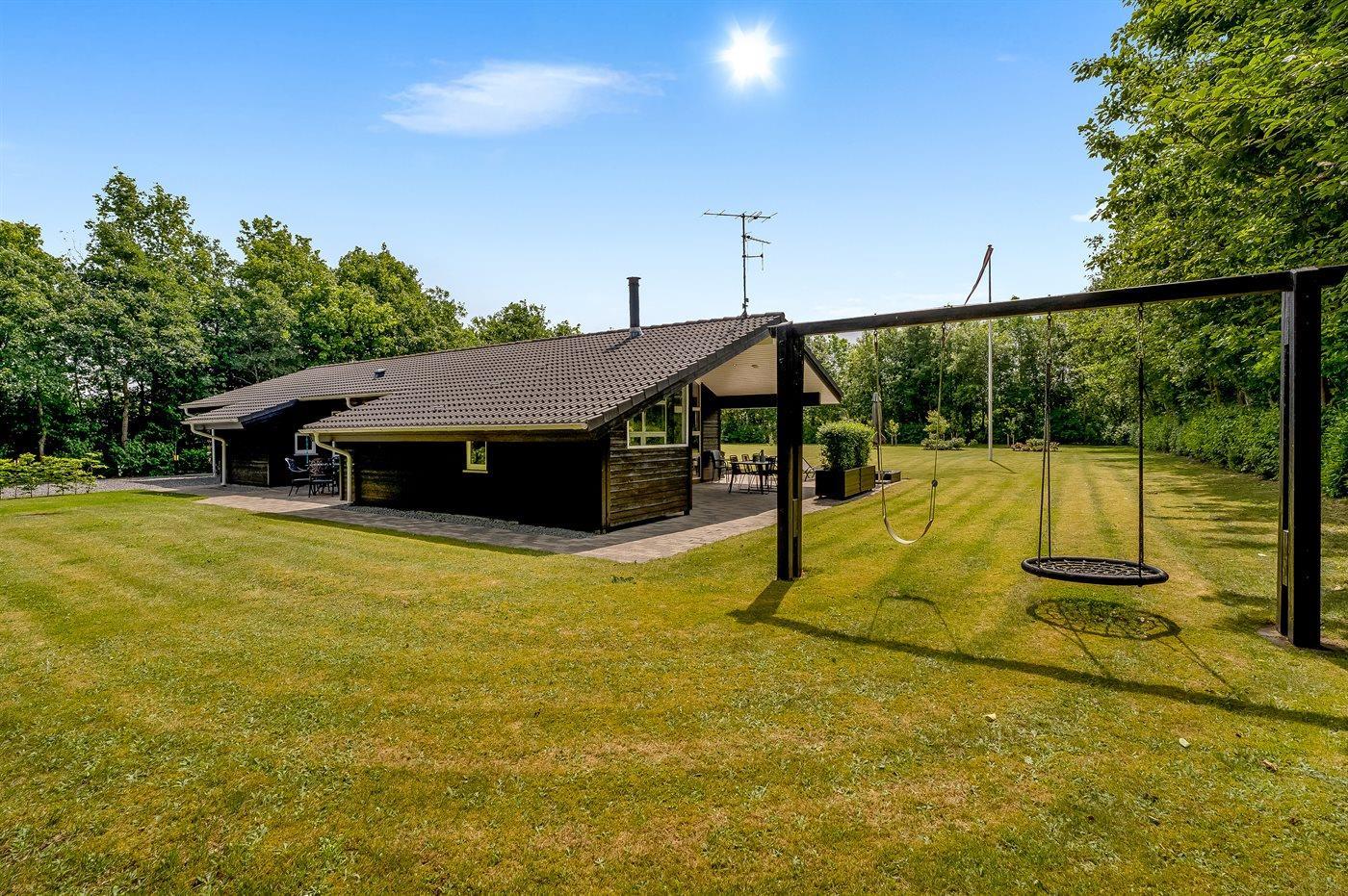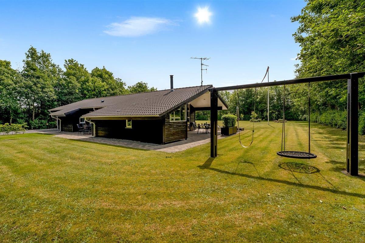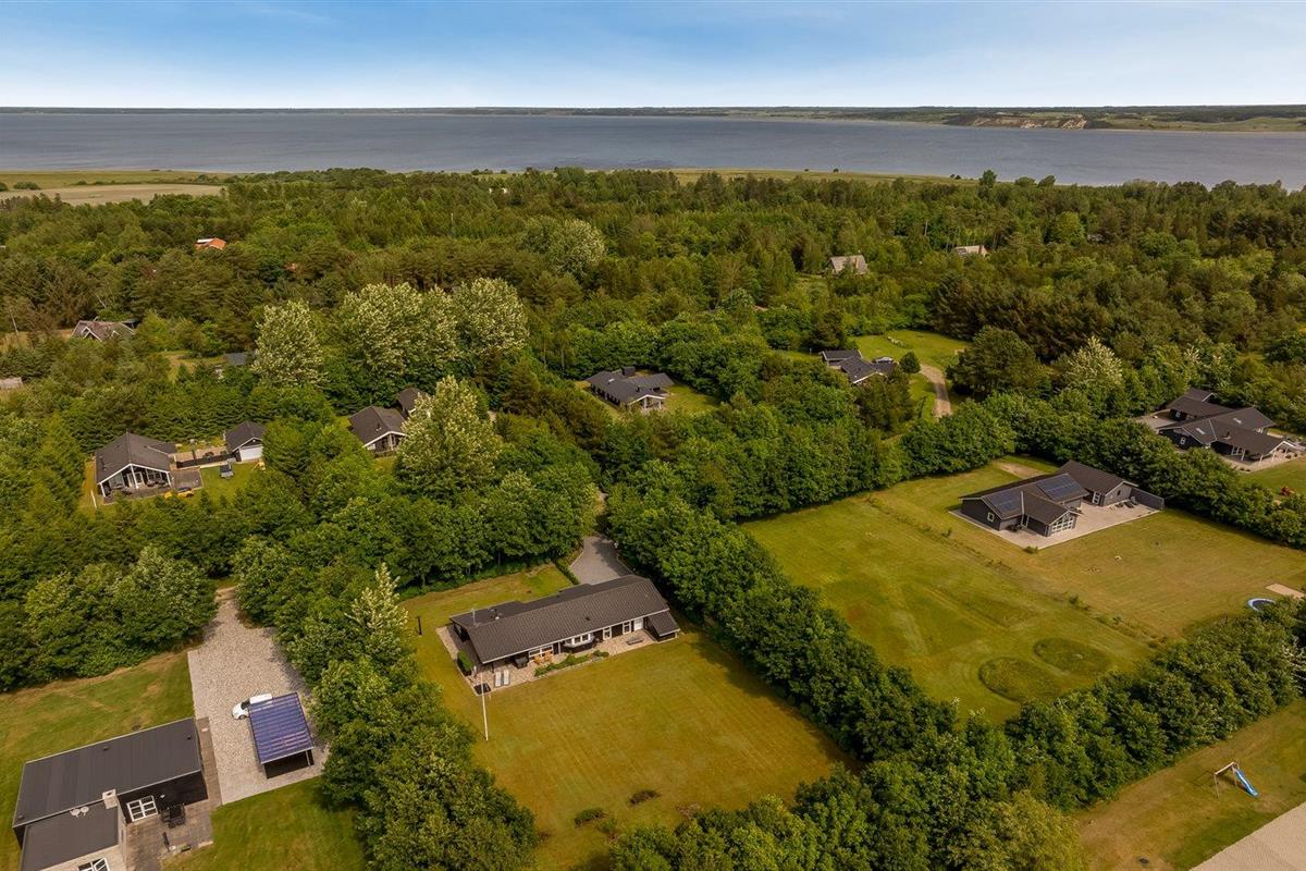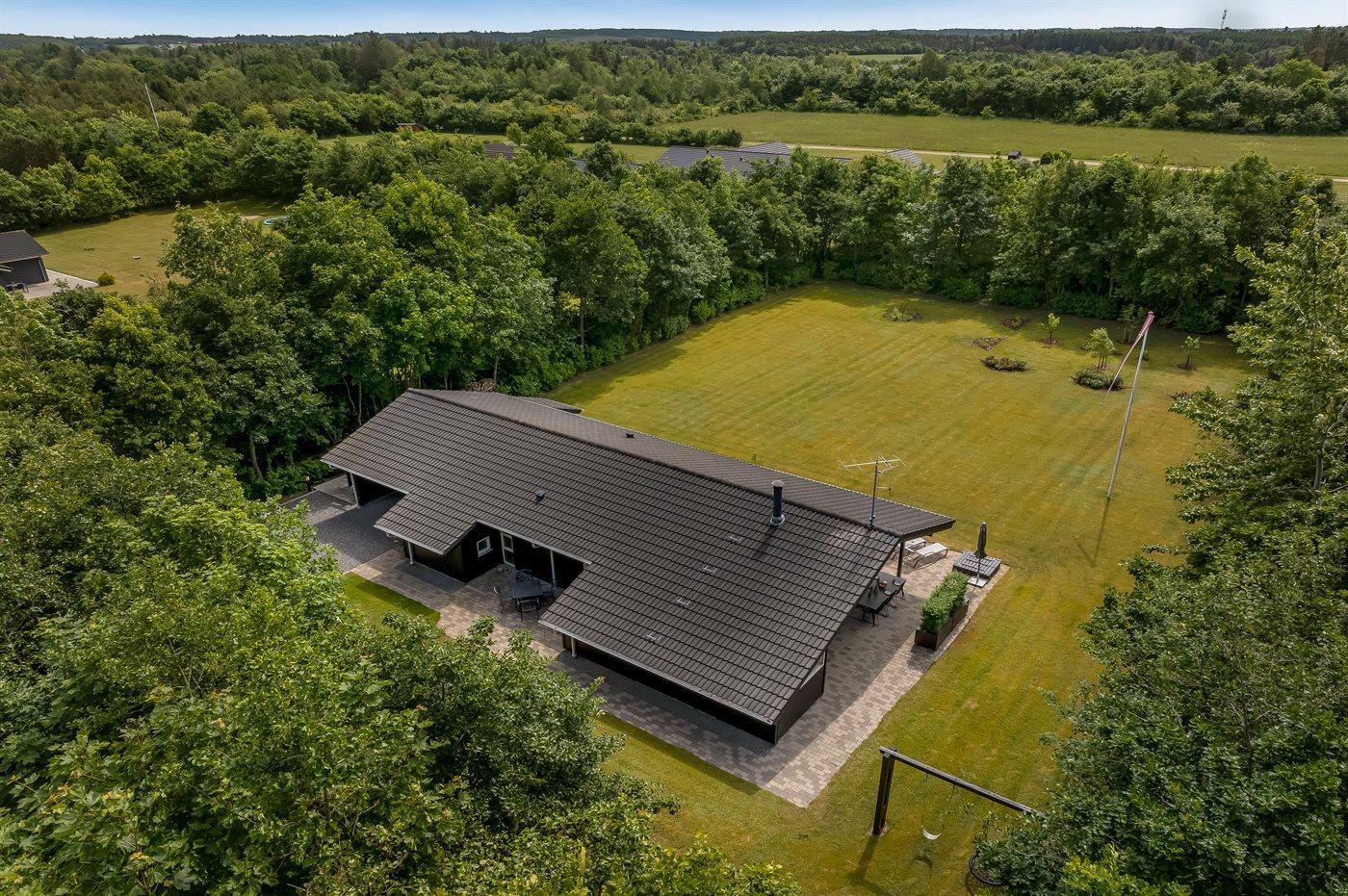 De vakantiewoning is gelegen op een 2510 m² groot natuural grond. De grond is omheind. Afstand tot de fjord 500 m. Dichtstbijzijnde winkel 1500 m. Bij de vakantiewoning hoort 80 m² terras. Daarnaast is er een 20 m² groot overdekt terras. Gereedschapsruimte. Schommel. Zandbak. Carport ter beschikking. Parkeerplaats bij het huis.