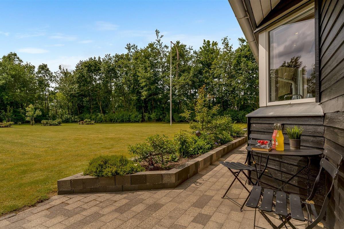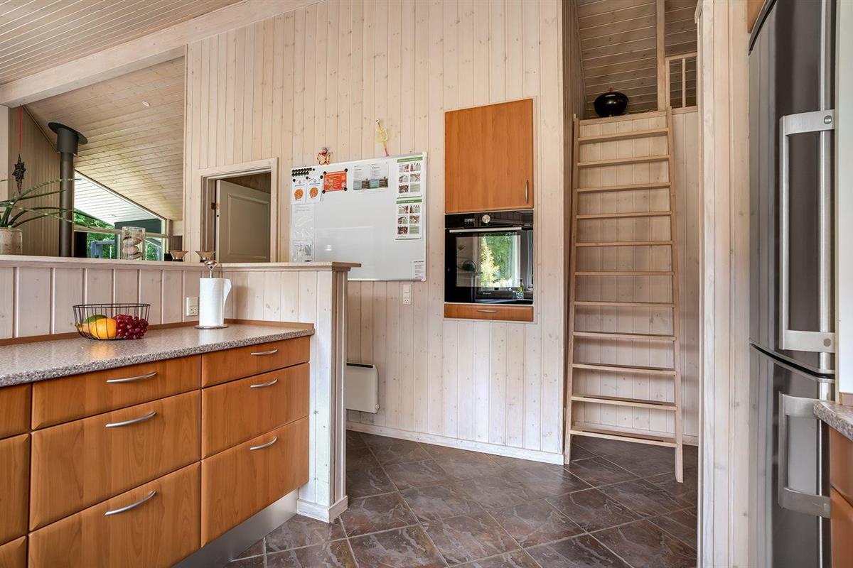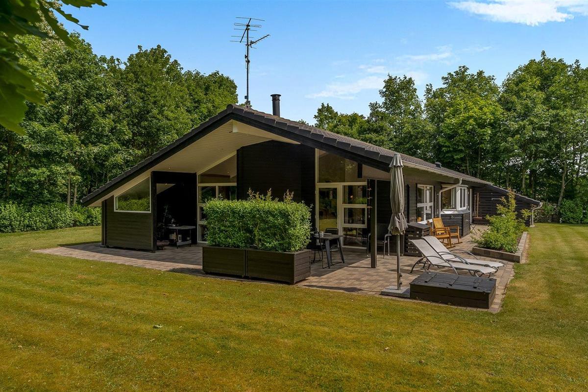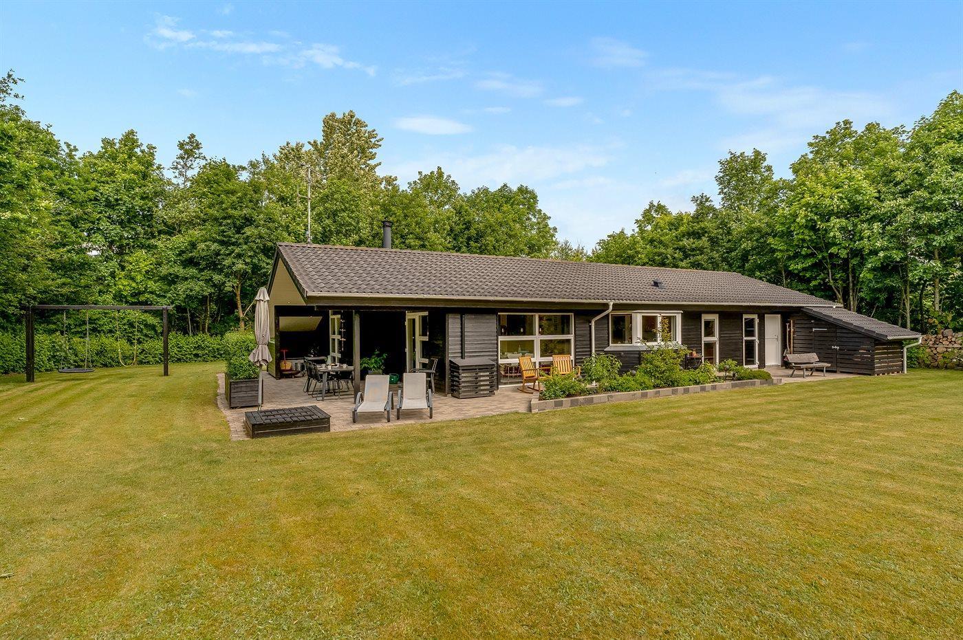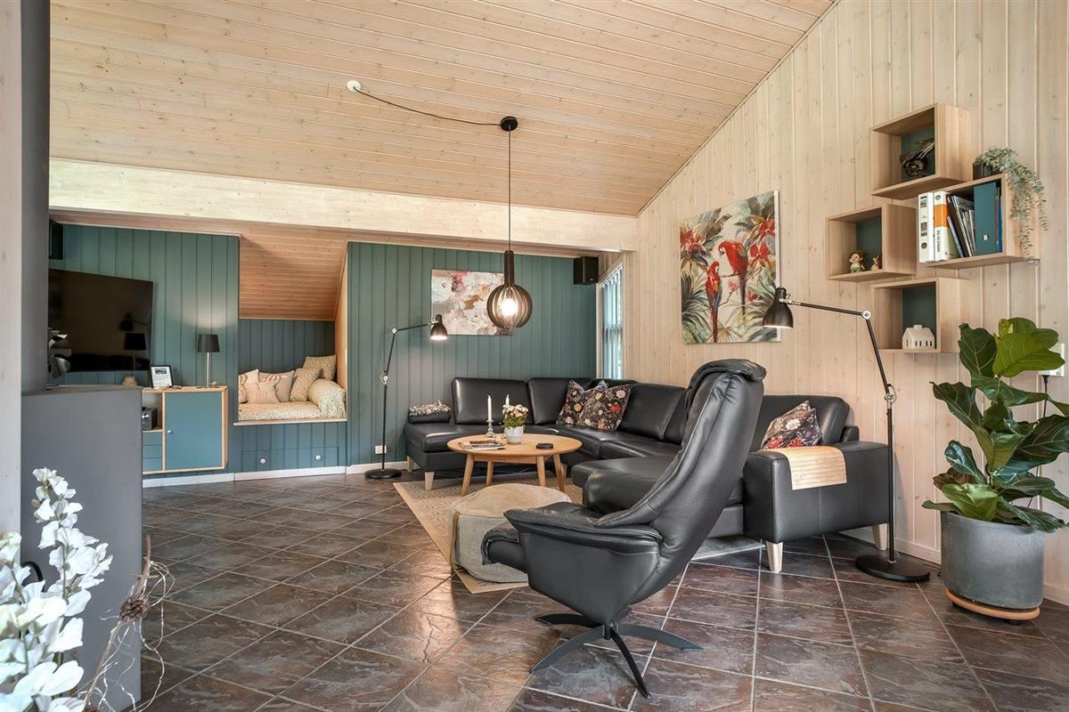 De vakantiewoning is gelegen op een 2510 m² groot natuural grond. De grond is omheind. Afstand tot de fjord 500 m. Dichtstbijzijnde winkel 1500 m. Bij de vakantiewoning hoort 80 m² terras. Daarnaast is er een 20 m² groot overdekt terras. Gereedschapsruimte. Schommel. Zandbak. Carport ter beschikking. Parkeerplaats bij het huis.