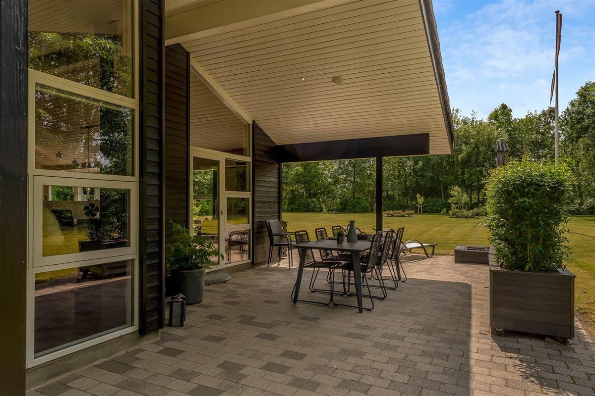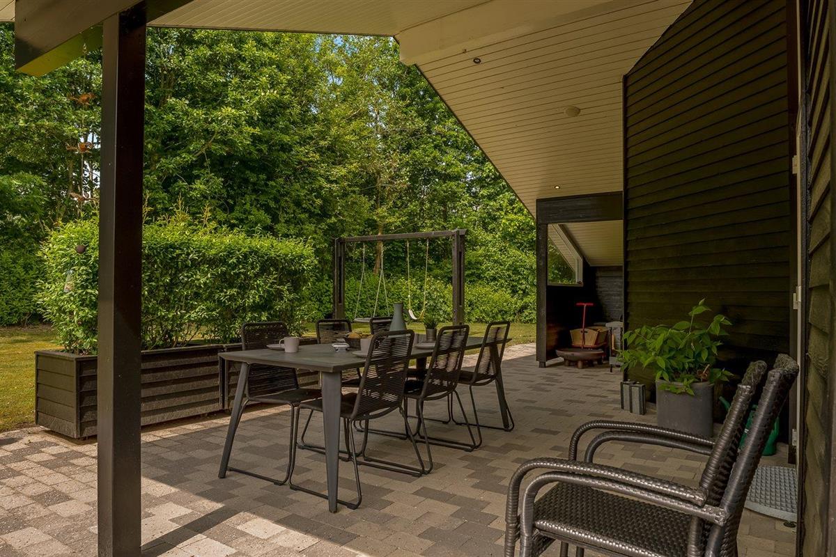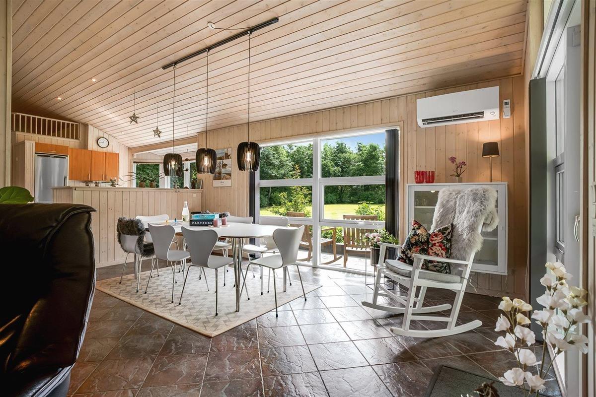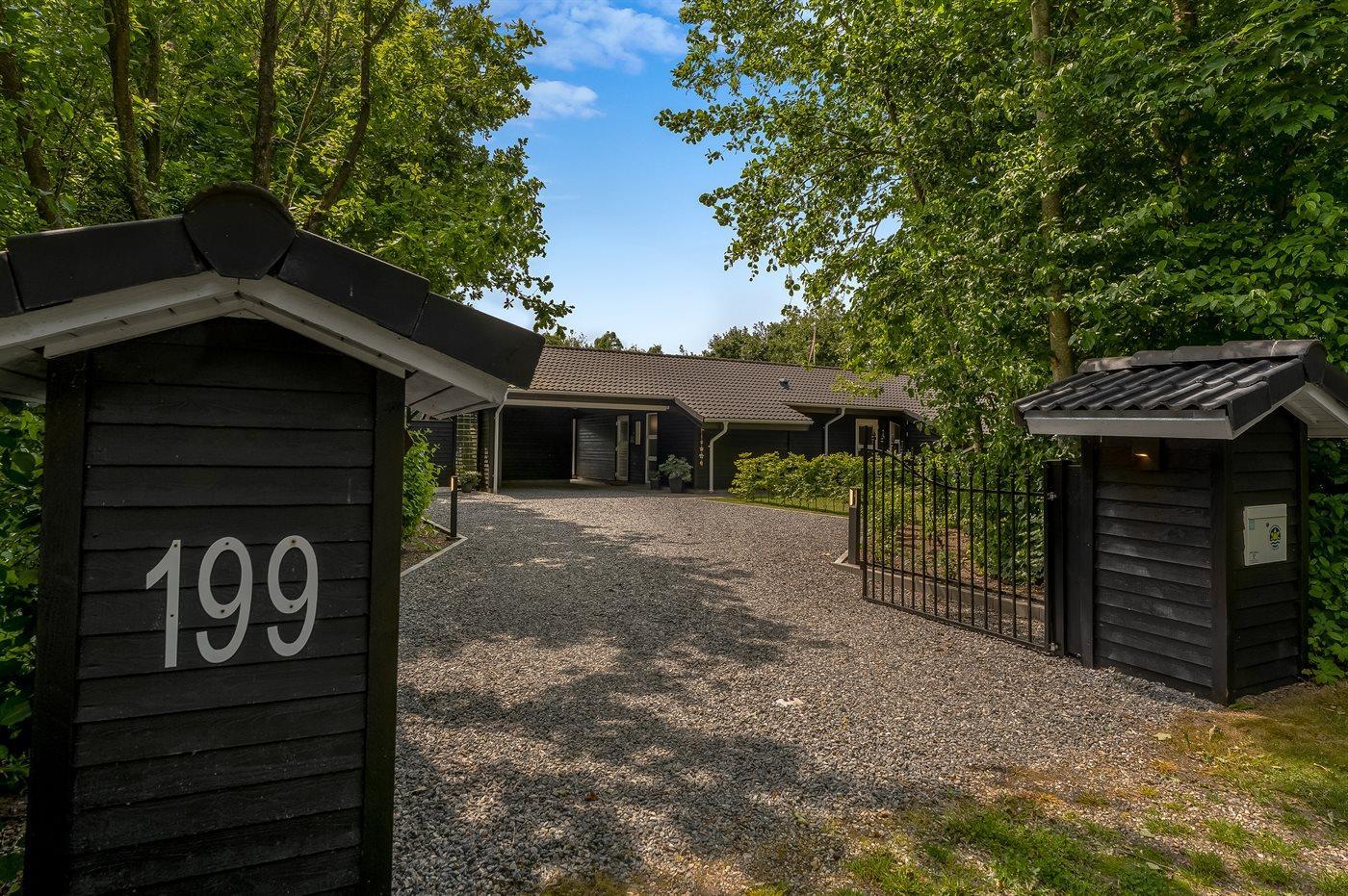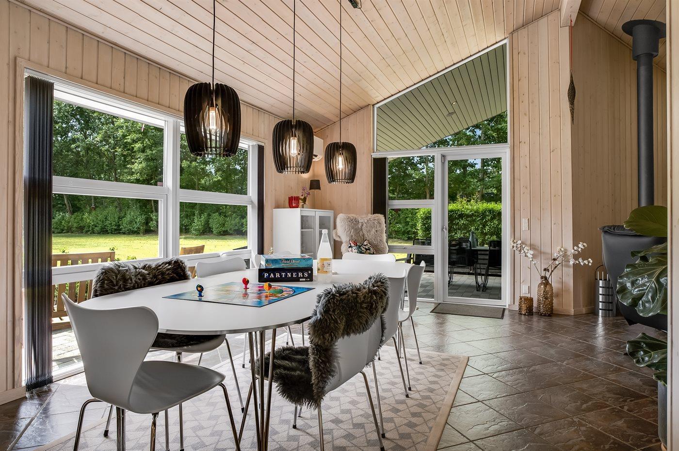 De vakantiewoning is gelegen op een 2510 m² groot natuural grond. De grond is omheind. Afstand tot de fjord 500 m. Dichtstbijzijnde winkel 1500 m. Bij de vakantiewoning hoort 80 m² terras. Daarnaast is er een 20 m² groot overdekt terras. Gereedschapsruimte. Schommel. Zandbak. Carport ter beschikking. Parkeerplaats bij het huis.