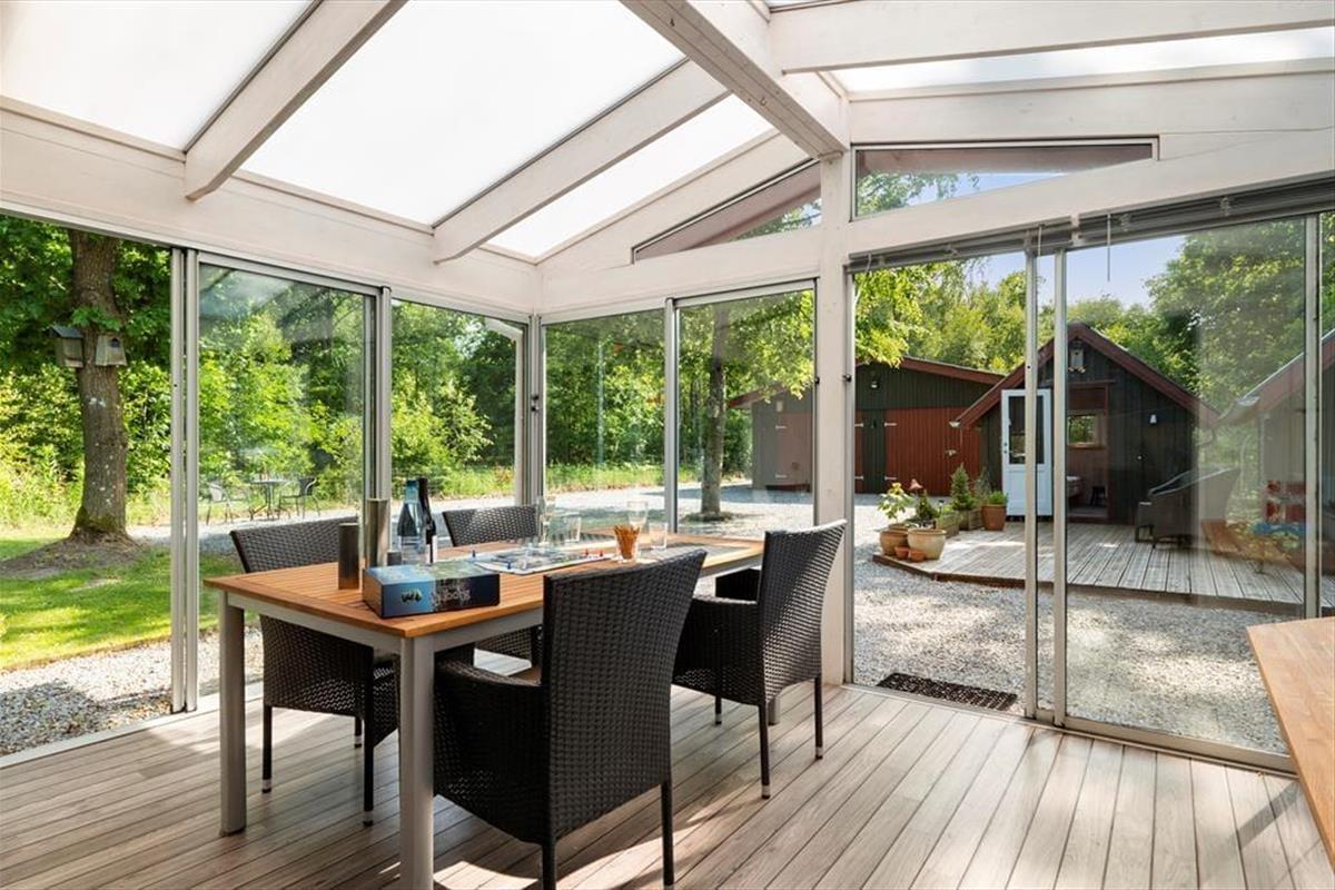 Draußen erstreckt sich ein großes Naturgrundstück rund um das Haus, und du spürst schnell diese besondere Ruhe, die man nur erlebt, wenn man von Grün und Vogelgezwitscher umgeben ist. Das gesamte Grundstück ist eingezäunt, sodass sich Kinder und Hunde frei und sicher bewegen können – ideal also, um einfach zu entspannen und ganz im Moment zu sein. Mach es dir in einem Gartenstuhl gemütlich, genieße deinen Nachmittagskaffee in der Sonne oder decke den Tisch für ein Abendessen unter freiem Himmel. Hier gibt es reichlich Gelegenheit, aktiv zu sein – oder einfach nur die Stille und die friedliche Atmosphäre auf sich wirken zu lassen. Der Wintergarten dient dabei als wunderbare Verbindung zwischen Innen- und Außenbereich – und an kühleren Abenden ist es der perfekte Ort, um die Urlaubsstimmung bei Decken und Kerzenschein fortzusetzen.