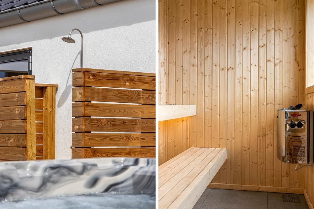 Draußen erwartet dich eine beeindruckende Terrassenlandschaft mit überdachten und offenen Bereichen, wo du das Leben im Freien bei jedem Wetter genießen kannst. Beginne den Tag mit einer erfrischenden Außendusche und beende ihn mit einem entspannenden Bad im Außen-Whirlpool. Das großzügige Grundstück eignet sich perfekt für Spiel und Aktivitäten, während die überdachte Terrasse zu gemütlichen Grillabenden oder einer ruhigen Zeit mit einem guten Buch einlädt. Hier kannst du deinen Morgenkaffee im Sonnenaufgang genießen oder den Tag mit einem Glas Wein im Sonnenuntergang ausklingen lassen.