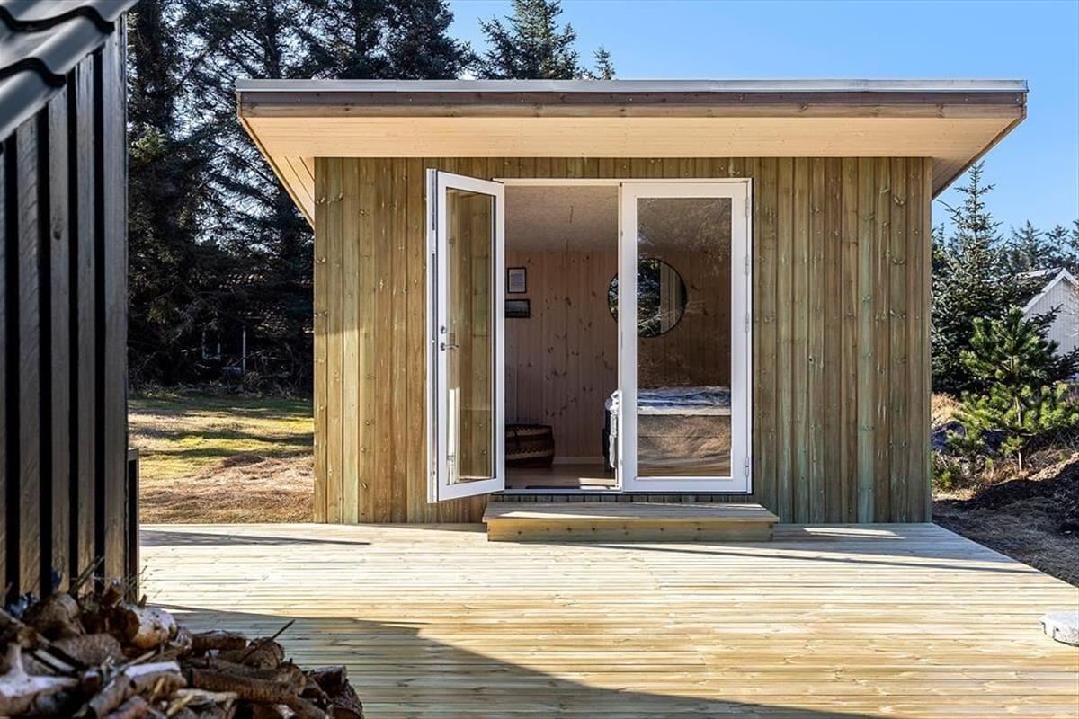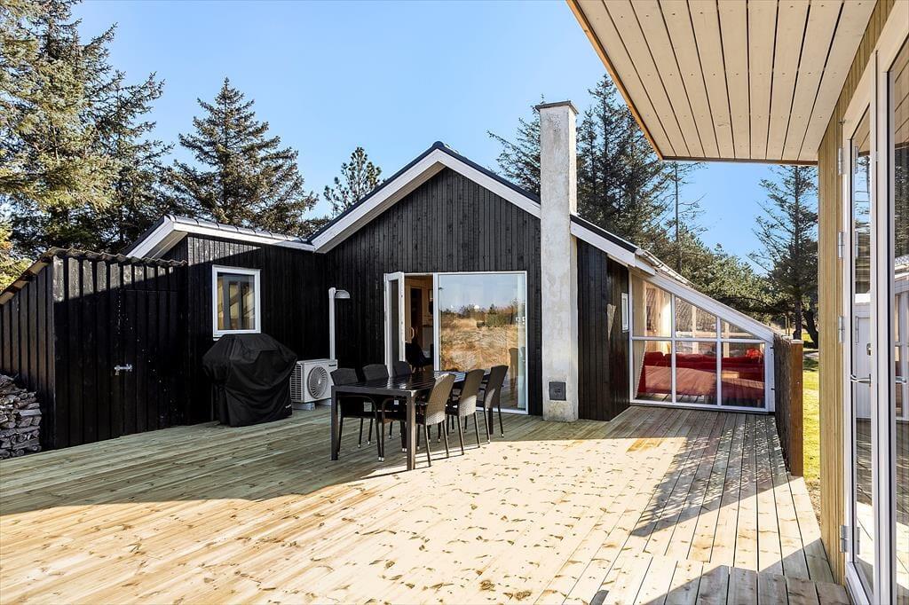 Draußen gibt es mehrere große Terrassenbereiche mit verschiedenen windgeschützten Ecken für Entspannung unter freiem Himmel. Die Terrassen umgeben das Ferienhaus, sodass immer ein sonniges Plätzchen zu finden ist, und der Garten ist eine ruhige Oase, in der die Natur ganz nah ist. Genieße morgens deinen Kaffee mit Blick ins Grüne und beende den Tag mit Grillabenden und Gesprächen unter den Sternen. Hier kann jeder Tag in Harmonie mit der Umgebung beginnen und enden.