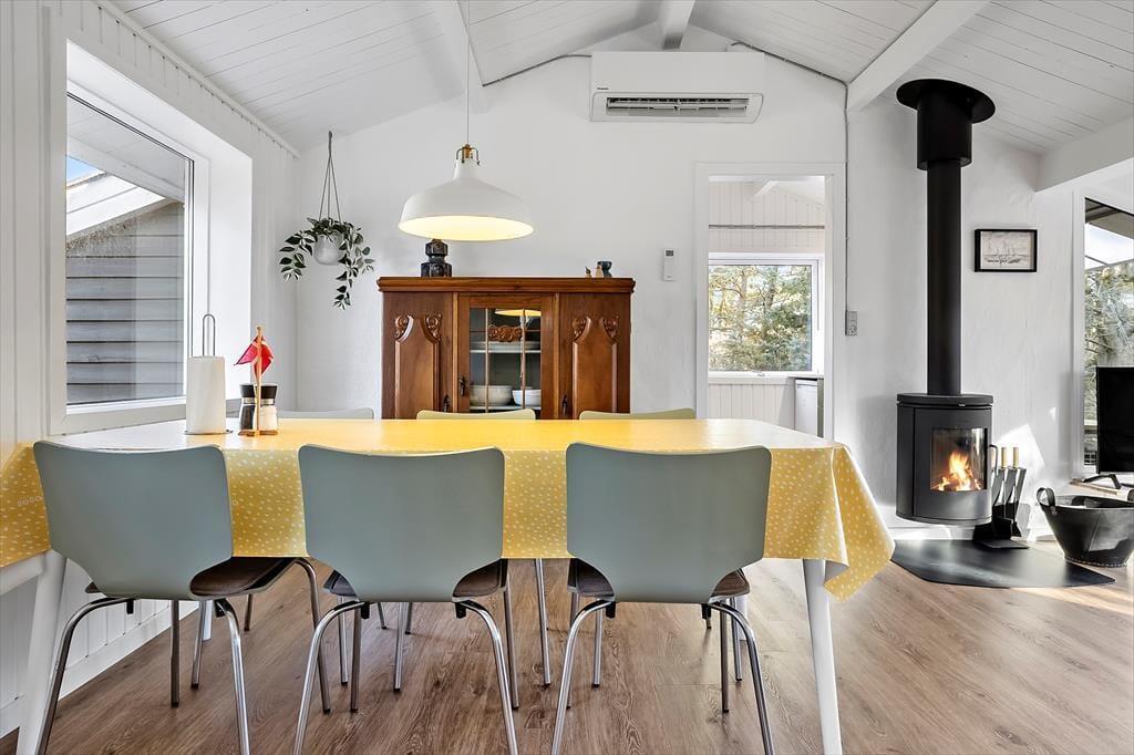 Schon beim Betreten des Ferienhauses in der Sandtornvej 15 spürst du, dass hier viel Wert auf liebevolle Details gelegt wurde. Die Renovierung im Jahr 2025 hat dem Haus einen frischen und modernen Ausdruck verliehen, ohne dabei den ursprünglichen Charme zu verlieren. Das Wohnzimmer bildet das Herzstück des Hauses – vor allem dank des großen Panoramafensters, das viel Licht hereinlässt und ein Gefühl der Nähe zur Natur schafft. Hier kannst du dich mit einem guten Buch auf dem Sofa zurücklehnen, während das Feuer im Kamin knistert und sich langsam wohlige Wärme im Raum ausbreitet. Küche und Wohnbereich gehen fließend ineinander über und sorgen dafür, dass man auch beim Kochen oder Spielen stets zusammen sein kann. Die Atmosphäre ist entspannt und heimelig – perfekt für kurze Auszeiten oder längere Ferien.