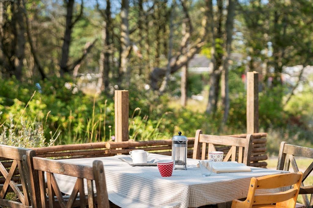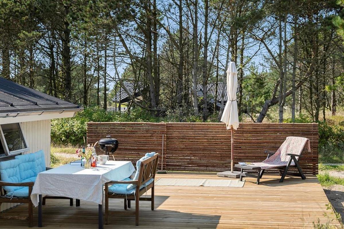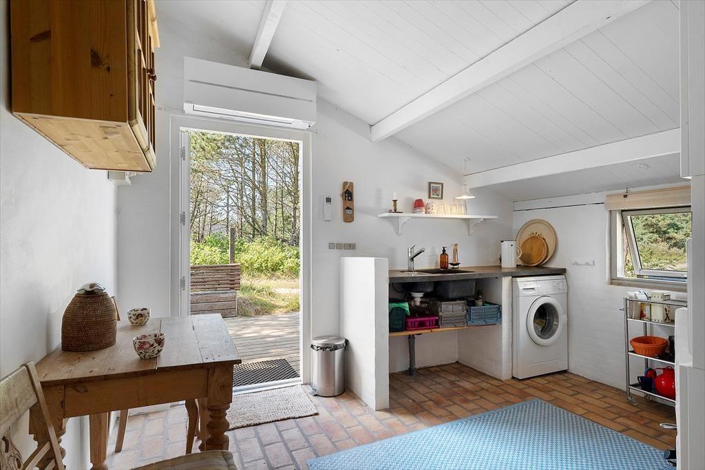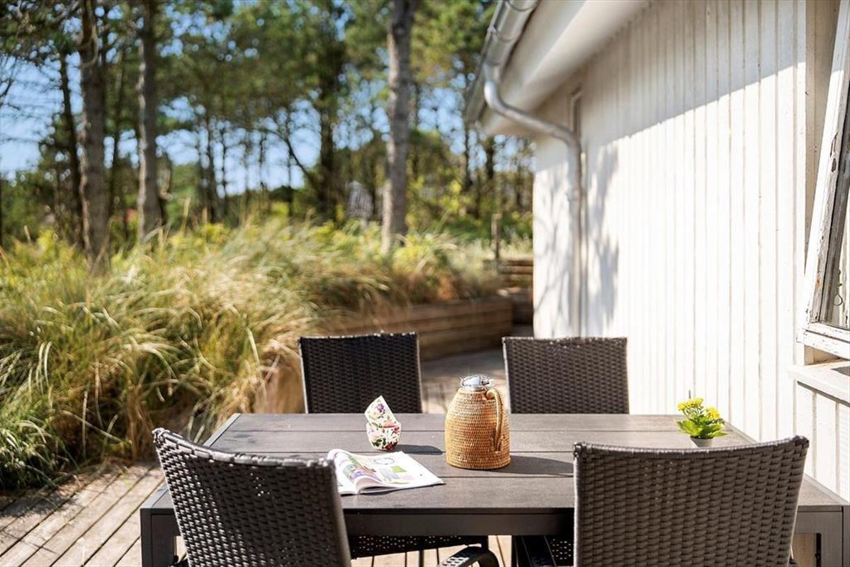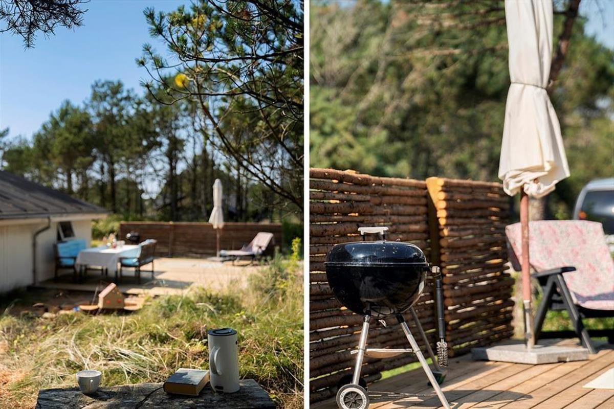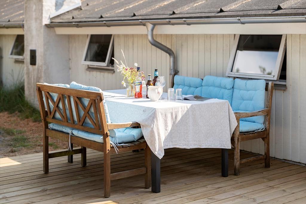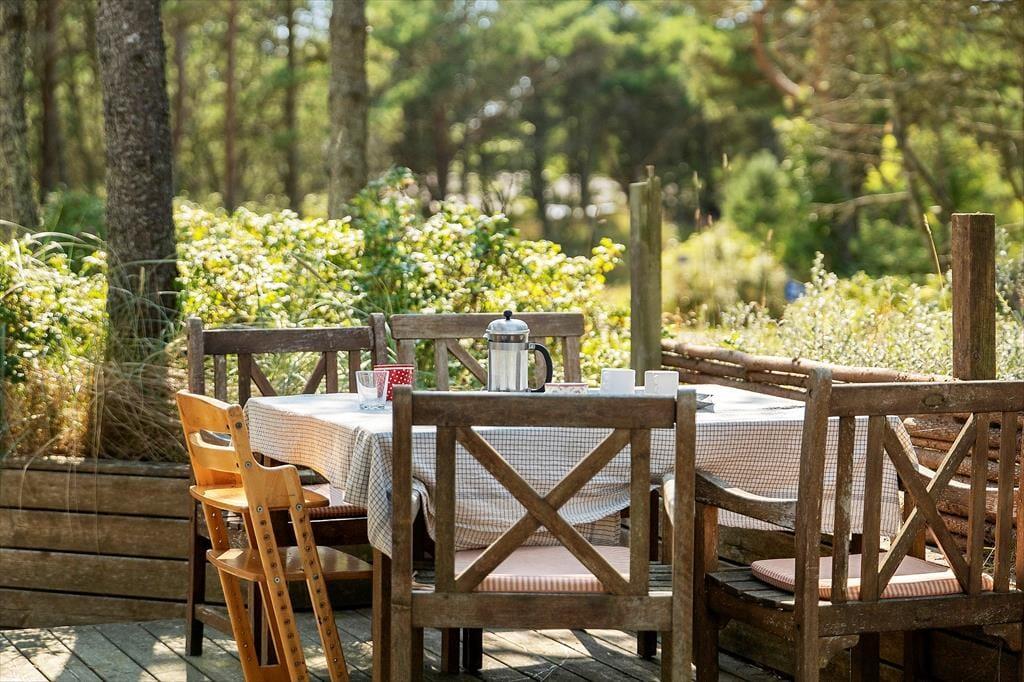 Draußen erwarten dich neu angelegte Terrassenflächen, die sowohl Sonnenliebhaber als auch Schattensucher glücklich machen. Ob Frühstück im Freien, ein gutes Glas Wein am Abend oder einfach ein Buch in der Nachmittagssonne – hier findest du immer einen Platz für dich. Die umliegende Natur sorgt für Ruhe und Privatsphäre, während du die typische Dünenlandschaft von Vorupør Klit genießt. Die Terrasse wird schnell zum Lieblingsplatz – vielleicht mit einer Decke um die Schultern und dem Klang der Natur im Ohr.