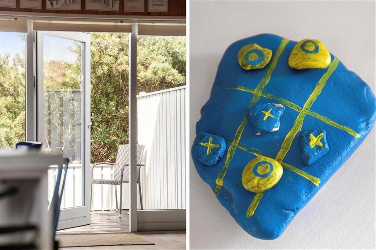 Das Ferienhaus liegt auf einem kleinen Grundstück in kurzer Entfernung zu Einkaufsmöglichkeiten, Restaurants und dem Strand – und dennoch fühlt sich die kleine Terrasse wie eine private Oase an. Ob du den Tag mit einem Kaffee in der Morgensonne beginnst oder mit einem Abendessen unter freiem Himmel ausklingen lässt – die Umgebung bietet den perfekten Rahmen für eine Auszeit, in der das Einfache und Nahe wieder mehr Raum bekommt. Hier können die Kinder spielen, während die Erwachsenen die Ruhe und Freiheit im Freien genießen – vielleicht begleitet vom Rufen der Möwen und dem Rauschen des Windes in den Baumkronen. Es ist kein großer, beeindruckender Garten, sondern vielmehr ein kleiner, gemütlicher Ort, an dem du Sonne, Windschutz und Entspannung findest. Und wenn die Dunkelheit hereinbricht und die Temperaturen sinken, ist es ganz einfach, sich nach drinnen zurückzuziehen und die Gemütlichkeit am Holzofen fortzusetzen. Das Leben im Freien bedeutet hier, das Tempo zu drosseln und zum Einfachen zurückzufinden – genau das, worum es im Urlaub geht.