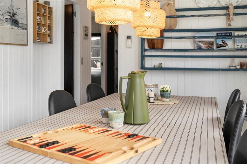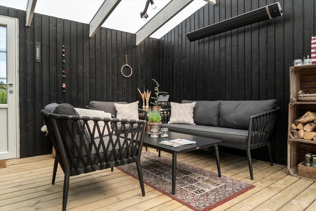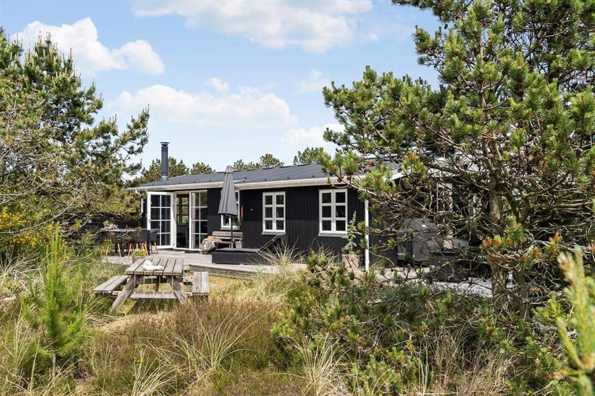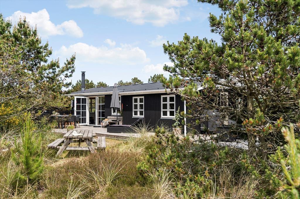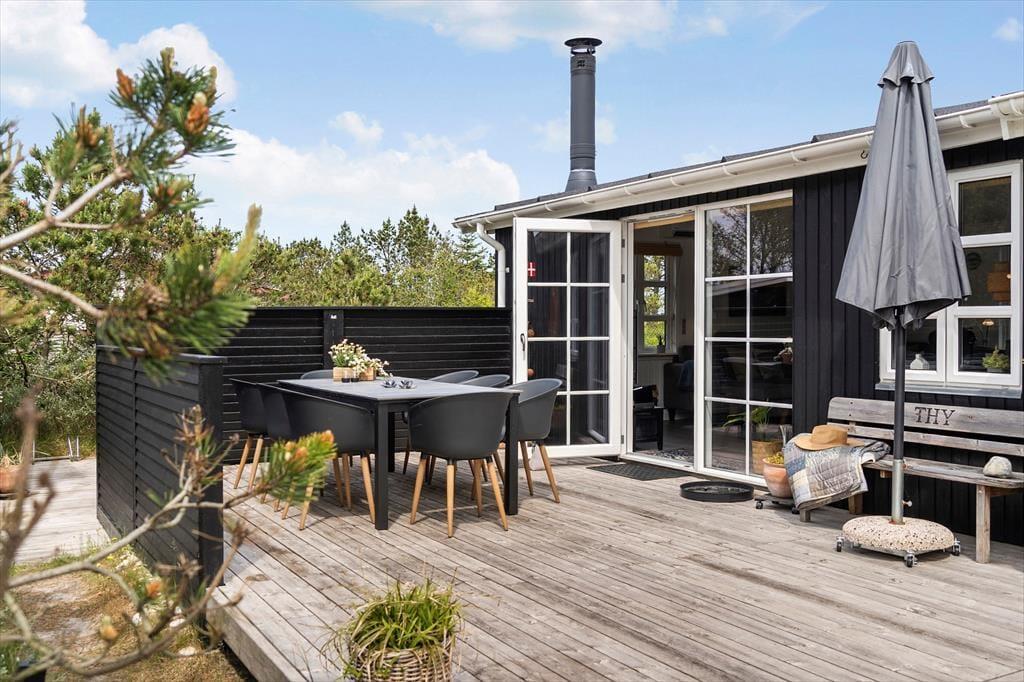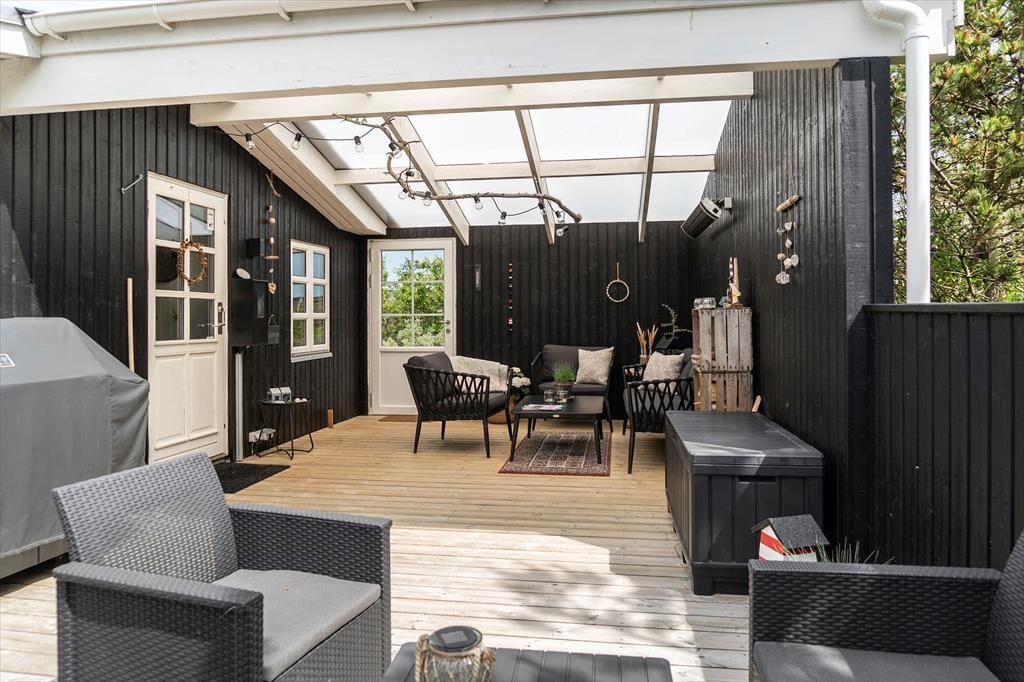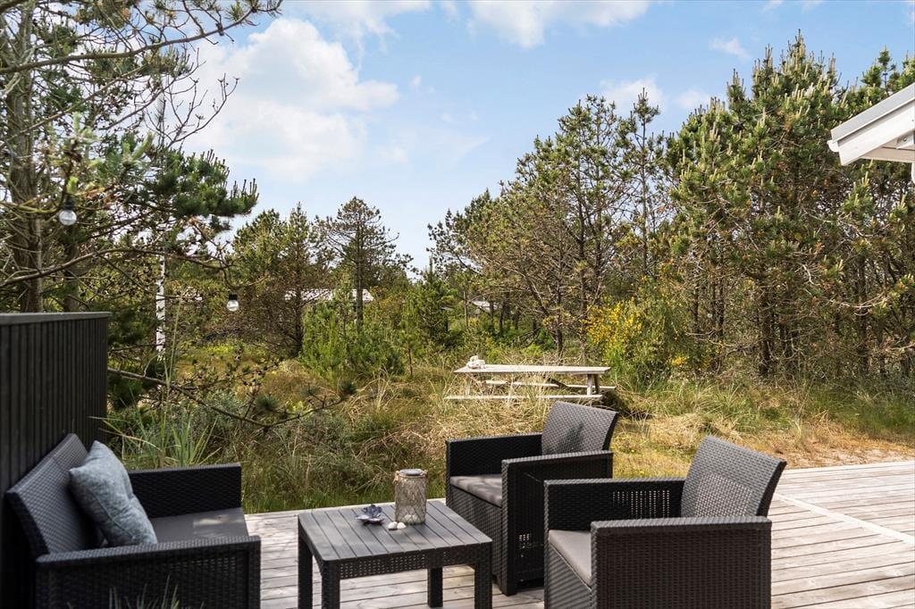Auch draußen zeigt sich das Ferienhaus von seiner besten Seite: Große offene sowie überdachte Terrassenbereiche bieten dir zahlreiche Möglichkeiten, die frische Luft und das besondere Licht an der Nordseeküste zu genießen. Ob in der Morgensonne mit dem ersten Kaffee, in der Mittagsruhe mit einem guten Buch oder abends beim Grillen – die gemütlichen Garten- und Loungemöbel laden jederzeit zum Verweilen ein. Die ruhige Lage in Vorupør Klit sorgt dafür, dass du dich vollkommen entspannen und die Geräusche der Natur auf dich wirken lassen kannst. Lausche dem Gesang der Vögel und dem Rascheln der Dünengräser – der perfekte Rahmen für eine Auszeit mit Tiefgang.