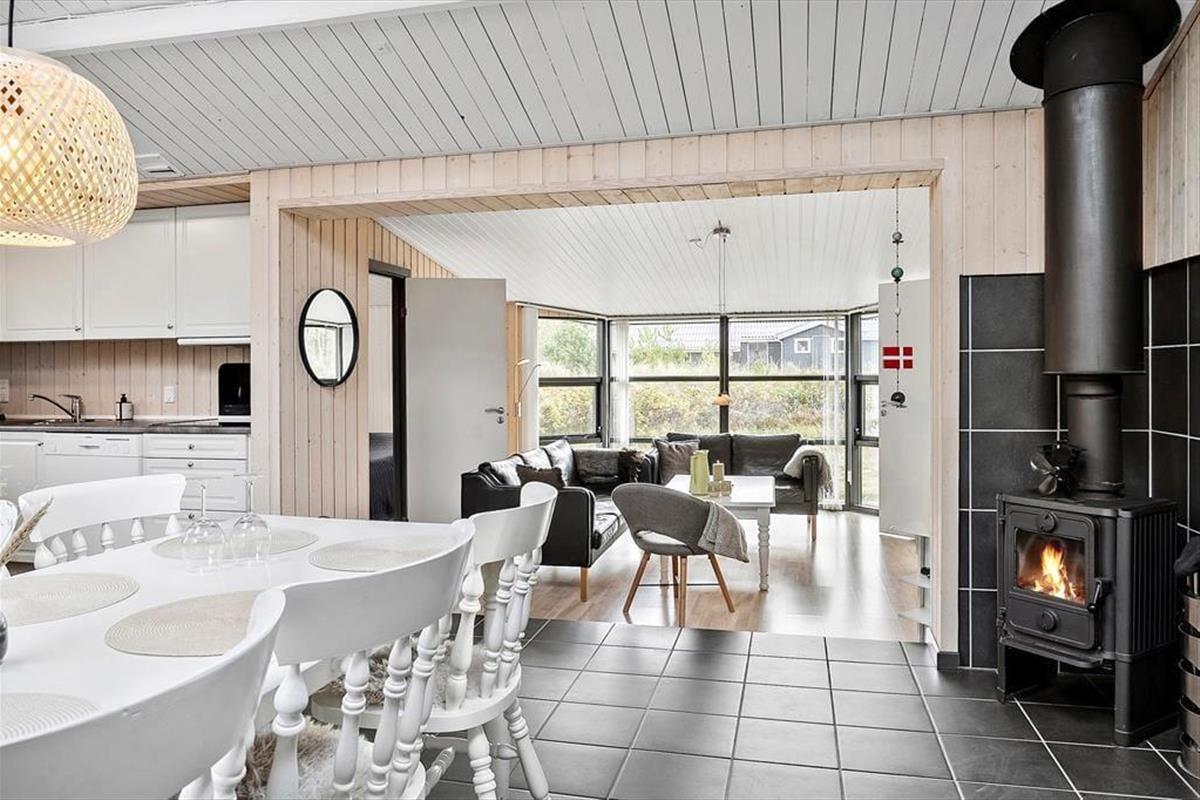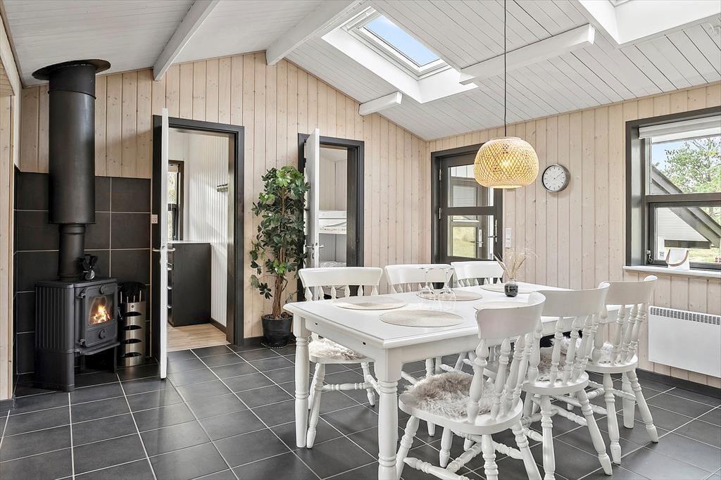 Im Inneren wirst du von einer geräumigen und hellen Atmosphäre begrüßt, bei der die großen Fensterfronten und Dachfenster für einen außergewöhnlichen Lichteinfall sorgen. Die offene Raumaufteilung vermittelt ein Gefühl von Freiheit und Platz, und du wirst dich hier schnell zu Hause fühlen. Das Ferienhaus ist sowohl energieeffizient als auch gemütlich, dank einer Luft-Wärmepumpe und dem knisternden Kaminofen, der an kalten Abenden Wärme und Gemütlichkeit verbreitet. Die versetzte Raumaufteilung schafft eine feine Trennung zwischen dem Essbereich und dem Wohnzimmer, sodass du sowohl gemeinsam essen als auch in einer ruhigen Ecke entspannen kannst. Mit mehreren guten Schlafzimmern und einem praktischen Eingang ist das Haus ideal für kleine und große Familien.