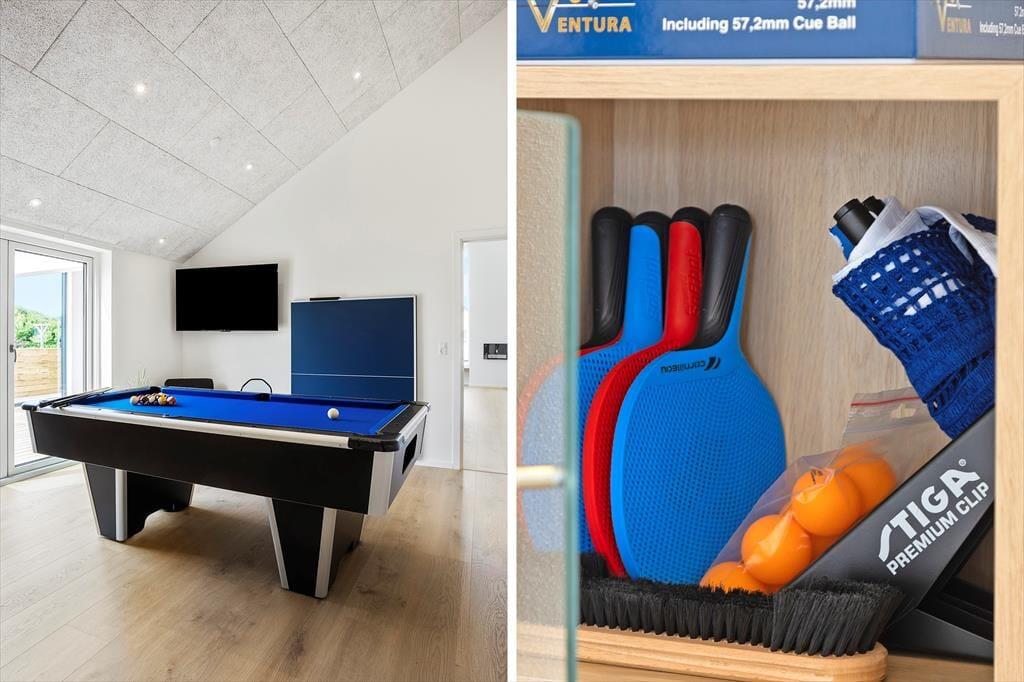Tritt ein in dieses geschmackvoll eingerichtete Ferienhaus und werde von einer hellen und modernen Atmosphäre empfangen, die von Qualität zeugt. Das Haus ist mit Fokus auf Ästhetik und Funktionalität gestaltet, was den perfekten Rahmen für gemütliche Ferienmomente schafft. Das geräumige Wohnzimmer ist mit komfortablen Möbeln und großen Fenstern ausgestattet, die viel natürliches Licht hereinlassen und eine schöne Aussicht auf die umliegenden Landschaften bieten. Im gut ausgestatteten Aktivitätsraum kann sich die ganze Familie bei Spielen und Spaß versammeln – hier gibt es sowohl Tischtennis als auch einen Pooltisch, der stundenlange Unterhaltung und Wettbewerb garantiert.