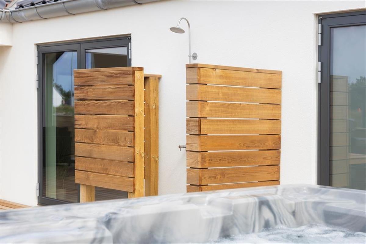 Draußen öffnet sich eine Welt voller Luxus und Komfort. Die große Terrassenlandschaft bietet sowohl offene als auch überdachte Bereiche, sodass ihr das Leben im Freien bei jedem Wetter genießen könnt. Beginne den Tag mit einer erfrischenden Außendusche unter freiem Himmel und schließe ihn mit Entspannung im Außenwhirlpool ab, wo ihr euch von den warmen Blasen aufwärmen lassen und die ruhige Umgebung genießen könnt. Das große Grundstück lädt zu Spiel und Aktivitäten ein, während die überdachte Terrasse ein perfekter Ort ist, um sich zum Grillen oder für eine ruhige Zeit mit einem guten Buch zu versammeln. Hier könnt ihr den Morgenkaffee im Sonnenaufgang genießen oder den Tag mit einem Glas Wein im Sonnenuntergang ausklingen lassen.