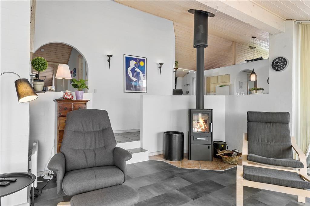 Betrete ein gepflegtes Ferienhaus, das sofort ein Gefühl von Gemütlichkeit vermittelt. Das Haus ist so gestaltet, dass es den Rahmen für Nähe und Entspannung bietet. Mit Platz für bis zu sechs Personen ist es ideal für Familienurlaube oder einen Aufenthalt mit Freunden. Das einladende Wohnzimmer ist das Herz des Hauses – hier knistert der Kaminofen und schafft eine warme Atmosphäre, die die Abende besonders gemütlich macht. Gleichzeitig sorgt der offene Grundriss für ein helles und luftiges Gefühl, in dem Küche, Essbereich und Wohnzimmer ineinander übergehen. Dies ist der Ort für Gesellschaftsspiele, leckere Mahlzeiten und lange Gespräche.