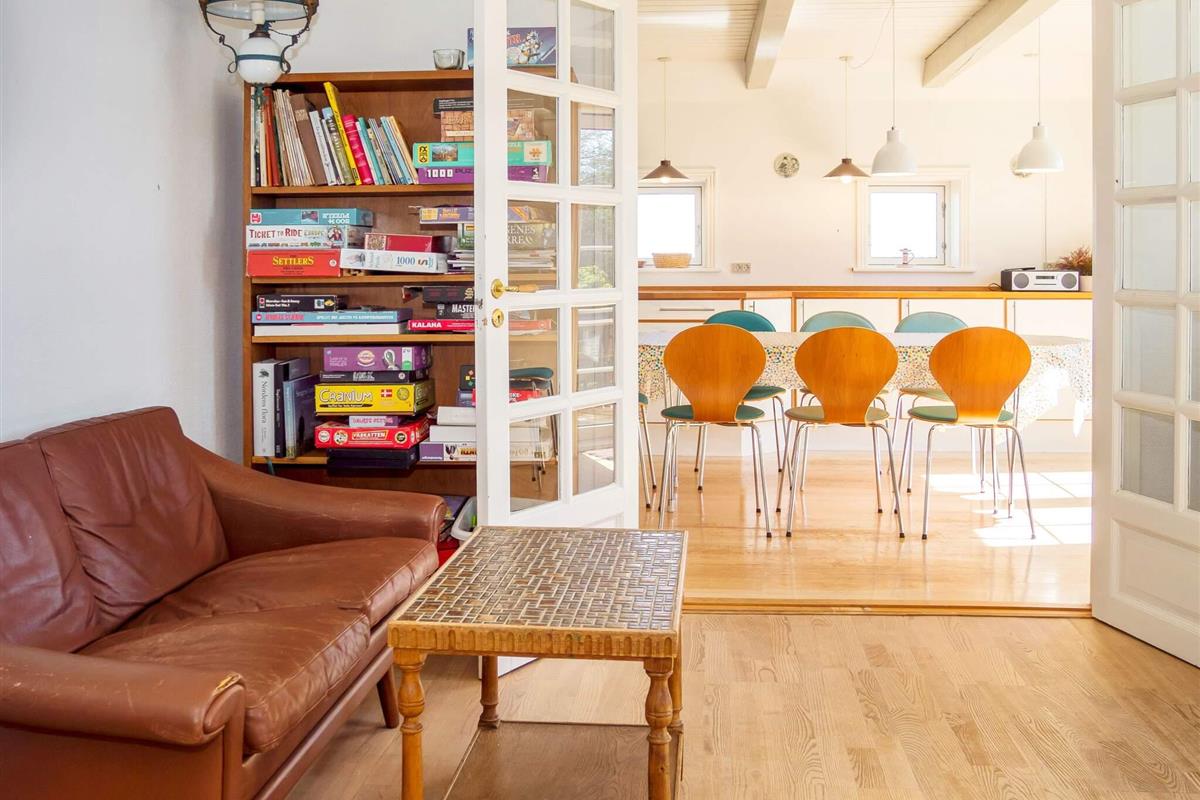 Auf einem sehr weitläufigen, 5.600 m2 großen Naturgrundstück auf der Heidefläche zwischen den Orten Nr. Vorupør und Stenbjerg liegt dieses geräumige Ferienhaus. Zum Haus gehört eine Sauna in den Dünen und eine faunareiche Umgebung. Sowohl von der Terrasse als auch vom Haus aus hat man einen schönen Blick zum umliegenden Naturgebiet, insbesondere vom Wohnzimmer oben im 1. Stock.