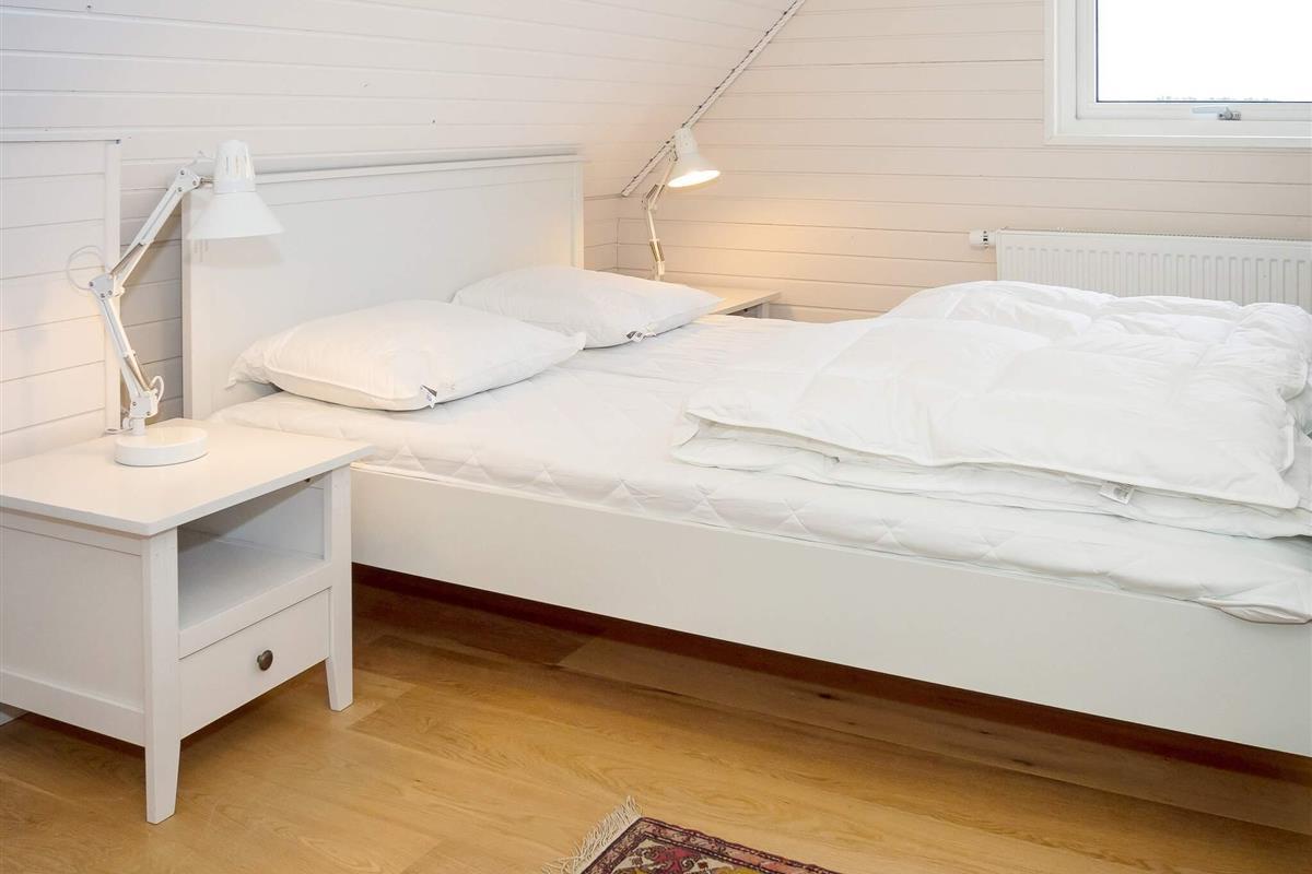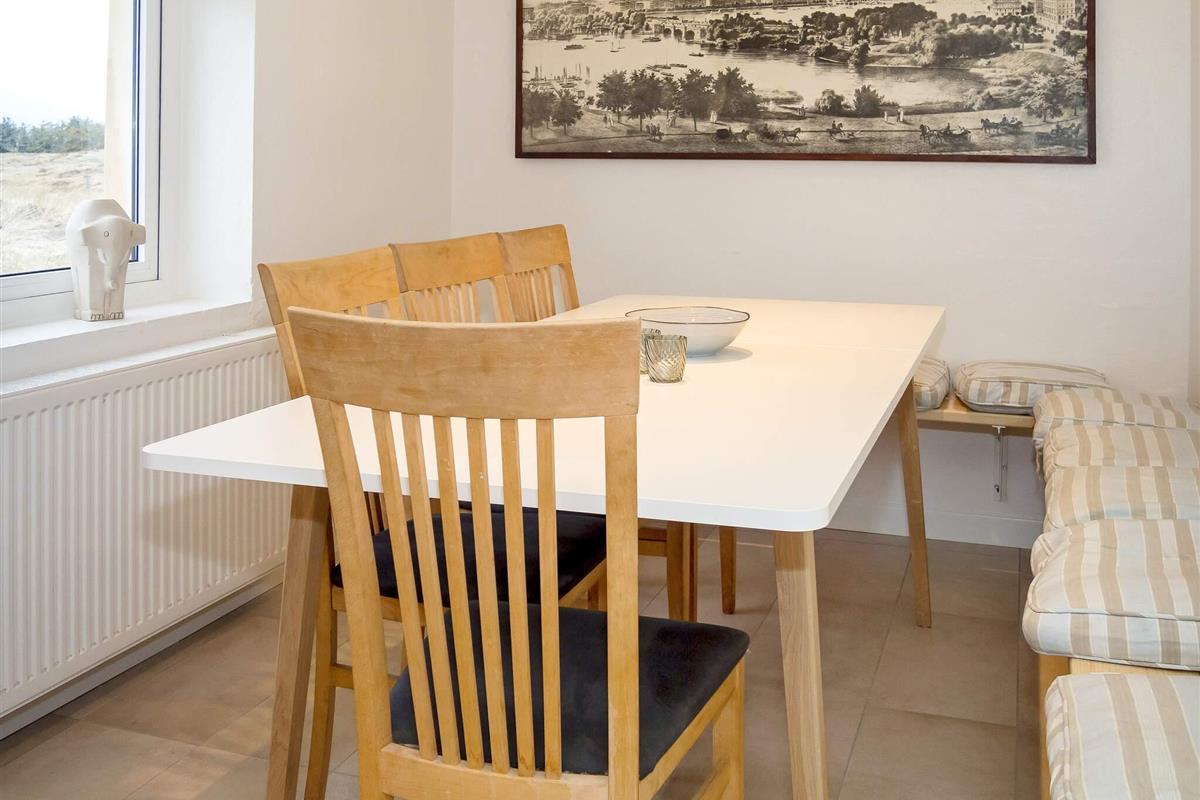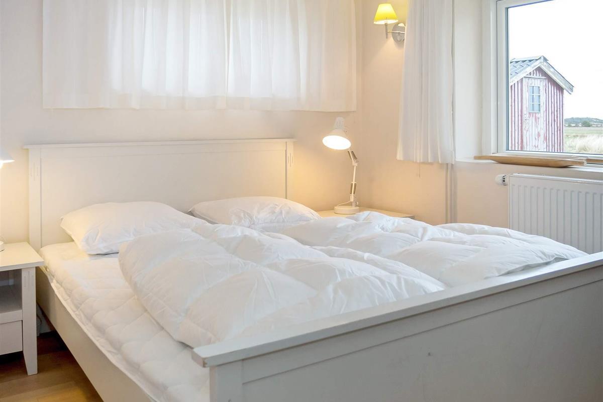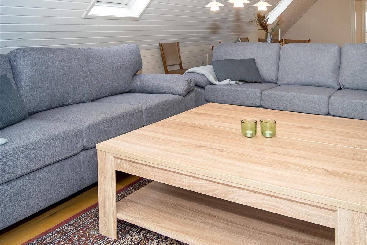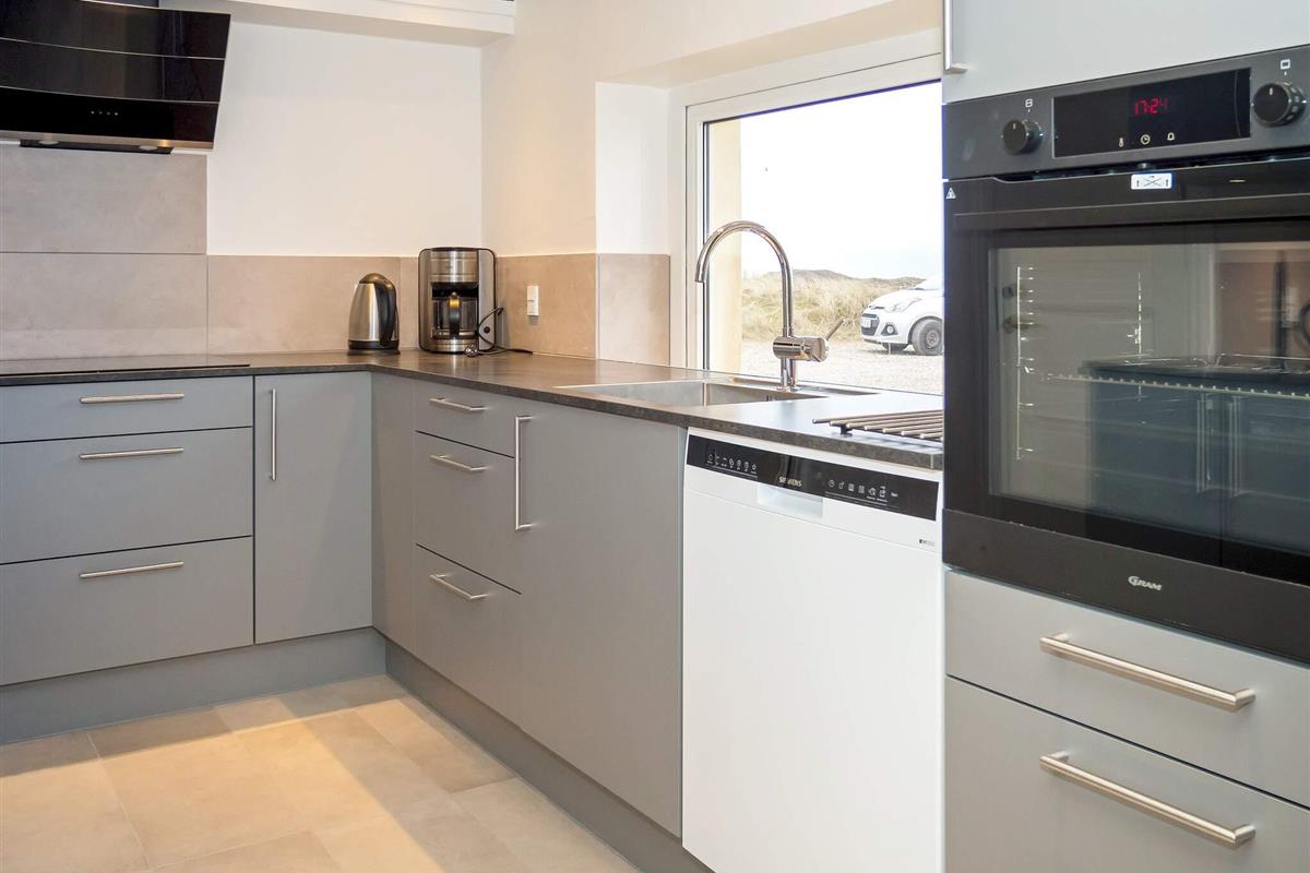 Die neue Küche von 2023 ist mit modernen Geräten, wie Spülmaschine, Ceranfeld, Mikrowelle und Gefriertruhe ausgestattet. Das Wohnzimmer verfügt über behagliche Möbel und einen Holzofen, der an kühlen Tagen gemütliche Wärme verbreitet. Für Unterhaltung sorgt der Flachbildschirm-TV, der dänische und deutsche Sender empfängt. Weiterhin sind im Erdgeschoss zwei Schlafzimmer mit Doppelbetten platziert.