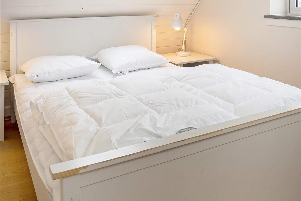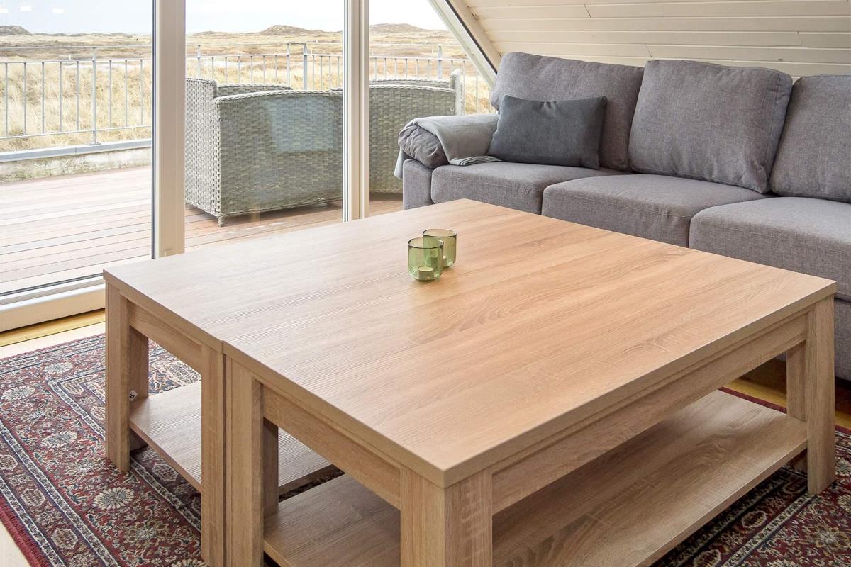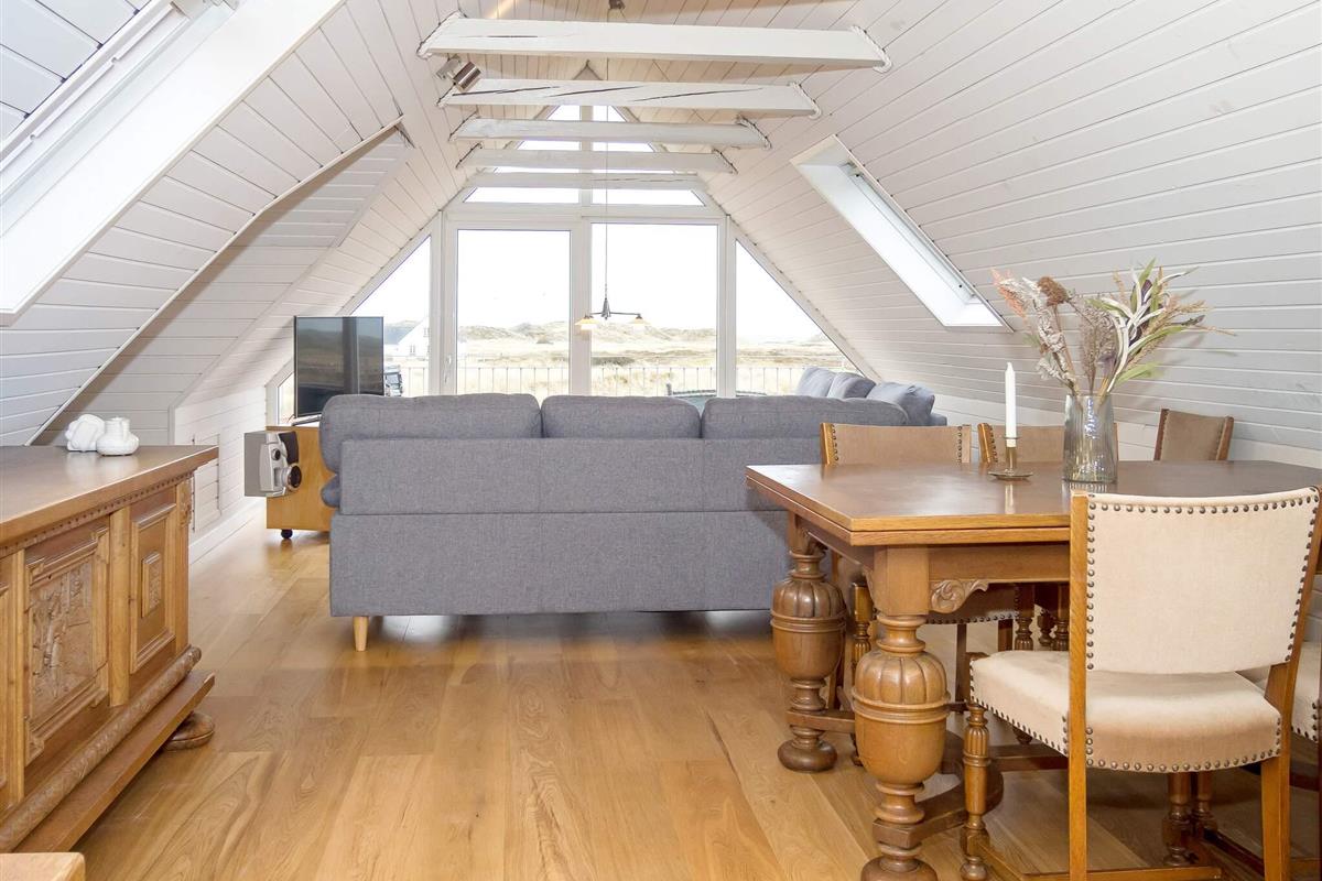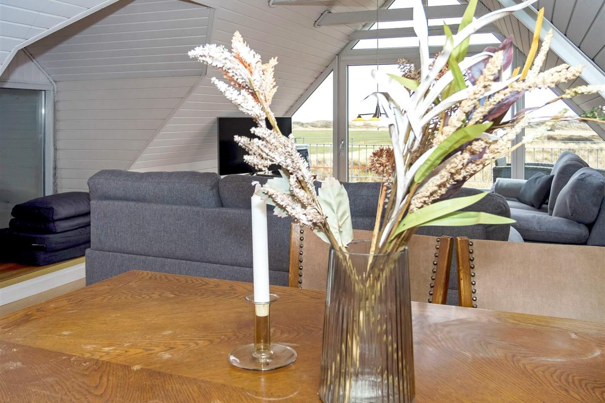 Oben im Dachgeschoss gibt es ein weiteres Wohnzimmer mit Holzfußboden, gemütlichen Möbeln und Flachbild-TV. Von hier kann man den Poolbereich unten einsehen oder auf den Balkon hinausgehen, von dem Sie eine herrliche Aussicht über die Dünen und die Nordsee haben. Im Obergeschoss befinden sich alle drei Schlafzimmer mit Doppelbett, eines zudem mit einem Zustellbett.