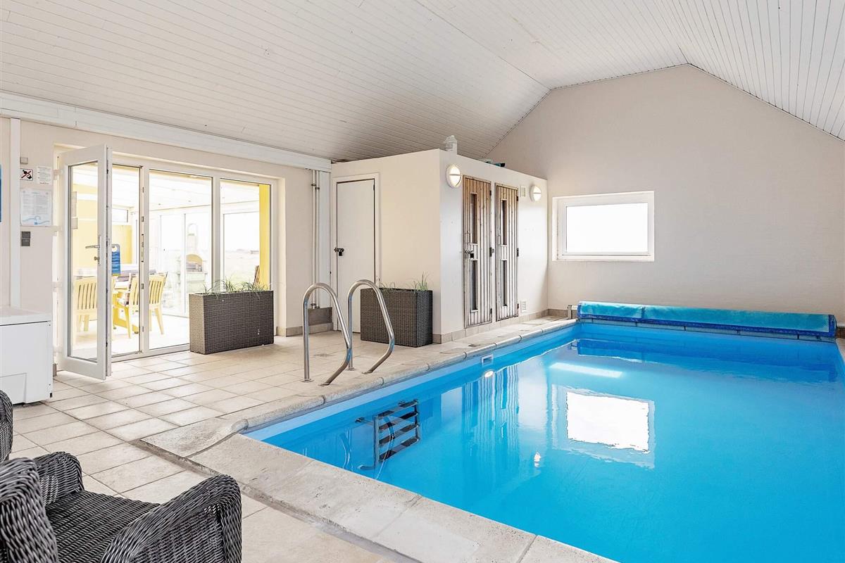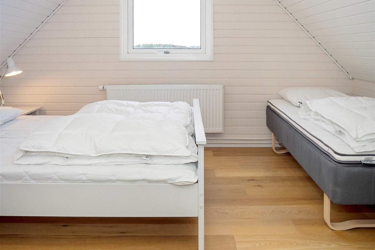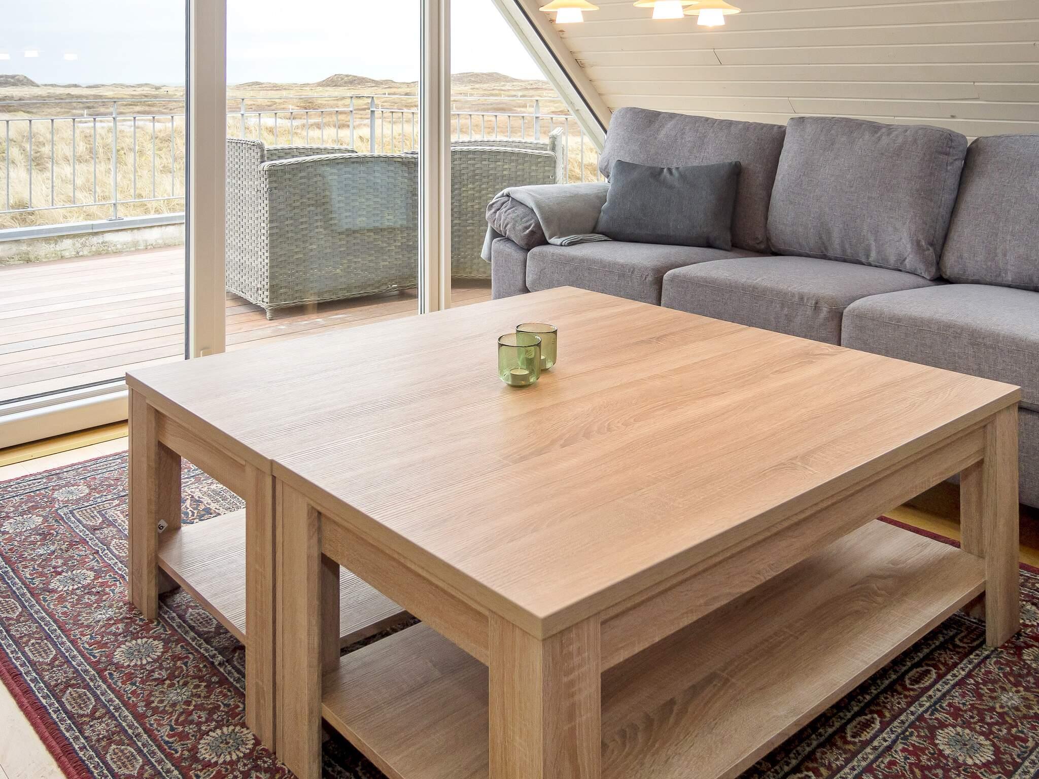 Oben im Dachgeschoss gibt es ein weiteres Wohnzimmer mit Holzfußboden, gemütlichen Möbeln und Flachbild-TV. Von hier kann man den Poolbereich unten einsehen oder auf den Balkon hinausgehen, von dem Sie eine herrliche Aussicht über die Dünen und die Nordsee haben. Im Obergeschoss befinden sich alle drei Schlafzimmer mit Doppelbett, eines zudem mit einem Zustellbett.