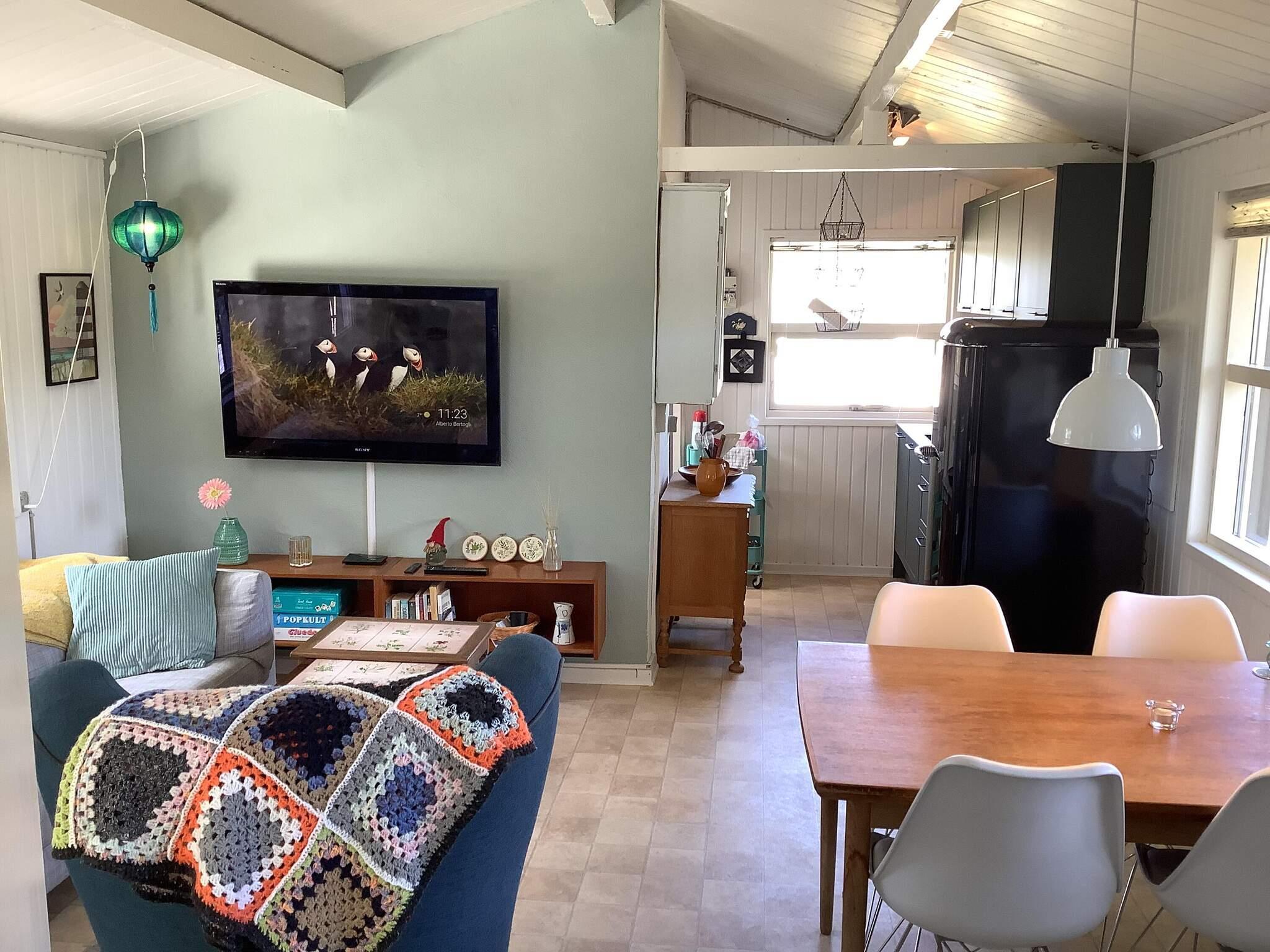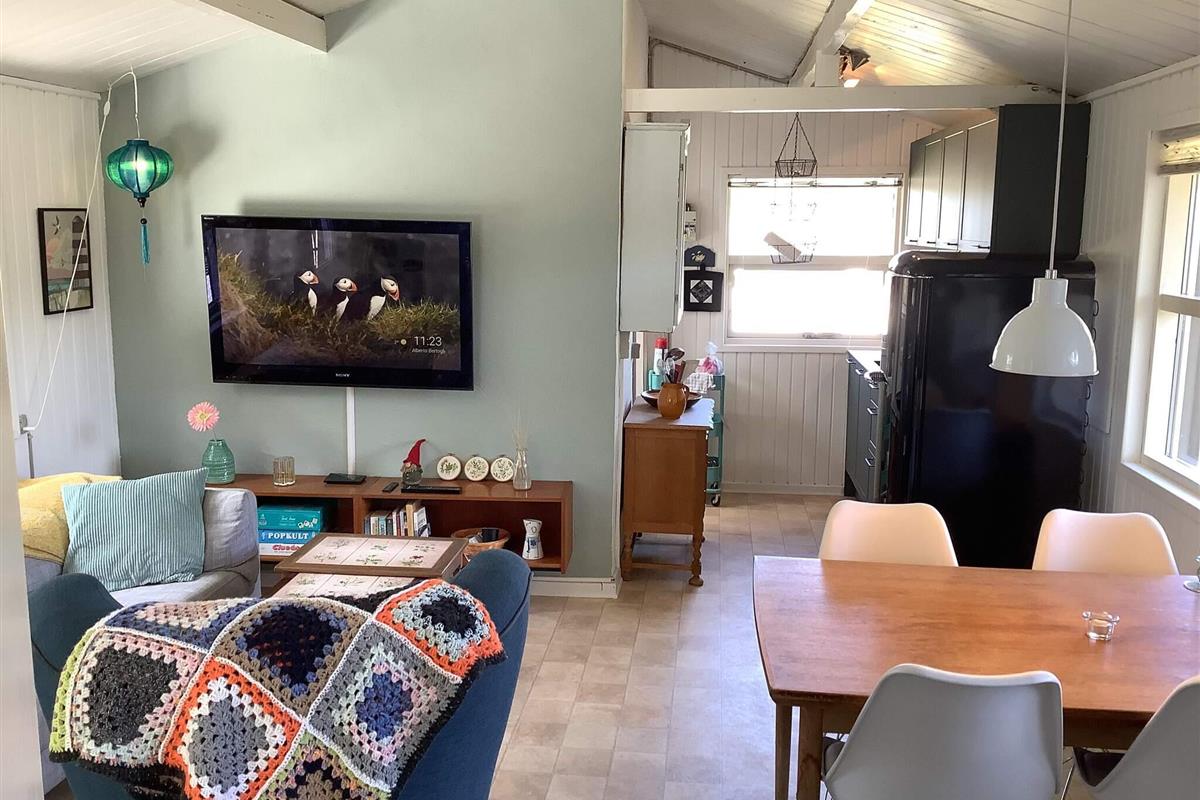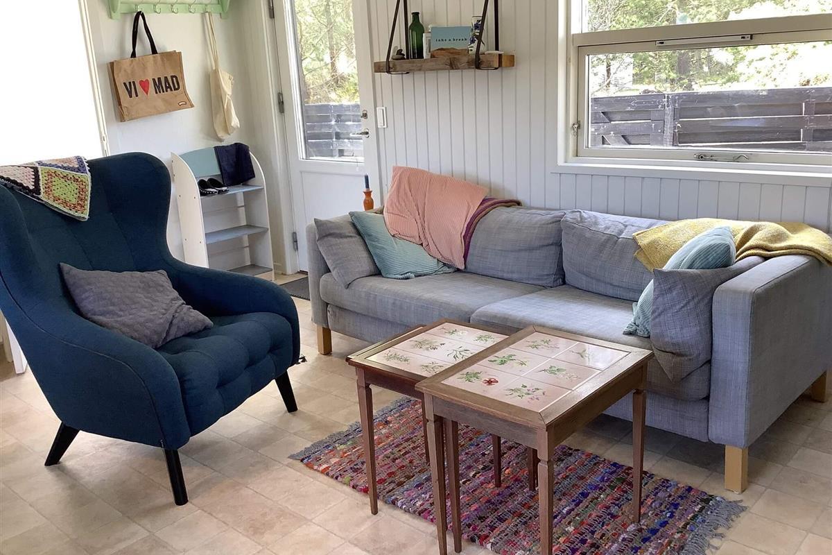 Offen kombinierter Küchen-/Wohnbereich mit Ess- und Sitzecke sowie direktem Zugang zur Terrassenfläche. Im Haus gibt es zwei Schlafzimmer mit Doppelbett. Fernsehraum mit gemütlichem Holzofen sowie klimafreundlicher Wärmepumpe. Auf der Terrasse können Sie die schönen Sommertage und -abende mit Sonne und Entspannung genießen.