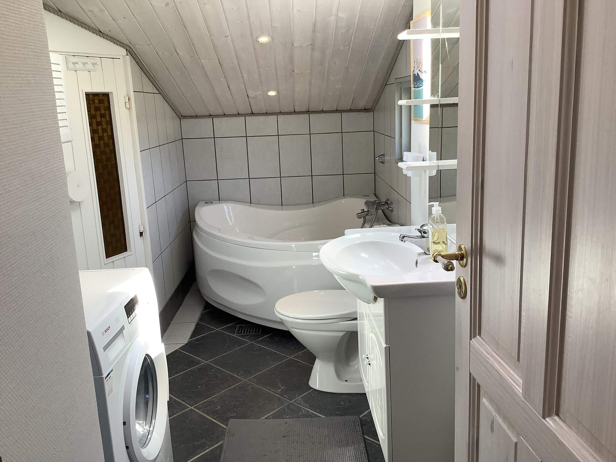 Es gibt ein Badezimmer mit einem Whirlpool für zwei Personen, einer Dusche und einer Waschmaschine.