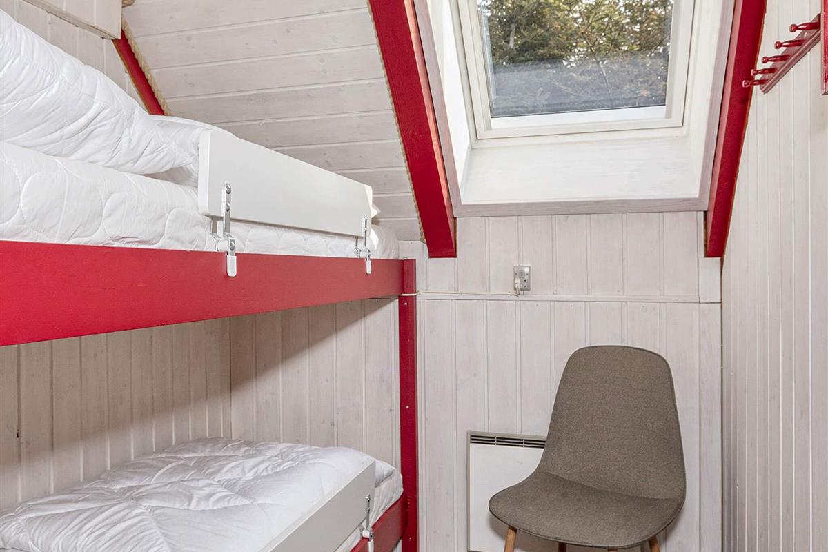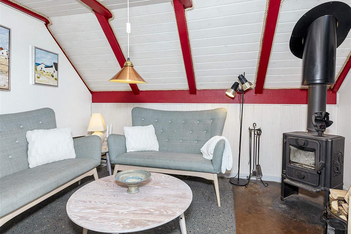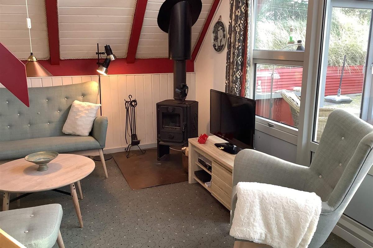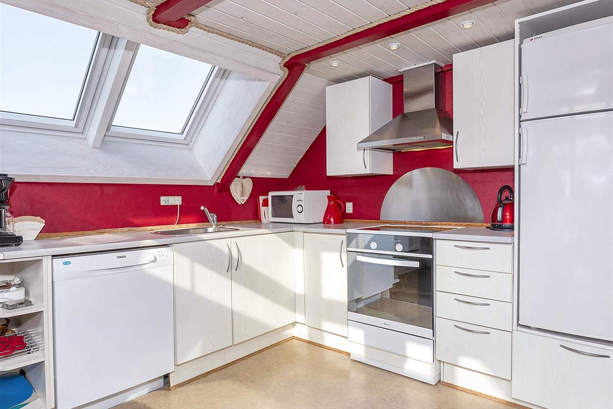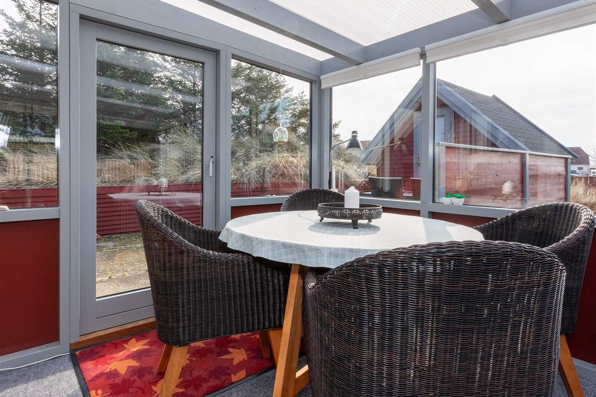 Die Küche ist gut ausgestattet, u.a. mit Induktionsherd und Spülmaschine. Die sechs Schlafplätze des Hauses verteilen sich auf ein Doppelbett und ein Etagenbett mit zwei Kojen im Erdgeschoss sowie auf zwei Einzelbetten im Dachgeschoss. Das Ferienhaus wird mit einer klimafreundlichen Wärmepumpe (auch mit Kühlfunktion für warme Tage) sowie mit einem gemütlichen Holzofen beheizt. Großer Wintergarten und Terrasse mit Gartenmöbeln.