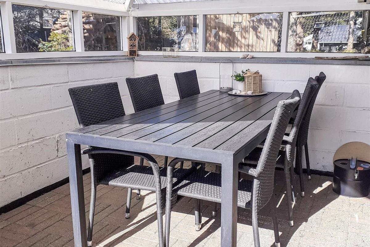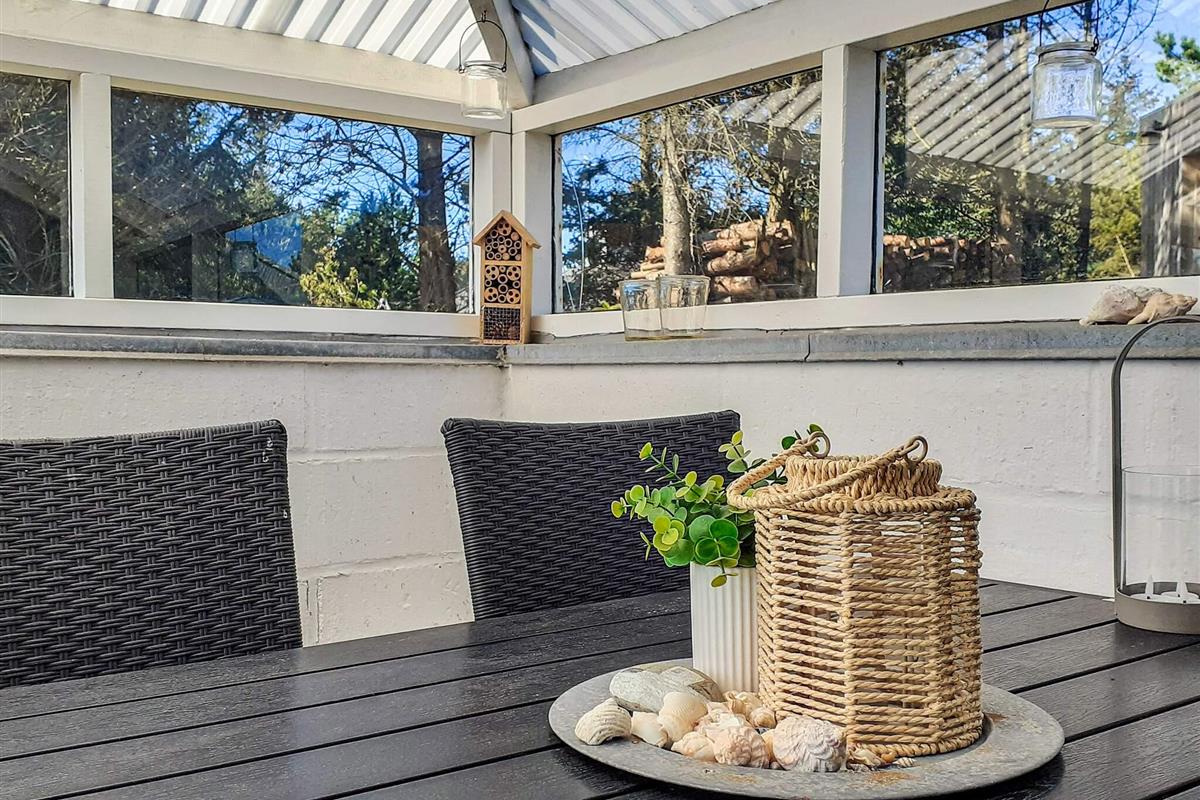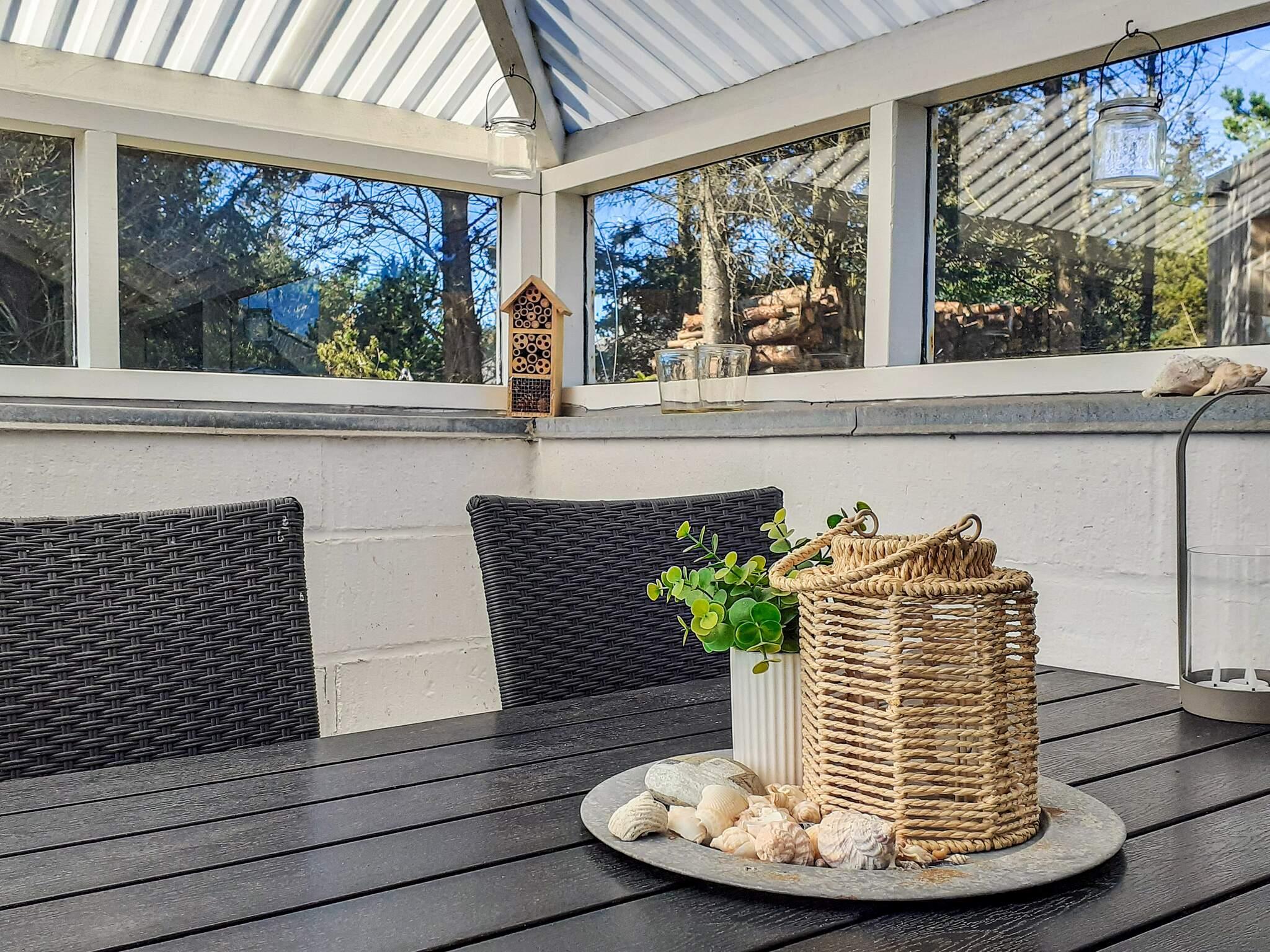 Auf der überdachten, geschlossenen Terrasse befinden sich ein Holzkohlegrill, Gartenmöbel und Sonnenliegen. Im Garten gibt es ein Wildbad für 5 Personen.