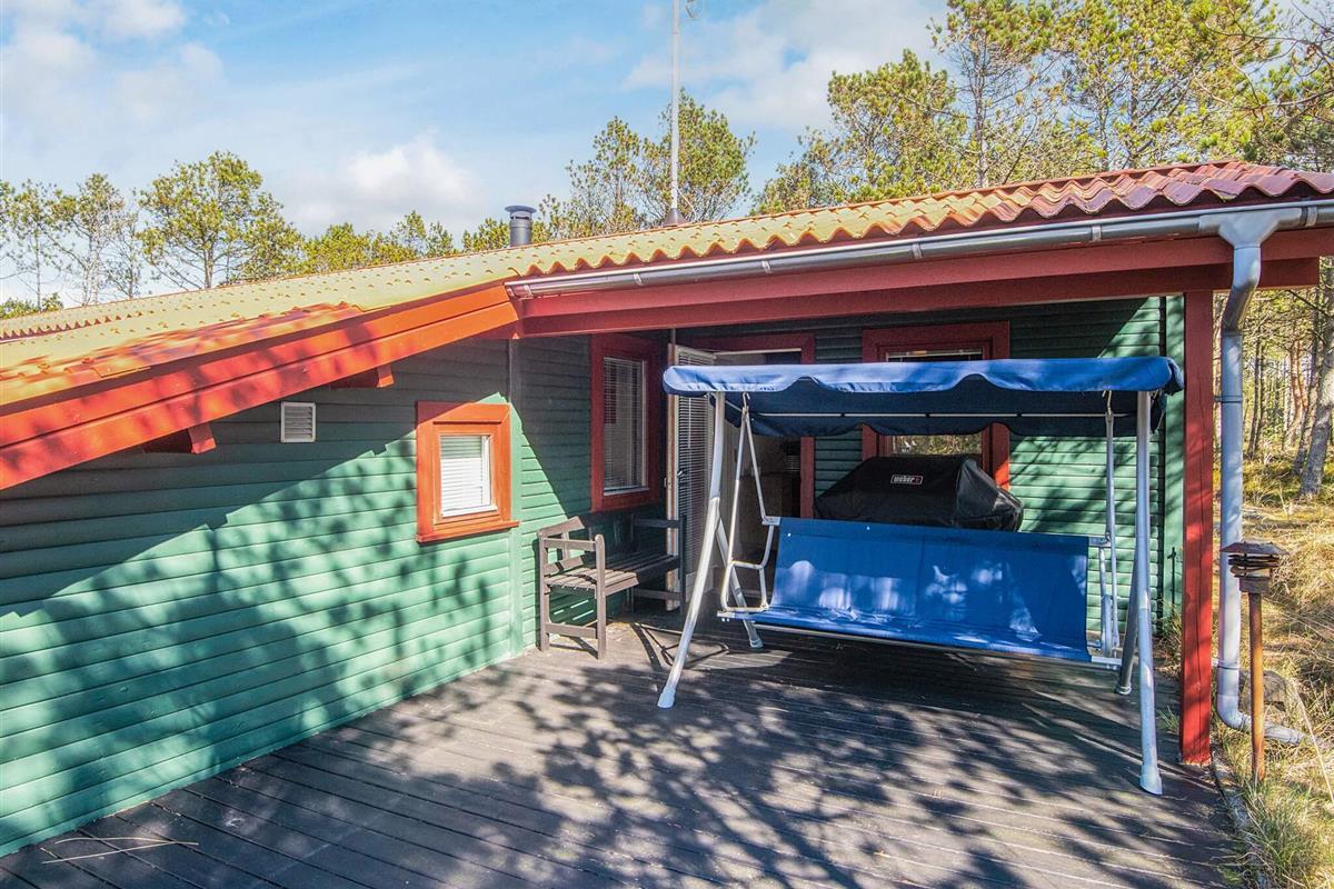 Außen gemütliche Terrasse, teilweise überdacht, mit Gartenmöbeln und Liegestühlen. Die Terrasse ist eingezäunt (für Hunde gut geeignet). Das Ferienhäuschen steht in einem traditionellen Ferienhausgebiet mit vielen Bäumen und guten Unterschlupfmöglichkeiten.