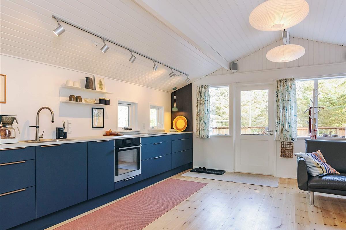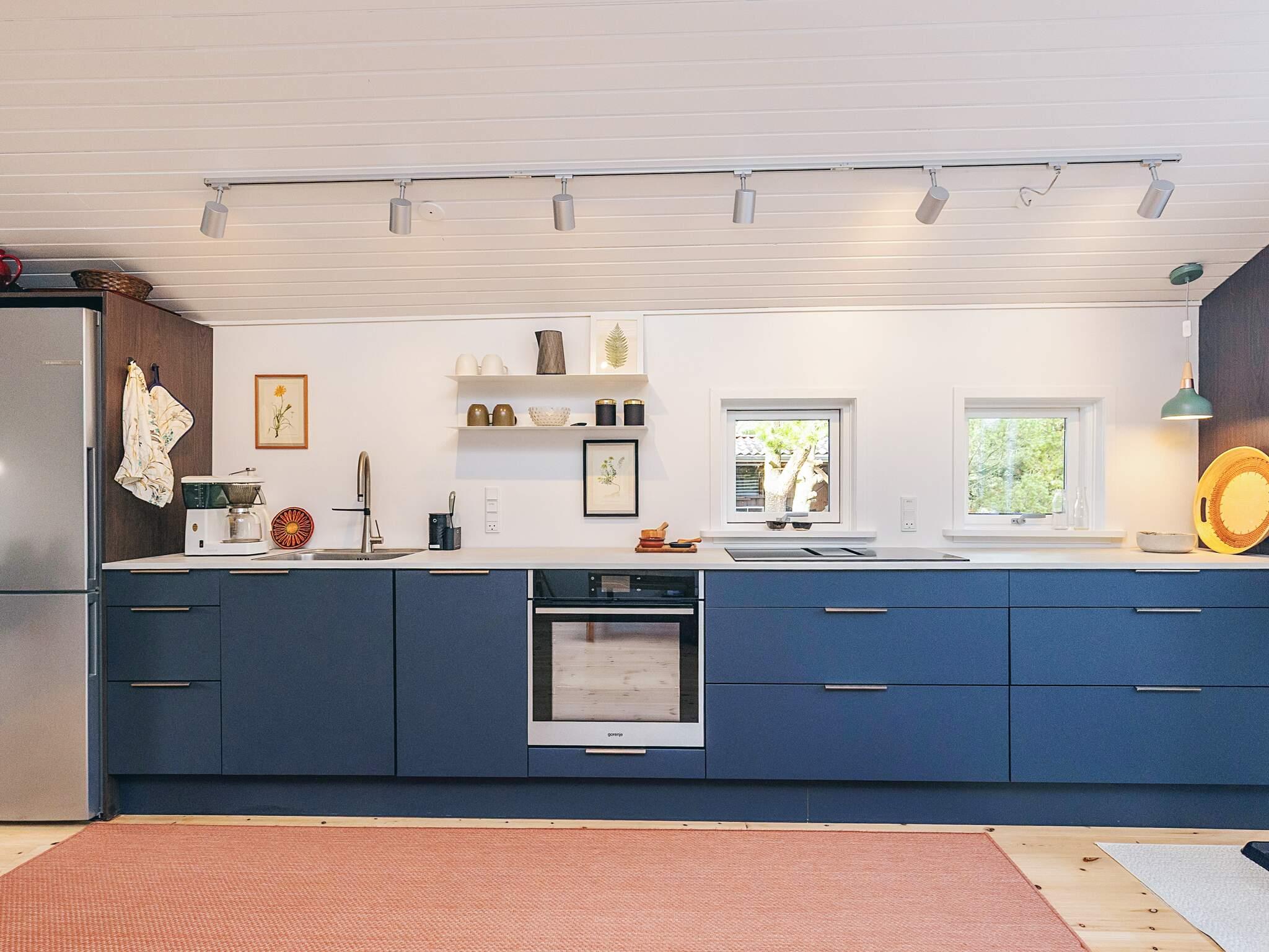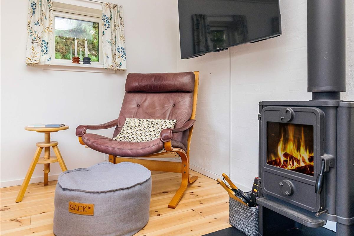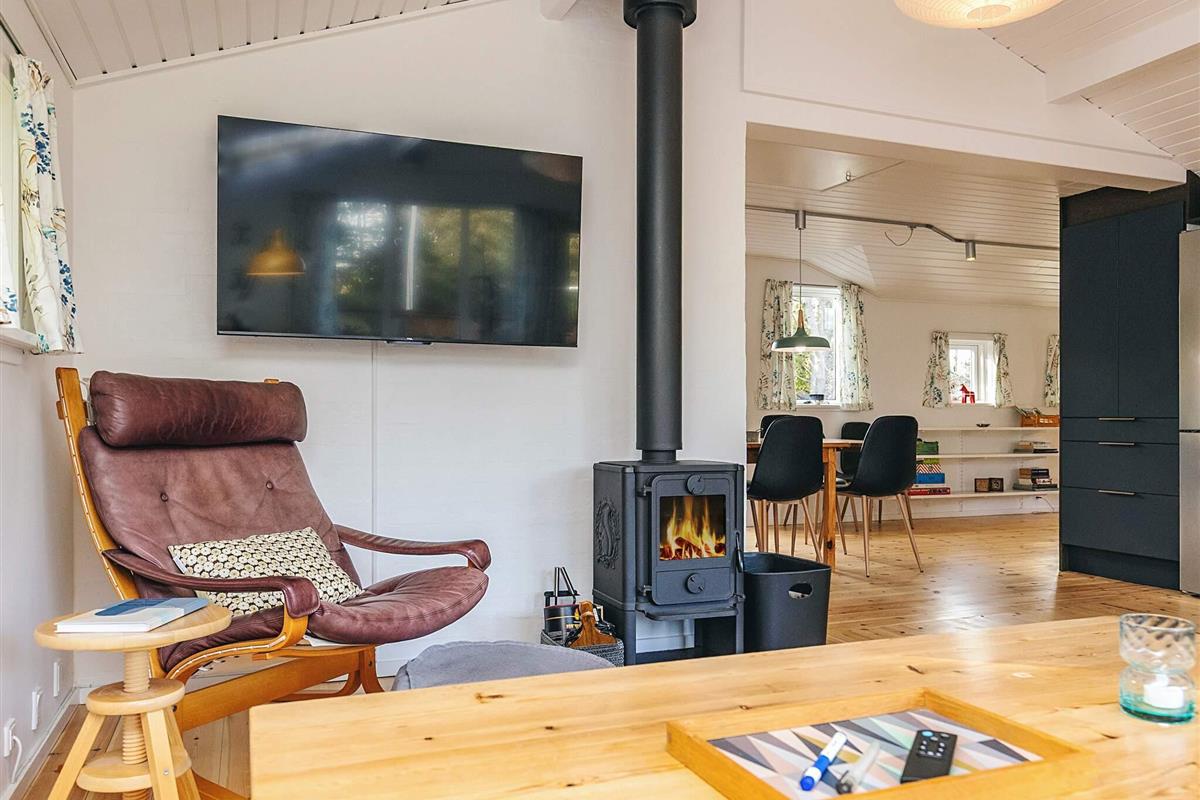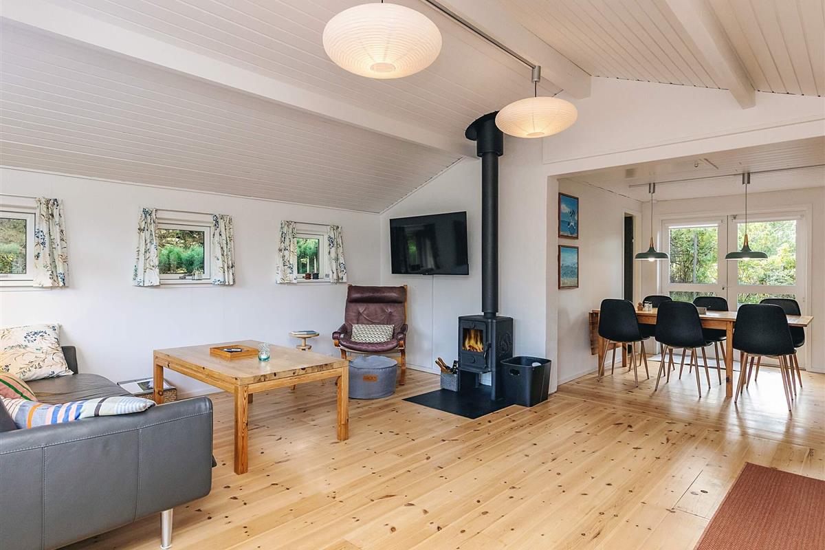 Drei Schlafzimmer mit jeweils Doppelbett bzw. 2 Einzelbetten und 2 Kojen in einem Etagenbett. Küche mit Geschirrspüler. Im Wohnzimmer gibt es Smart-TV und einen Holzofen. Auf der Terrasse, die umzäunt ist, findet man Gartenmöbel und einen Holzkohlegrill vor. Badezimmer mit WC und Dusche sowie angenehmer Fußbodenheizung.