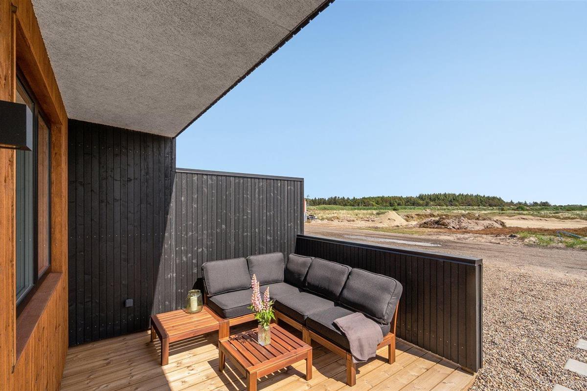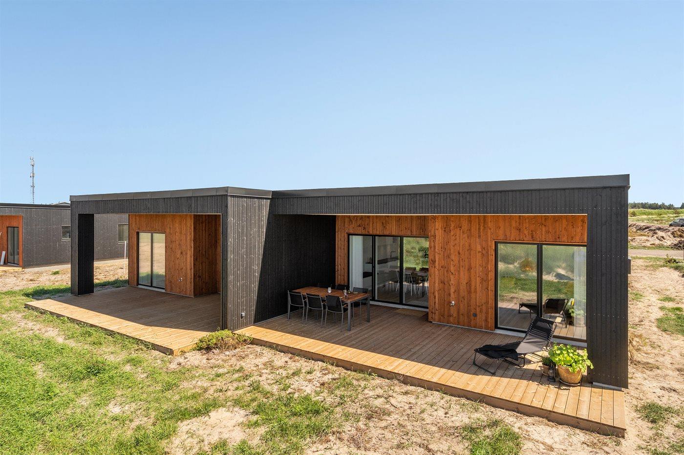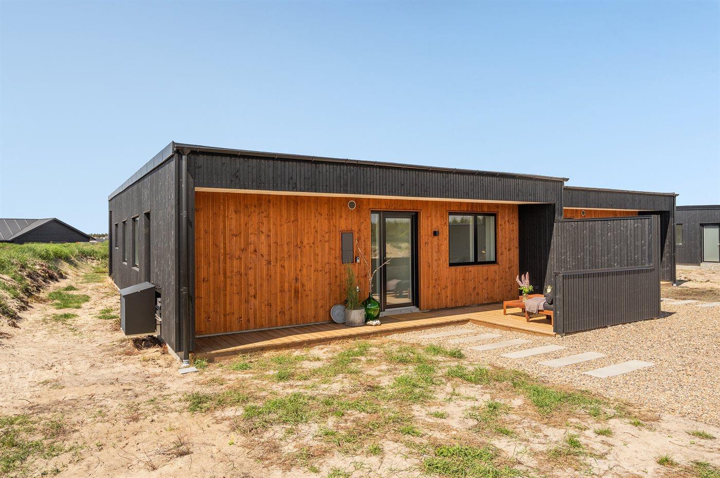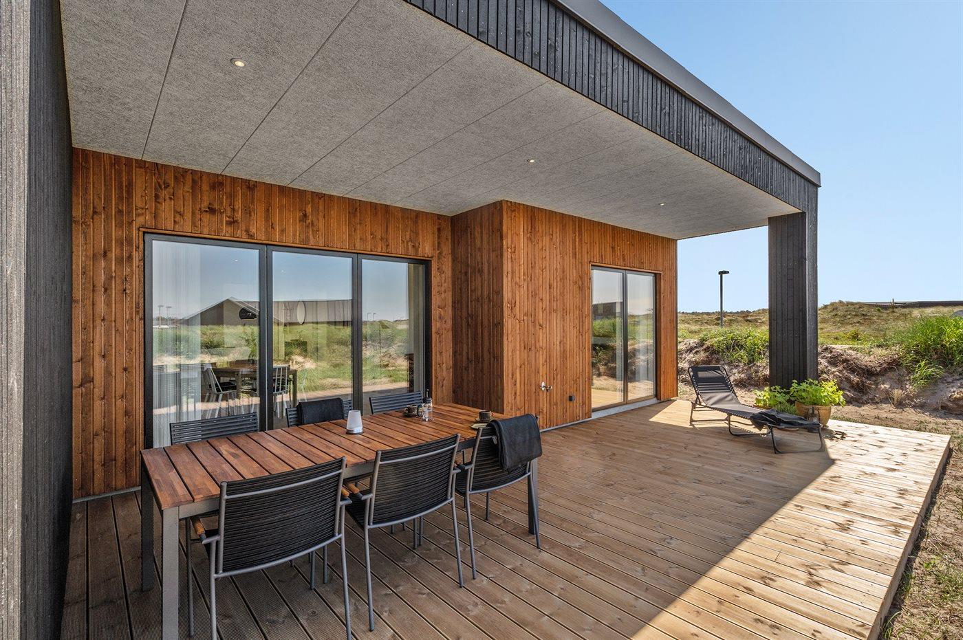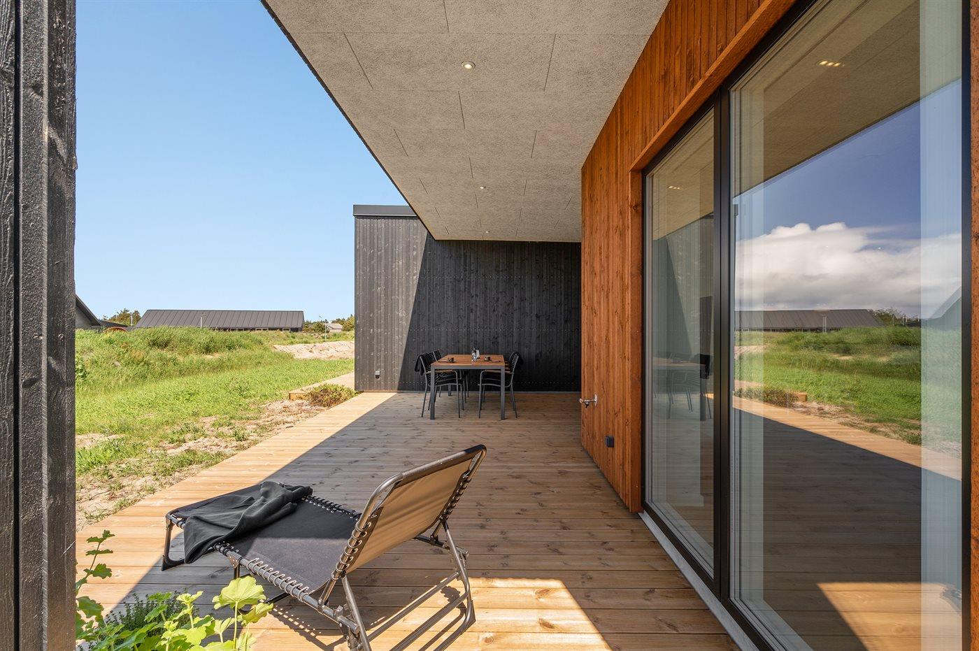 Modern vakantiehuis in Vorupør met vloerverwarming, overdekt terras en duurzame warmtepomp.