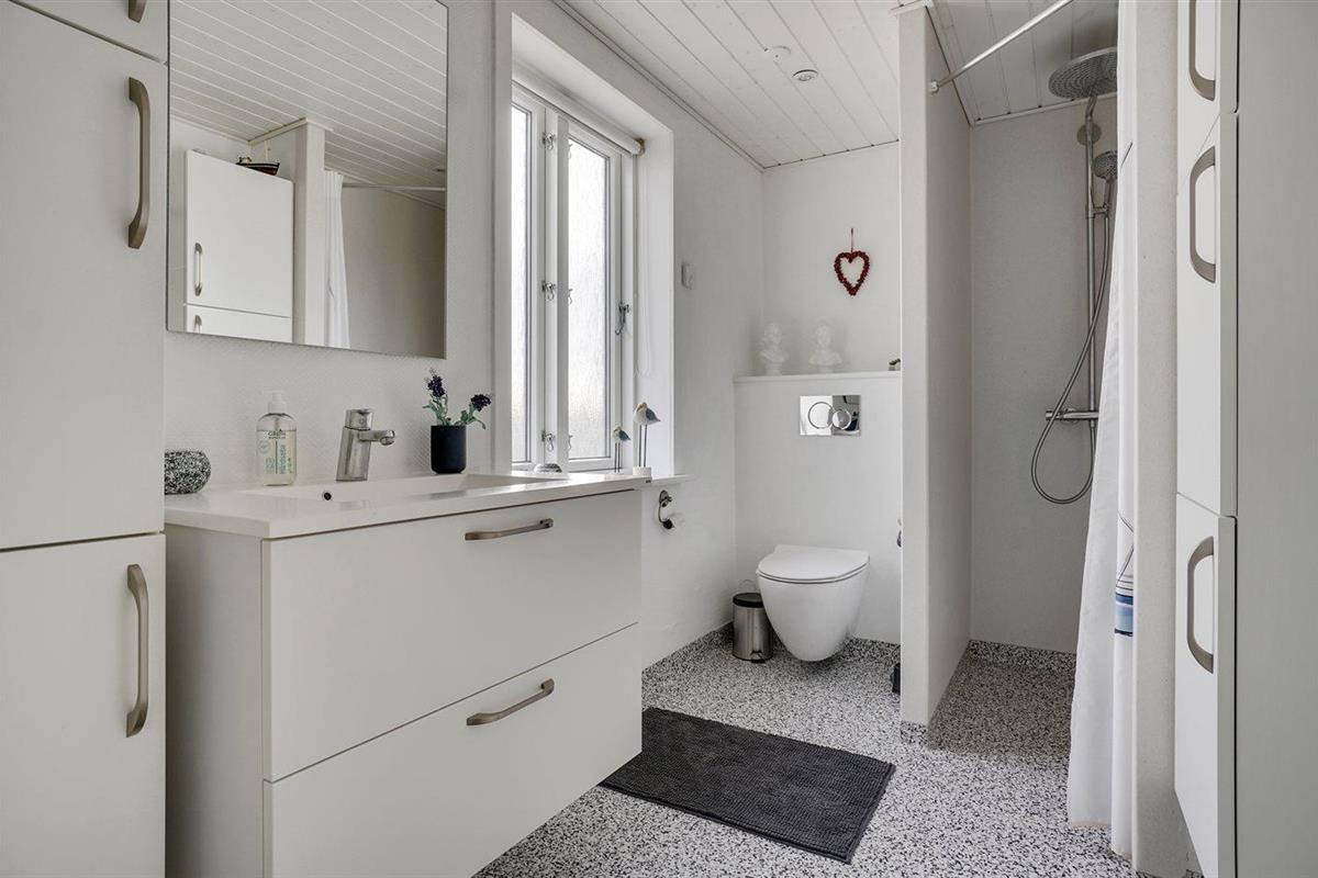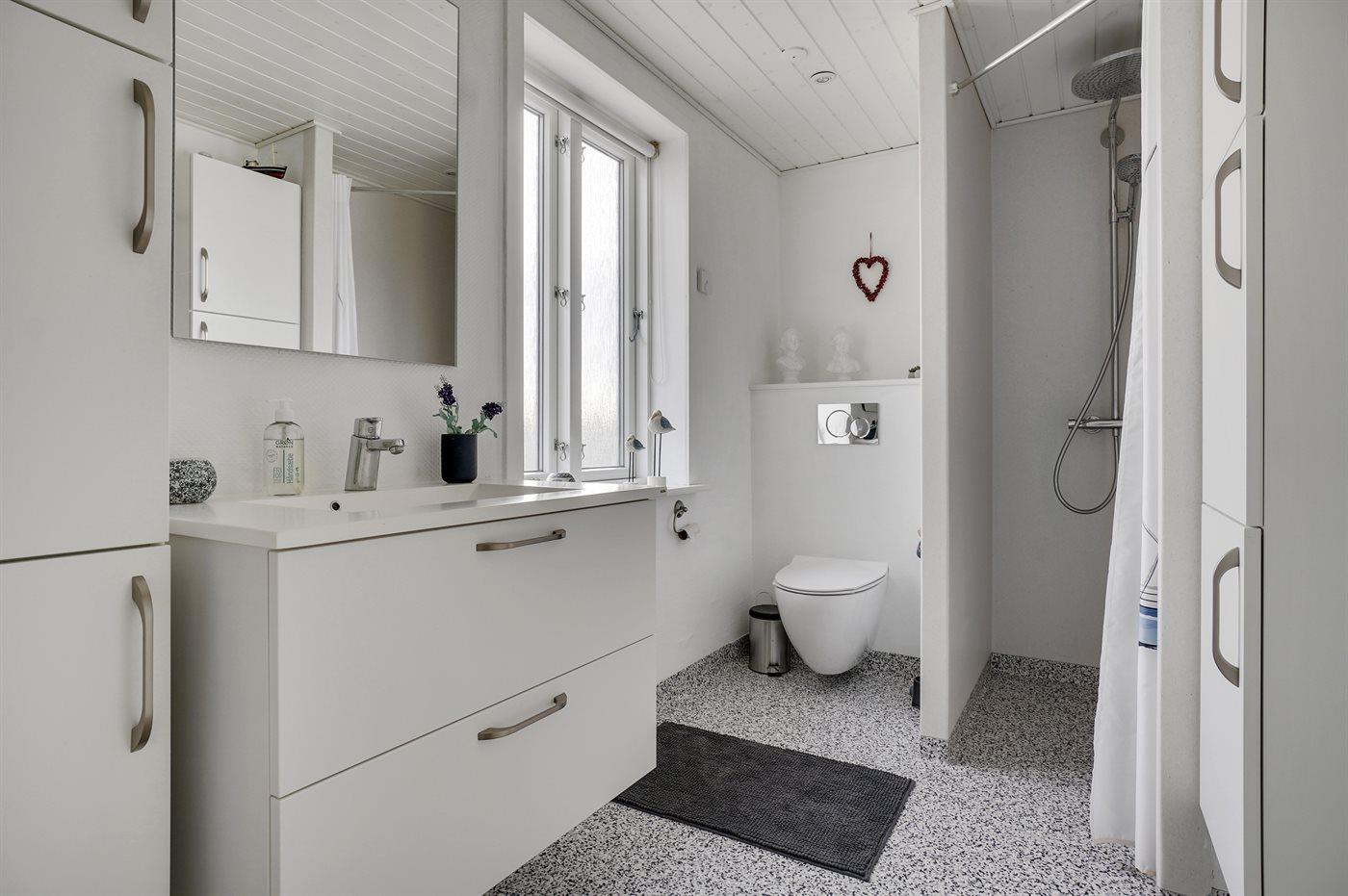 Er is 1 badkamer met douchehok en 2 toiletten, waarvan 1 gastentoilet. Er is vloerverwarming in 1 badkamer.