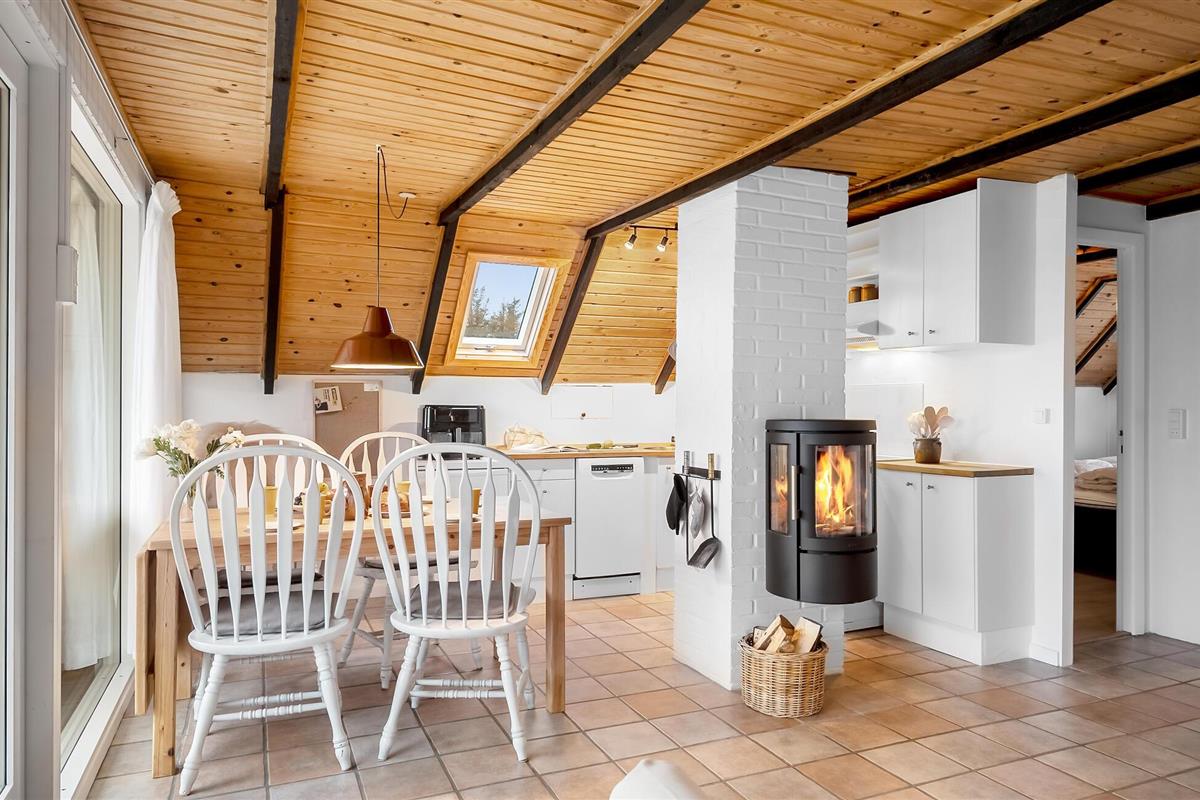 Stap binnen en geniet van de open woonkamer met zijn lichtgekleurde houten plafonds en opvallende balken die de ruimte structuur geven. Neem plaats aan de eettafel met uitzicht op de duinen en gebruik de praktisch ingerichte keuken om samen je maaltijden te bereiden. De houtkachel zorgt voor gezellige warmte op kille dagen, terwijl de knusse zithoek met bank en fauteuils ruimte biedt voor ontspannen uurtjes. Bekijk het betoverende landschap door de grote ramen en maak het jezelf gemakkelijk terwijl je leest of spelletjes speelt.
